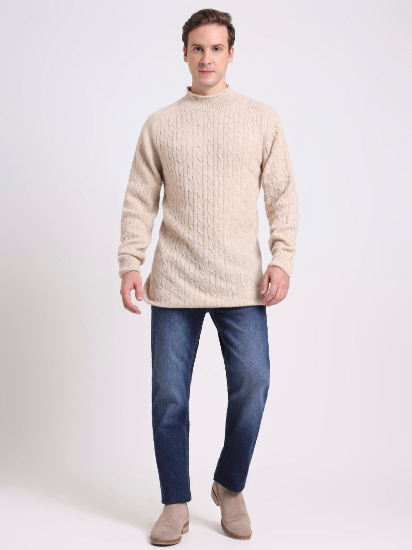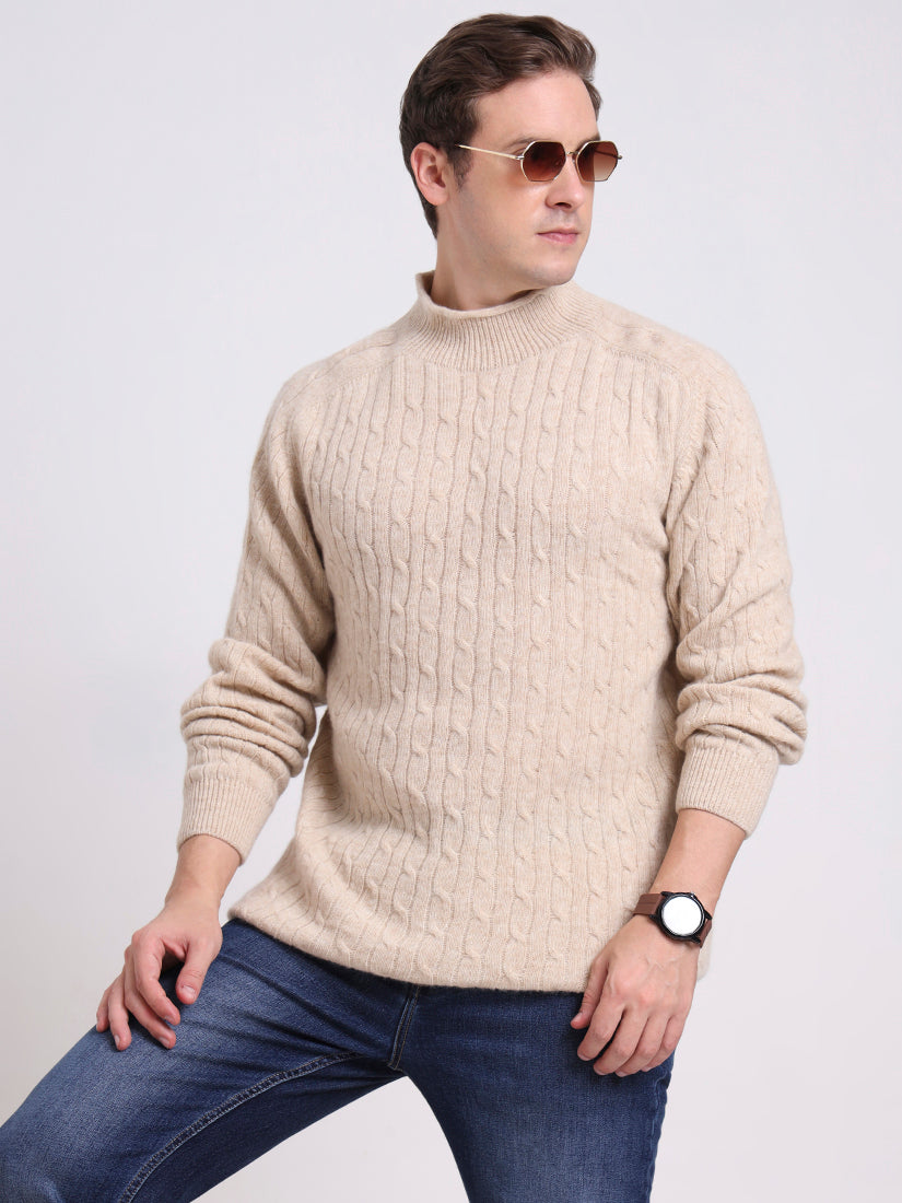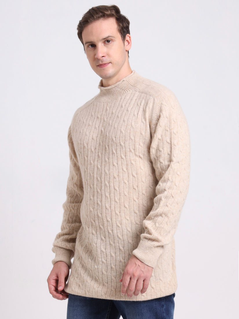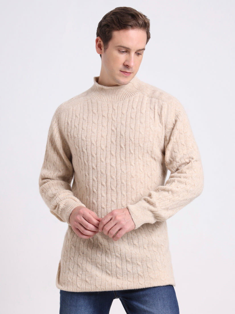 A soft ivory shade reminiscent of winter snowfall, woven into textured cables with a subtle high neck. Effortlessly versatile, it offers both warmth and a distinguished elegance for city or alpine escapes.