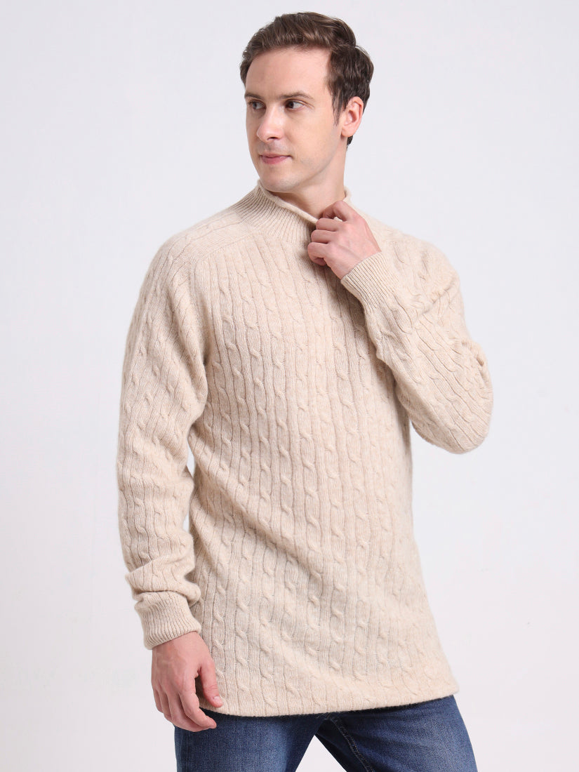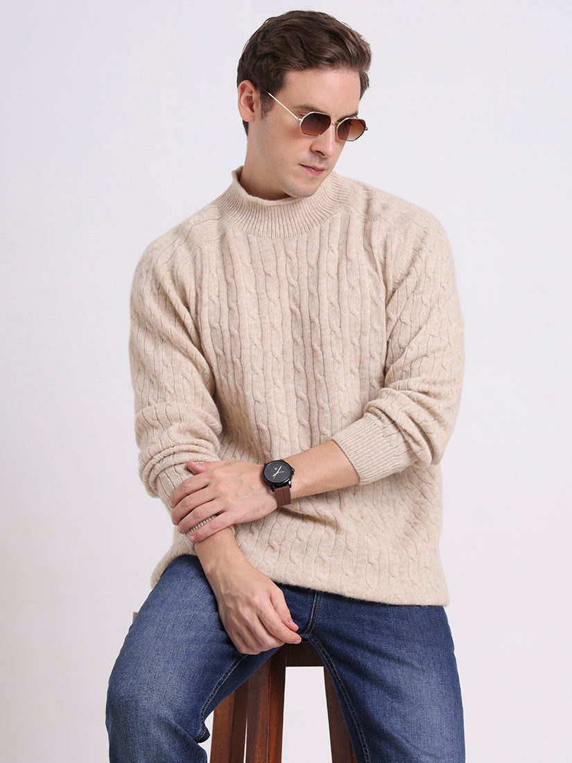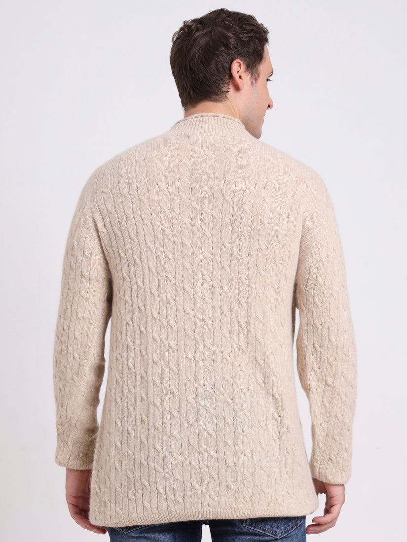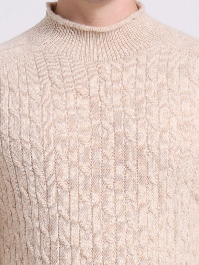 A soft ivory shade reminiscent of winter snowfall, woven into textured cables with a subtle high neck. Effortlessly versatile, it offers both warmth and a distinguished elegance for city or alpine escapes.