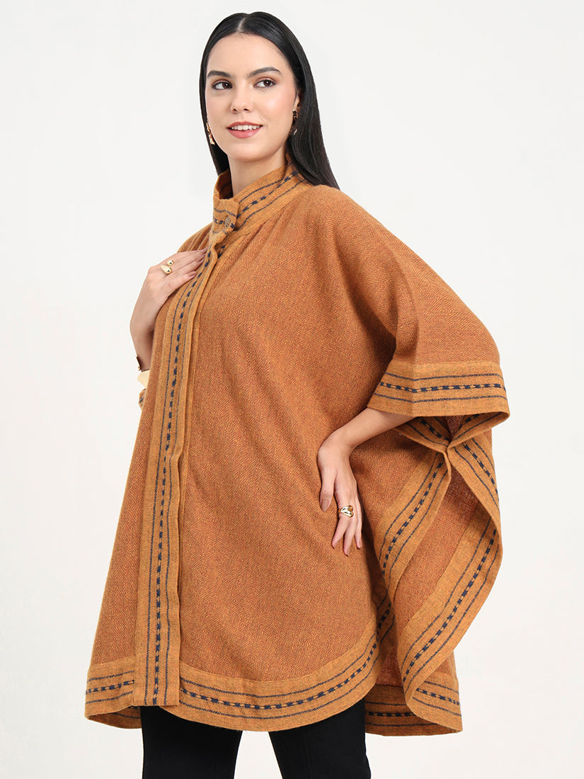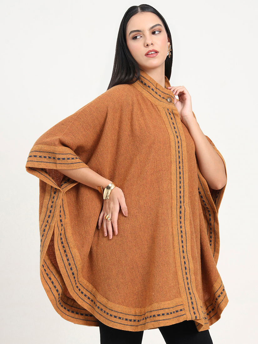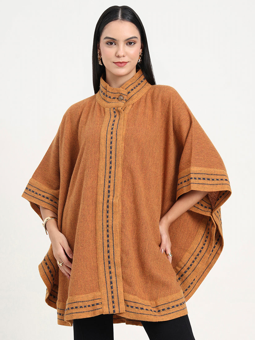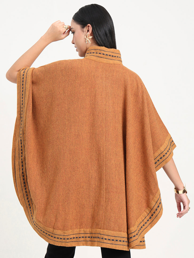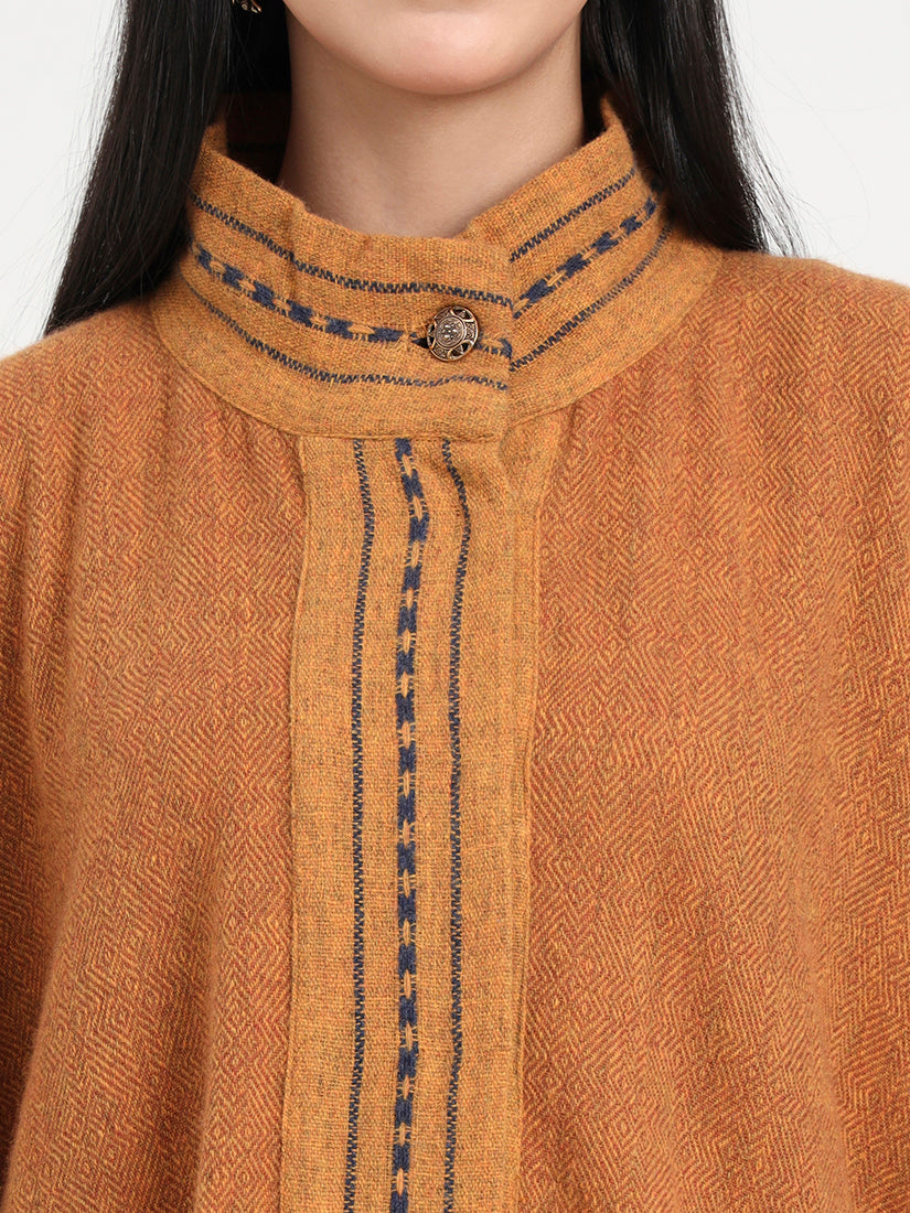 The Amber Forge Cape is hand-woven in rich lambswool, pairing deep amber hues with subtle navy accents. Bold yet timeless, it reflects the spirit of heritage craftsmanship elevated with modern polish.