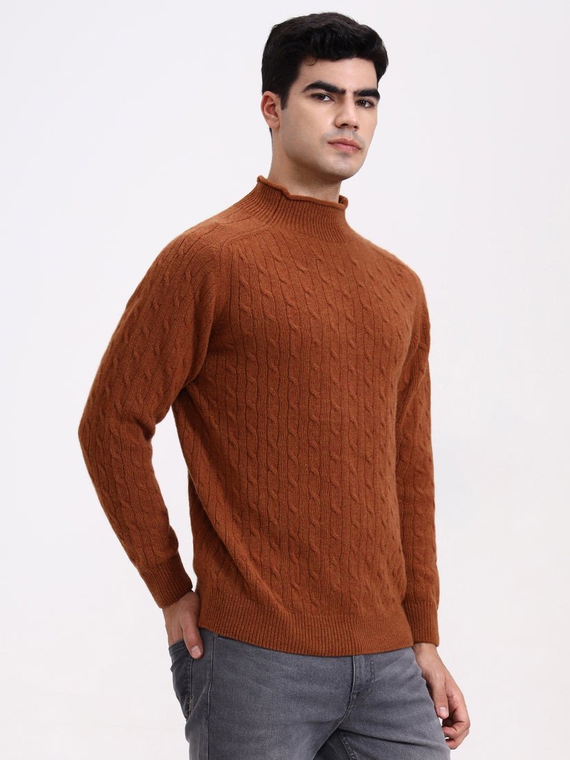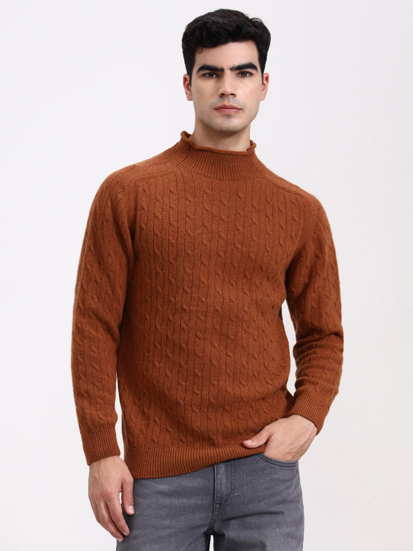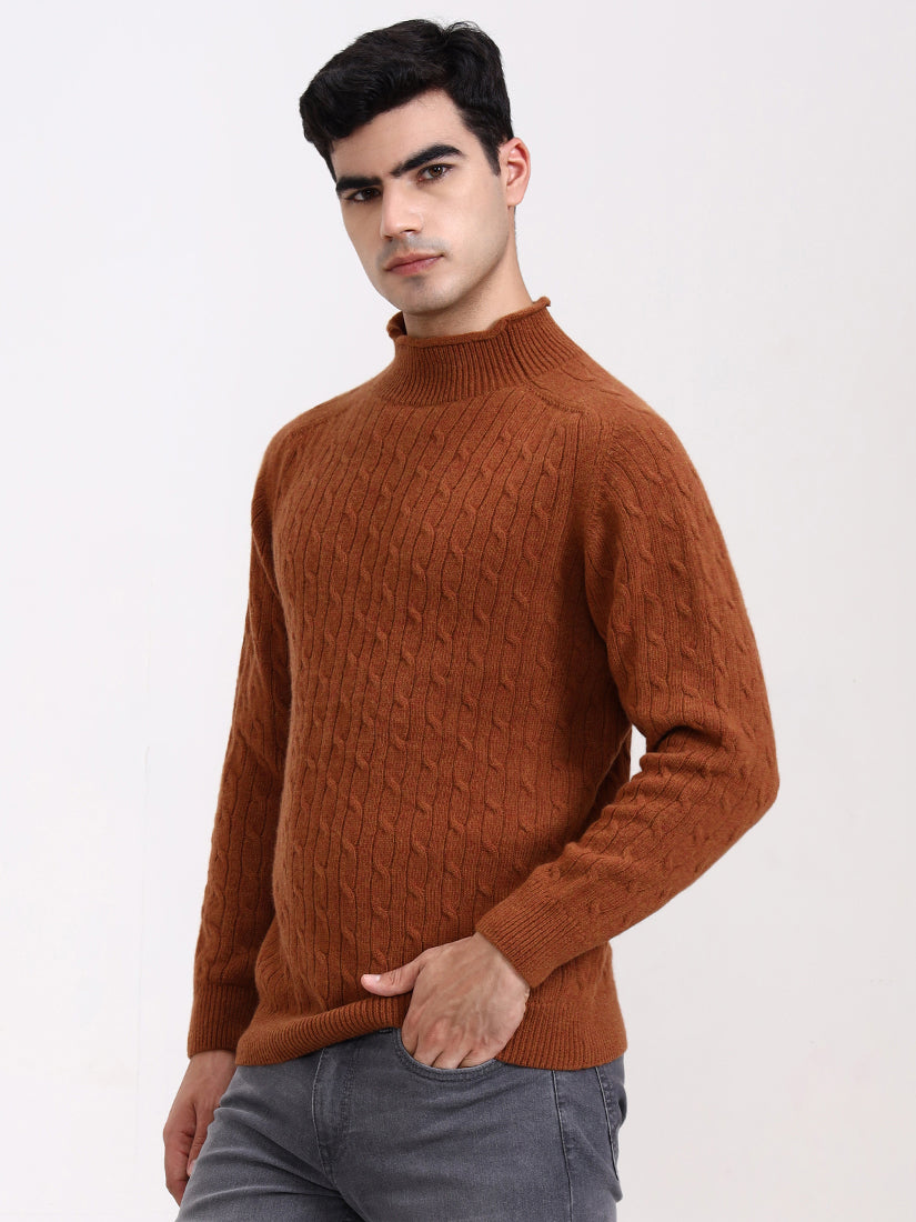 A warm amber-brown echoing crisp autumn evenings. The cable work adds dimension while the gentle high neck provides a modern, luxurious edge to a seasonal favorite.