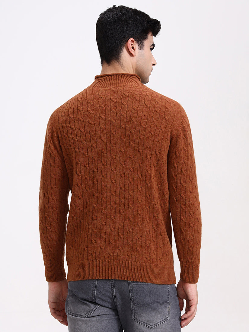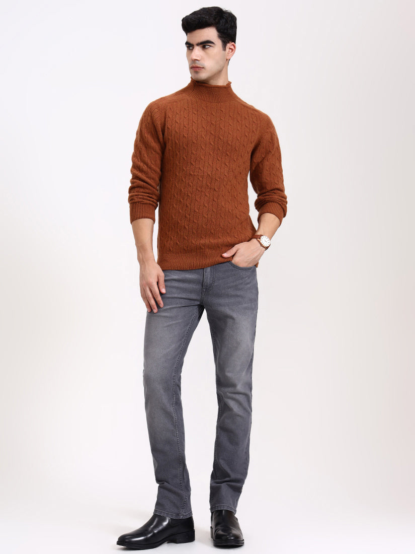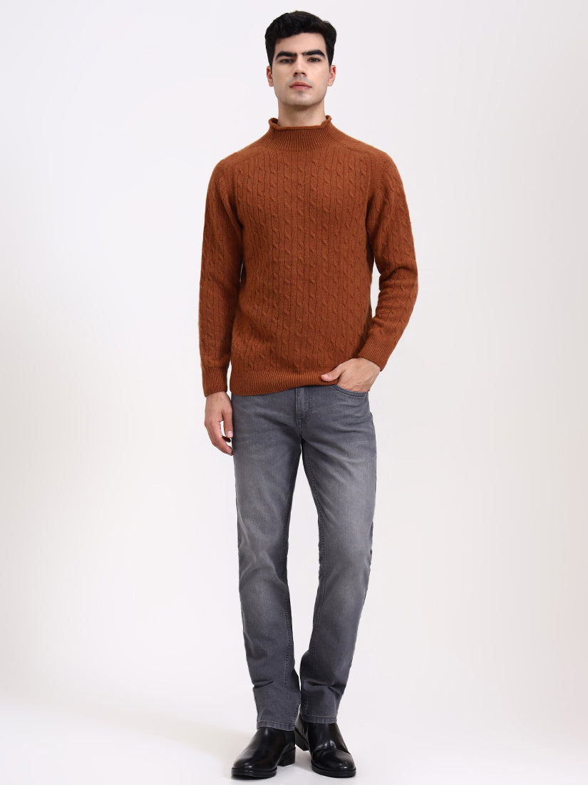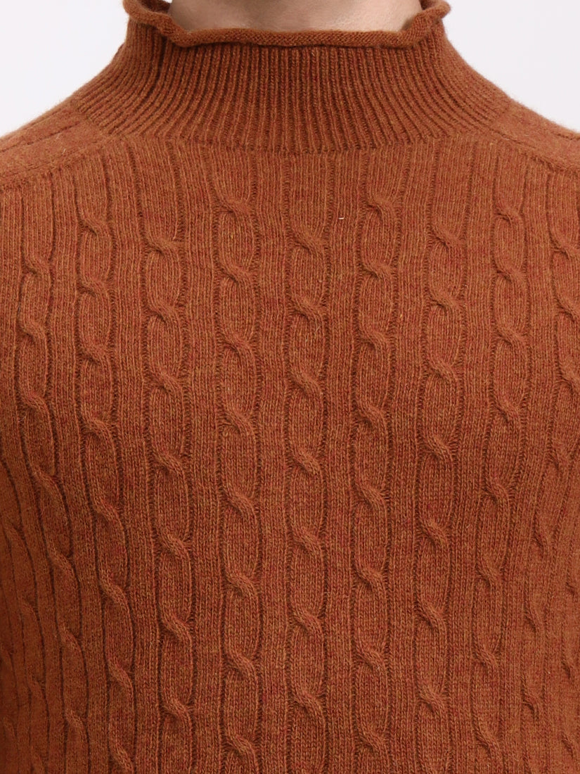 A warm amber-brown echoing crisp autumn evenings. The cable work adds dimension while the gentle high neck provides a modern, luxurious edge to a seasonal favorite.
