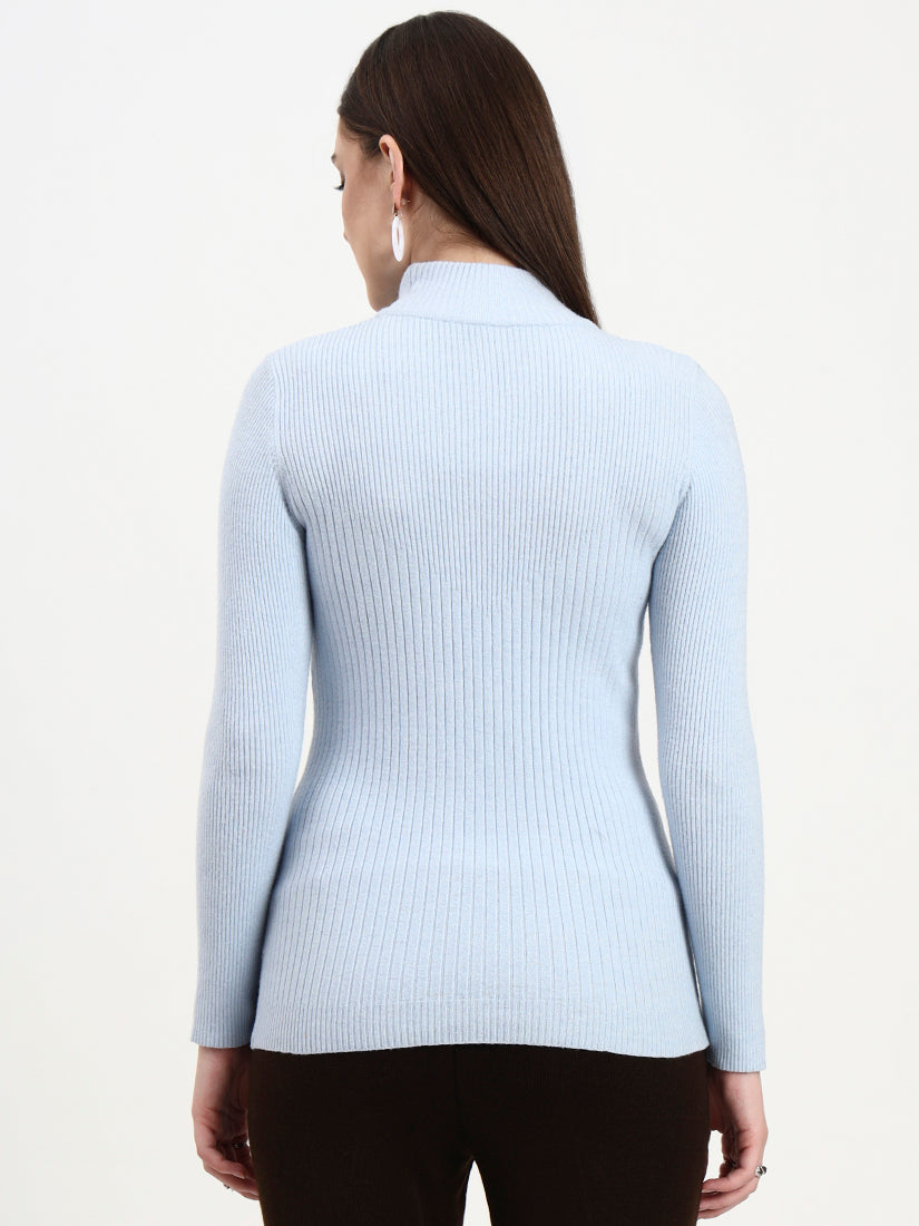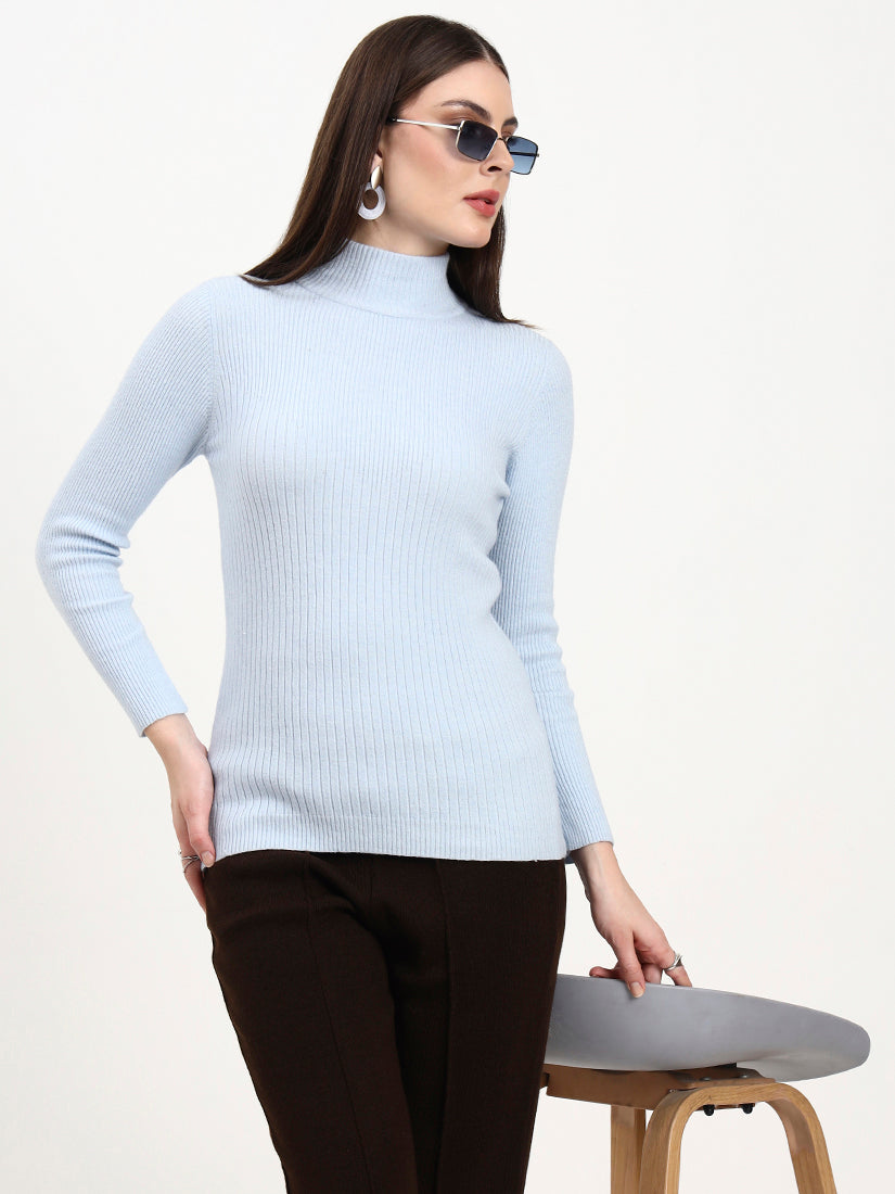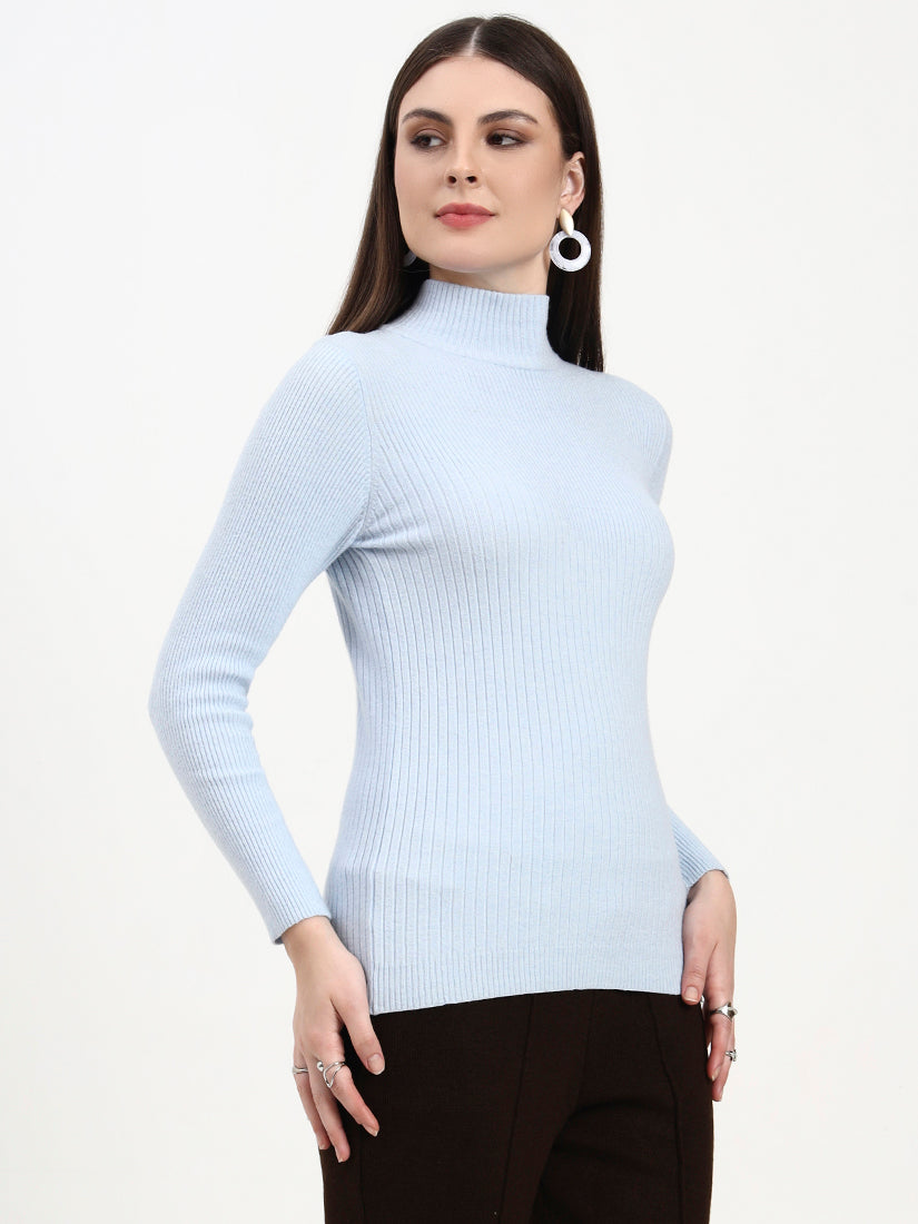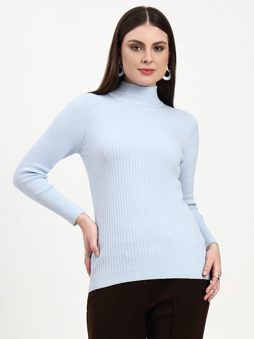 Softly structured and endlessly refined, this ribbed skivi blends warmth with grace. The powder-blue hue brings a touch of calm luxury, while the fine wool knit flatters with natural stretch and a gentle, sculpted fit. Designed to layer with elegance through the season.