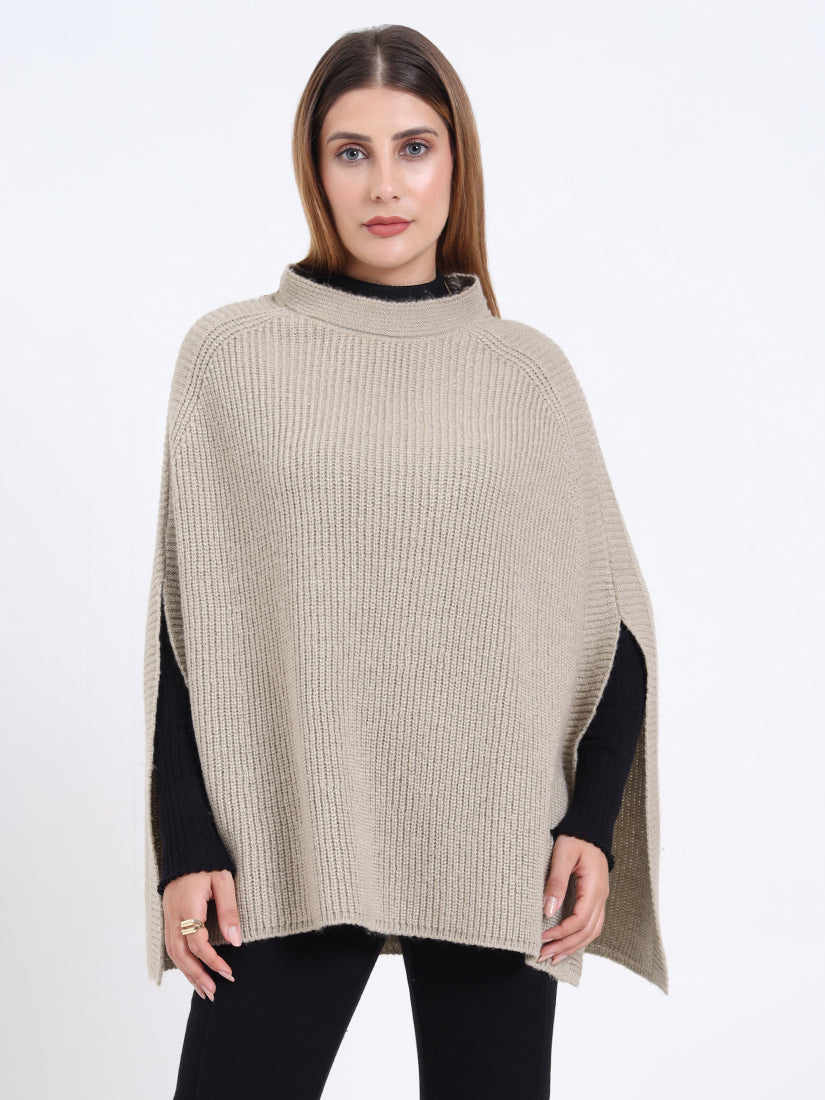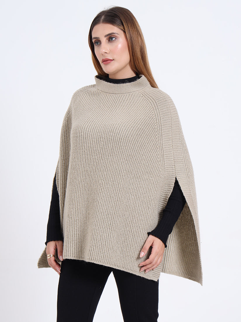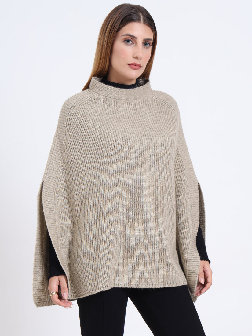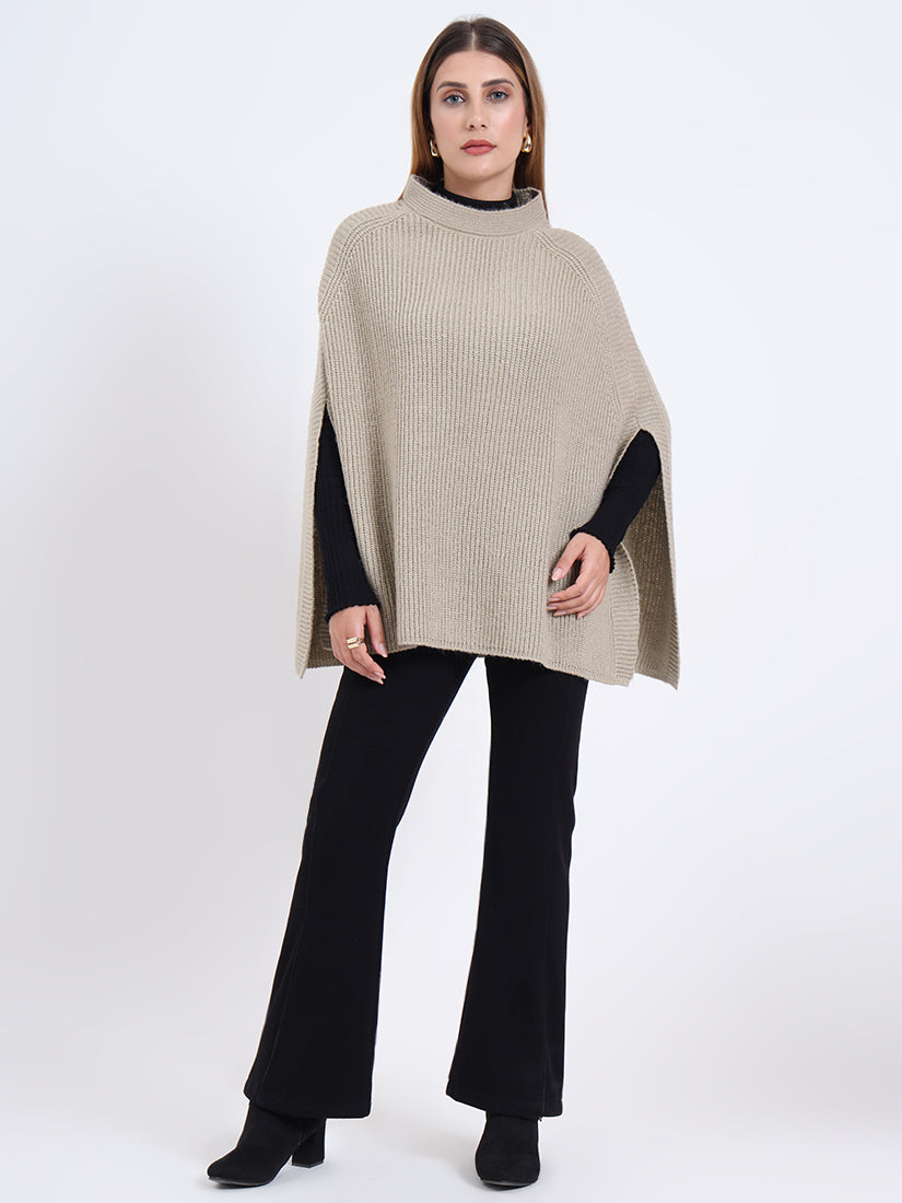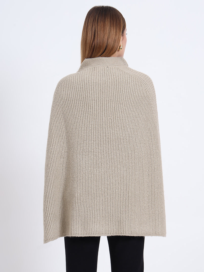 A canvas of warmth, its beige tones are woven with delicate shimmer that catches the light subtly. The cable-knit detailing adds depth, offering sophistication without excess.