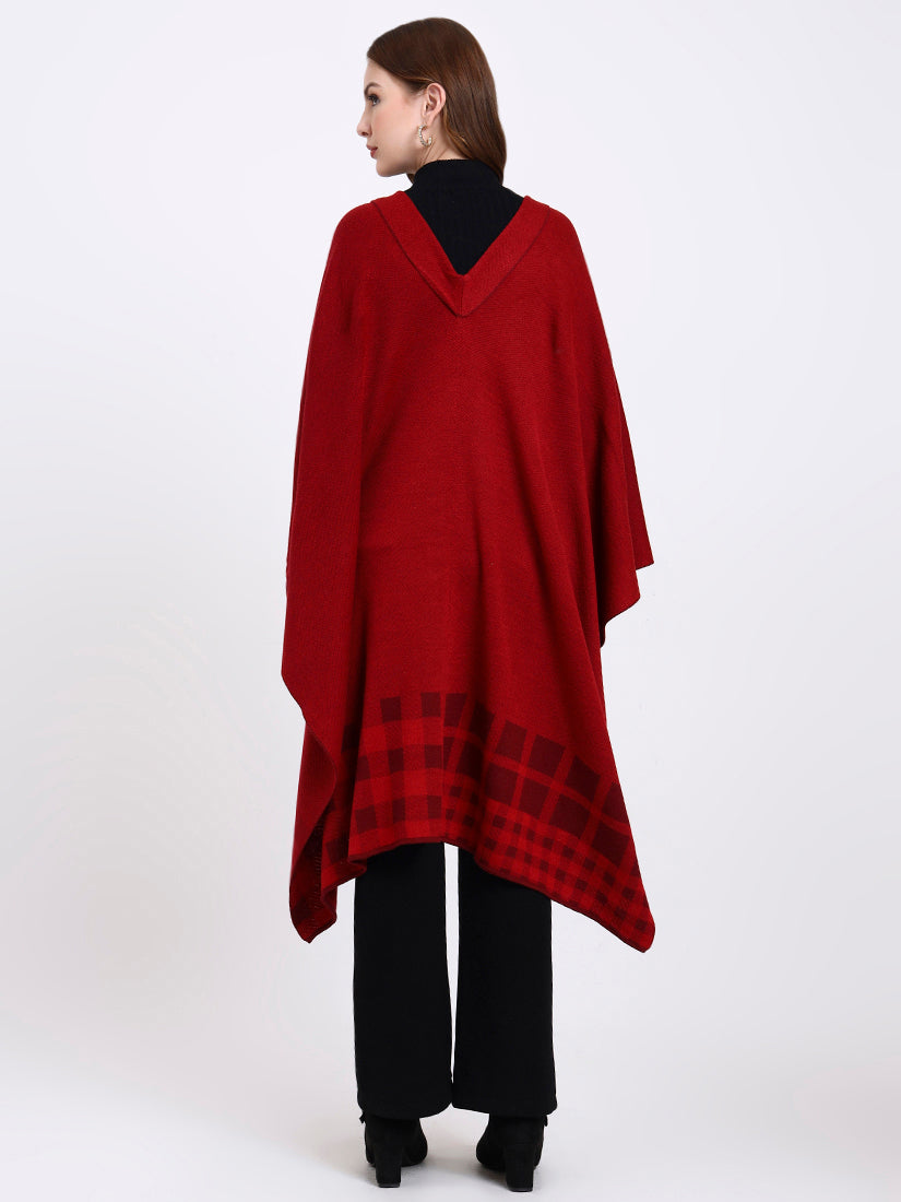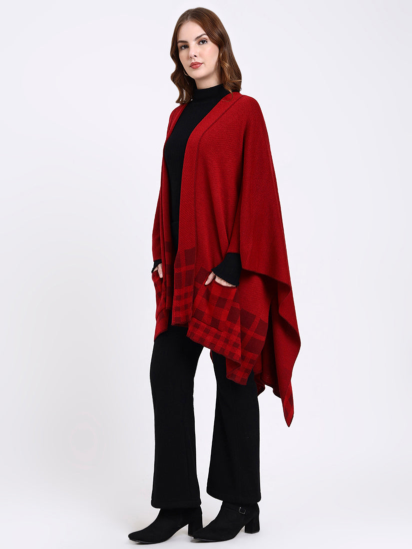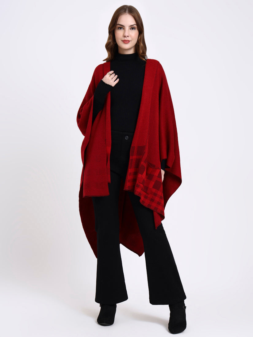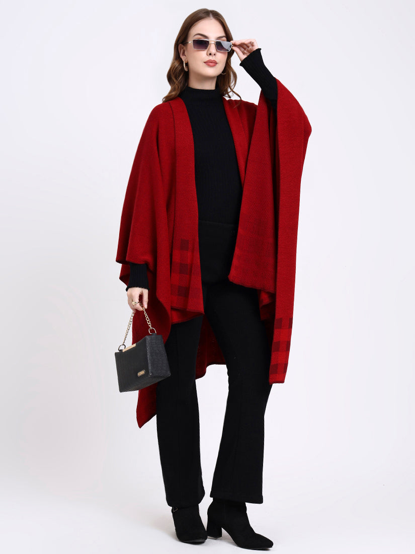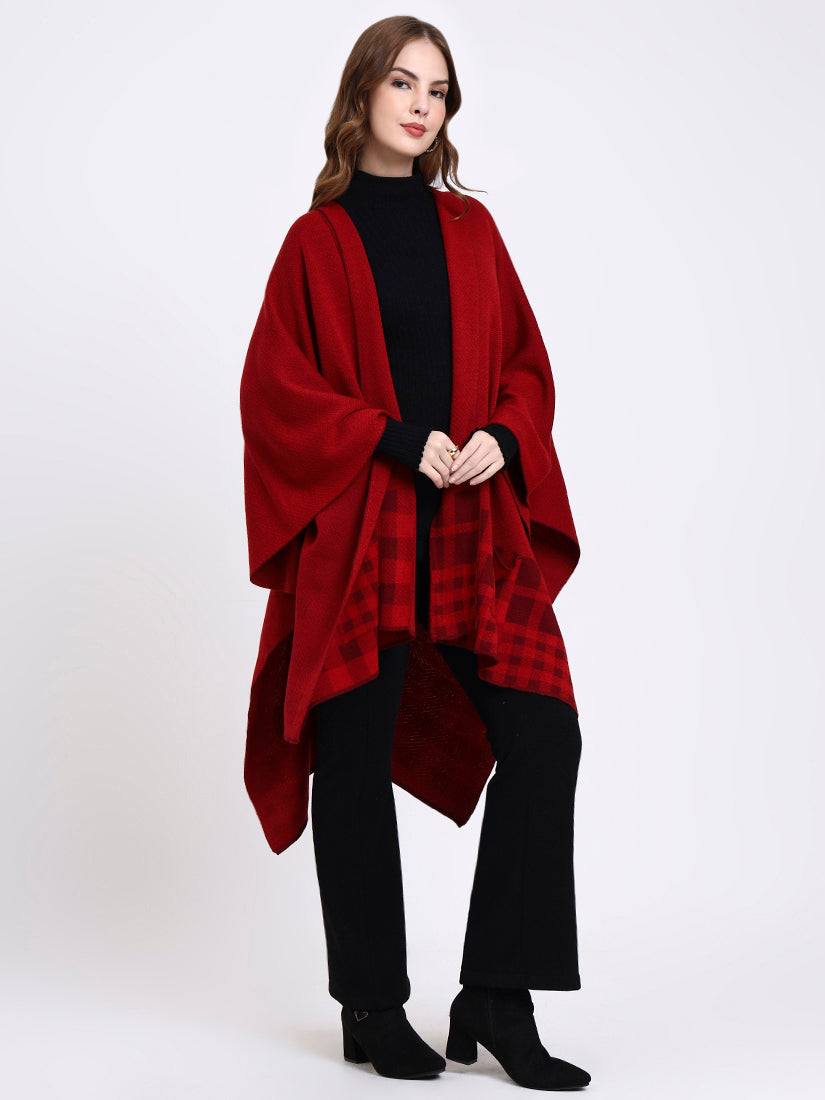The Bordeaux Glen Cape combines deep maroon tones with understated check detailing at the base, creating a rich yet versatile piece. Its subtle pocket accents add functionality while maintaining effortless elegance for city evenings and weekend escapes alike.