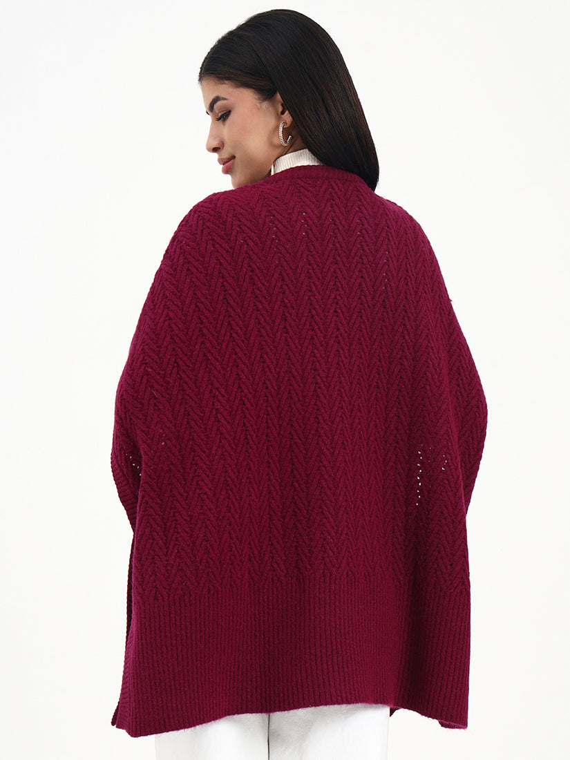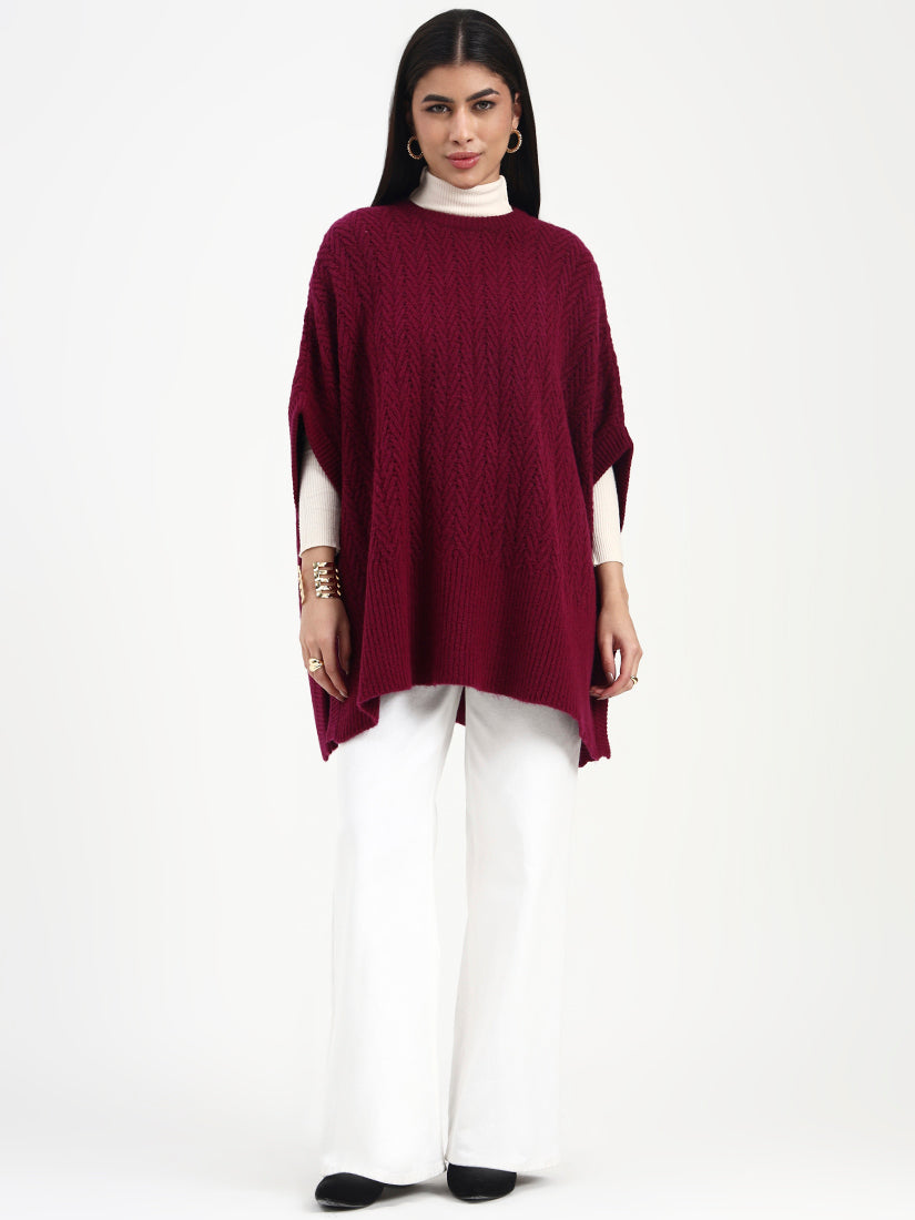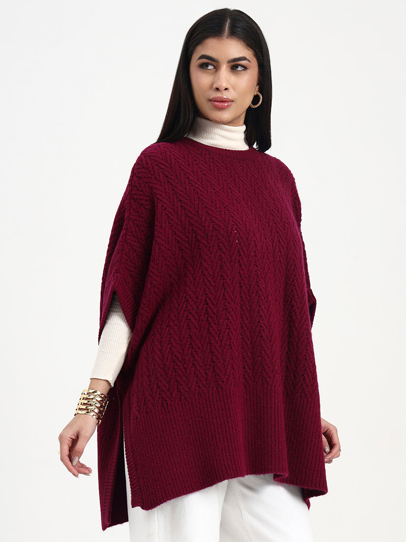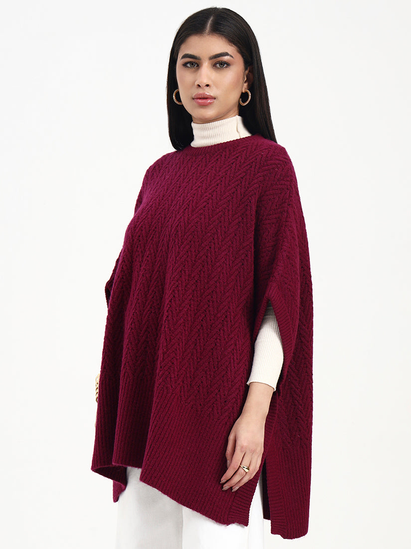 Crafted in a softly dimensional loop knit, this poncho offers gentle texture with a fluid, relaxed drape. The clean neckline and easy silhouette allow for effortless layering, while the rich burgundy tone adds depth and warmth. Designed for understated elegance, it transitions seamlessly from daytime comfort to evening refinement.