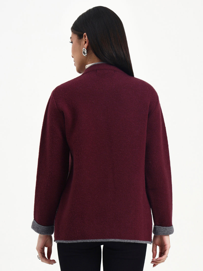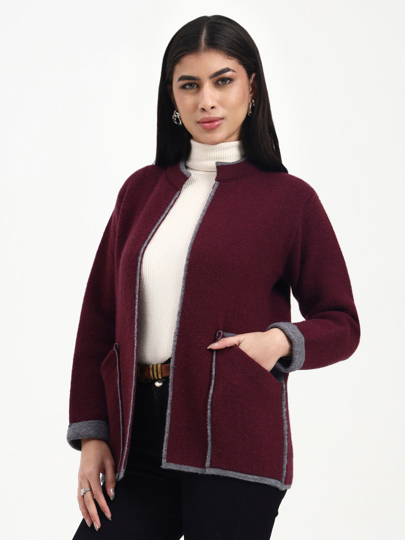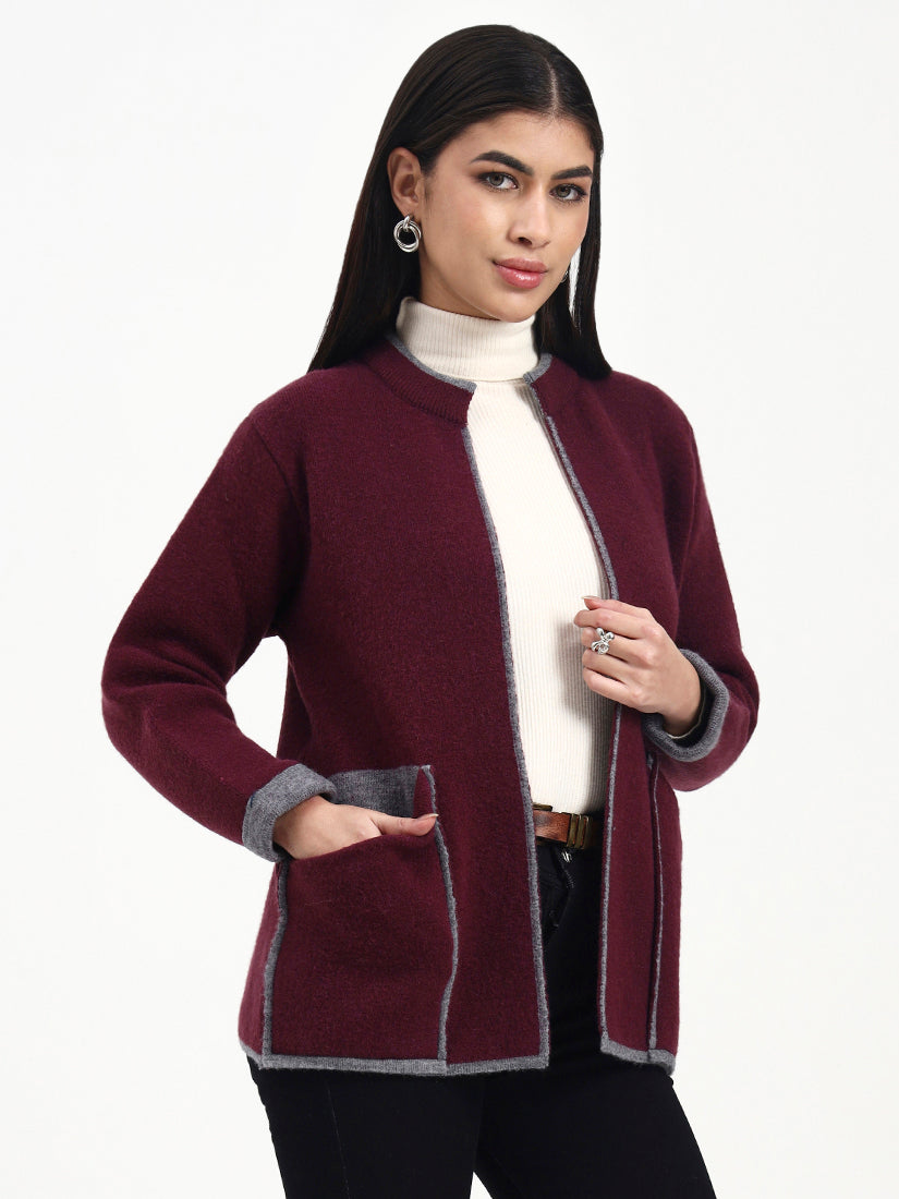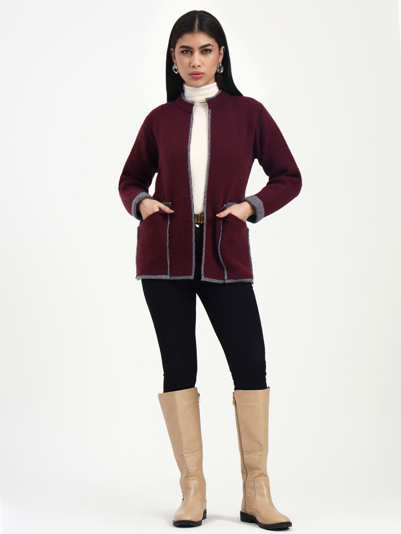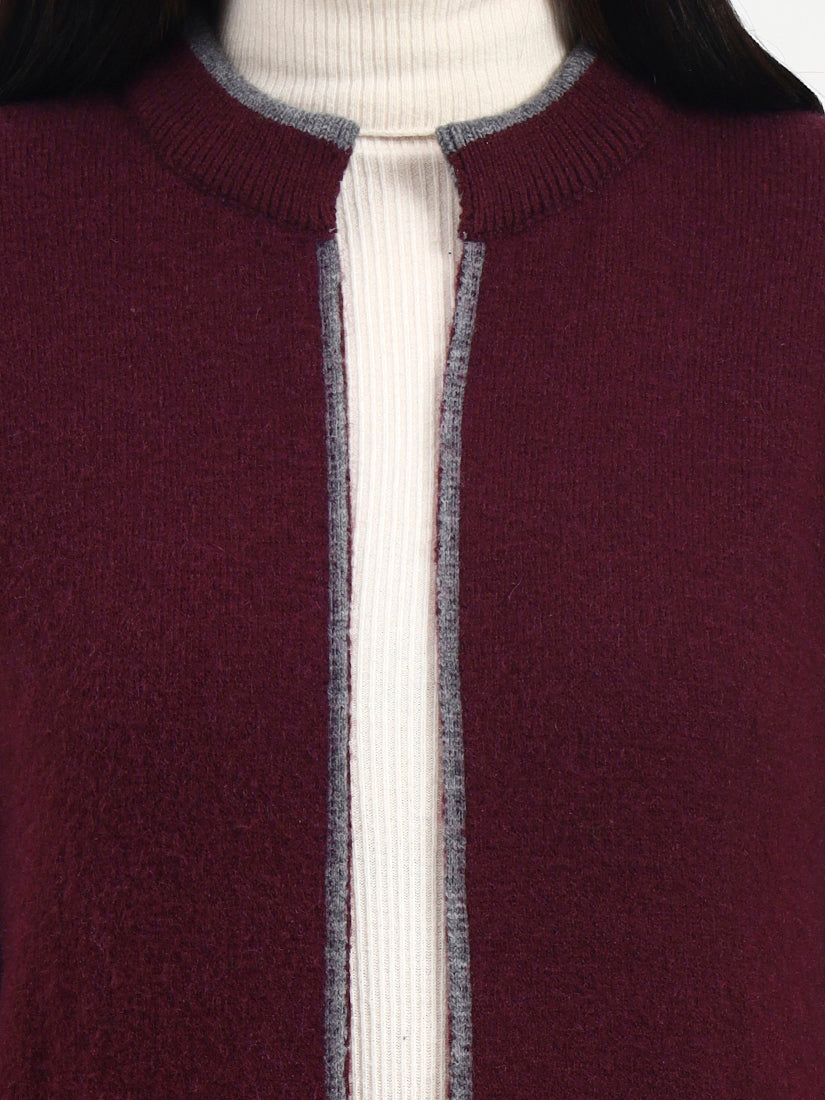 A deep wine-toned knit outlined in soft grey edging for a look that feels classic yet distinctive. The tailored open-front design and gentle texture offer warmth and elegance, making it a versatile addition to a refined winter wardrobe.