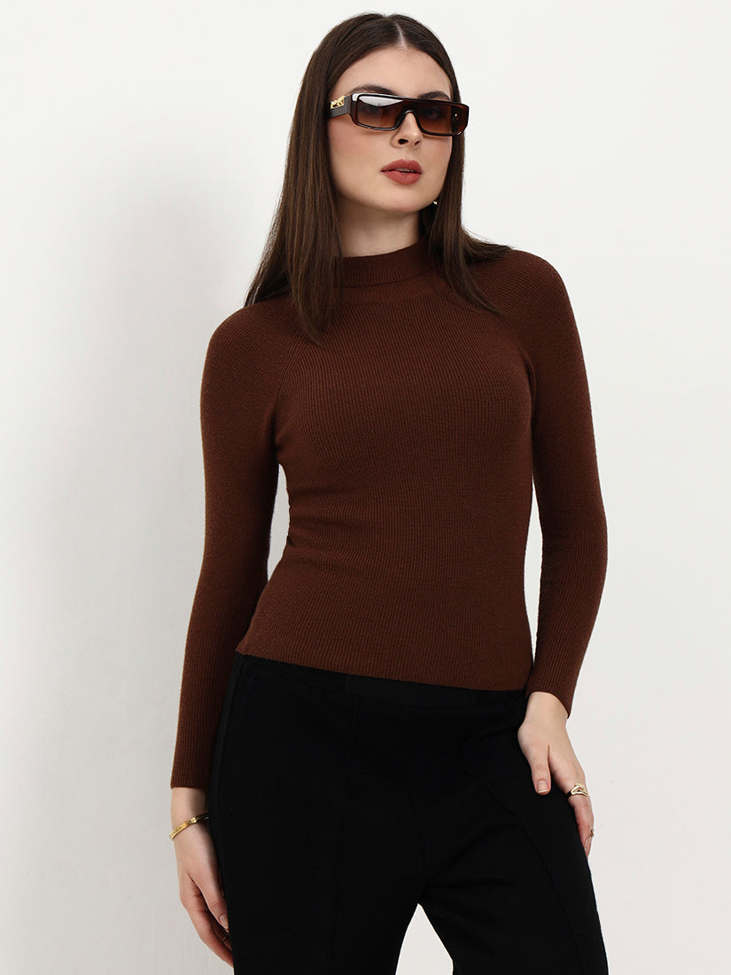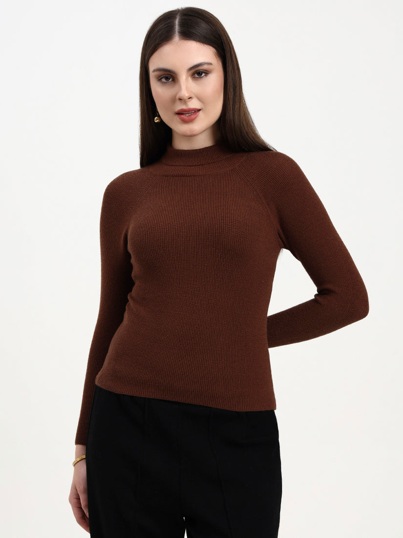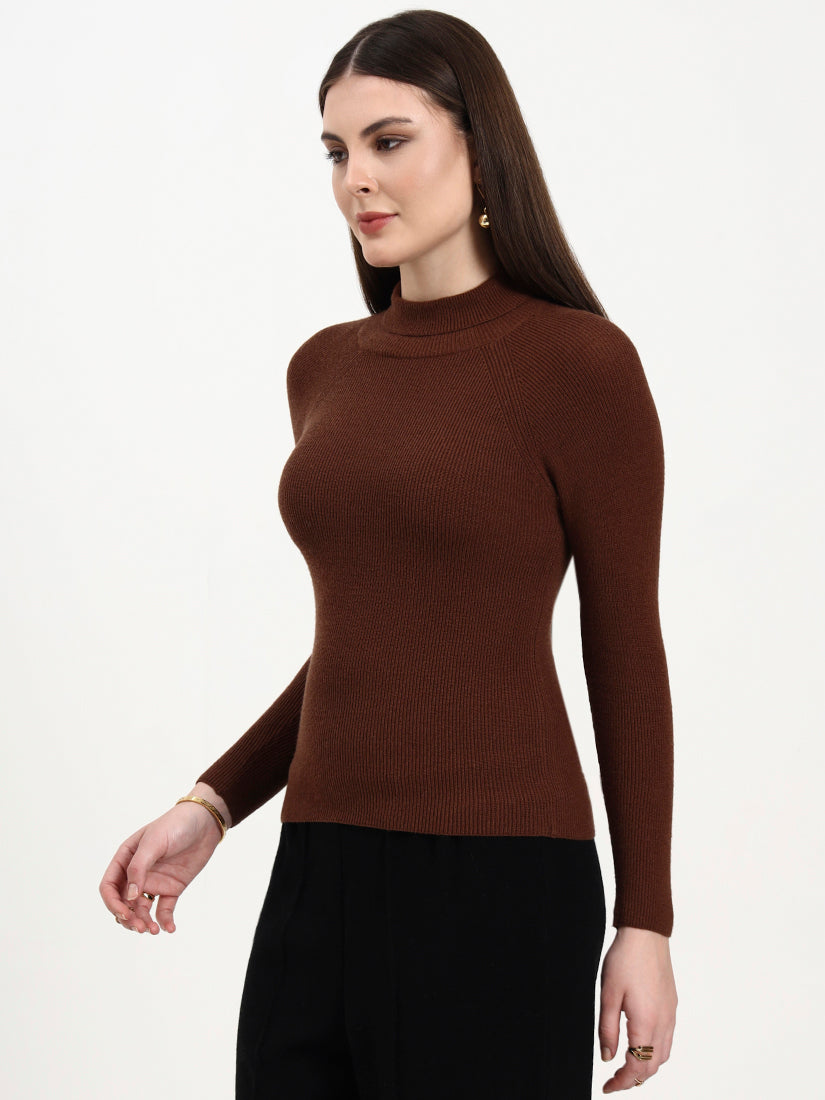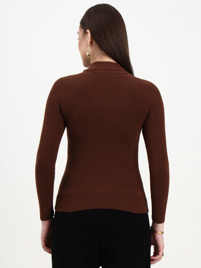 Richly toned and finely knit, this chestnut brown skivi brings warmth and quiet elegance to cooler days. Crafted in the finest wool with a close fit and smooth high neckline, it pairs timeless craftsmanship with a flattering modern silhouette.