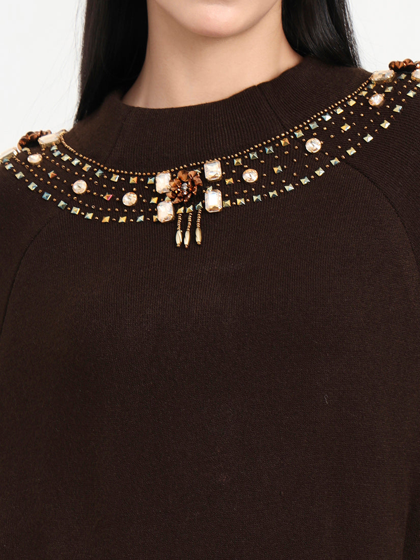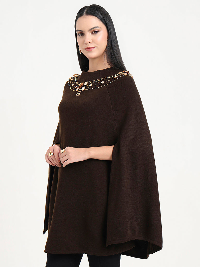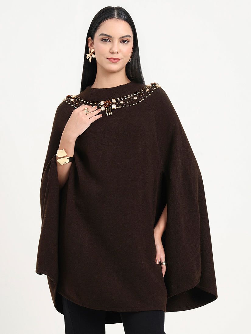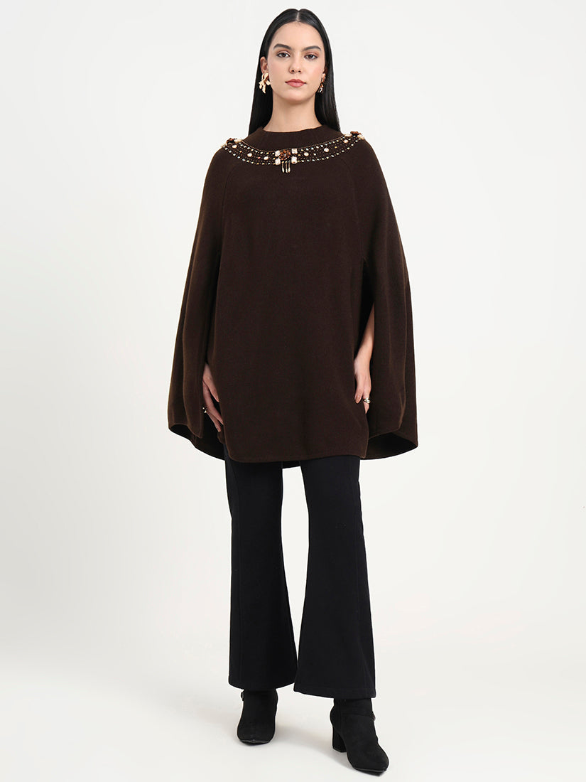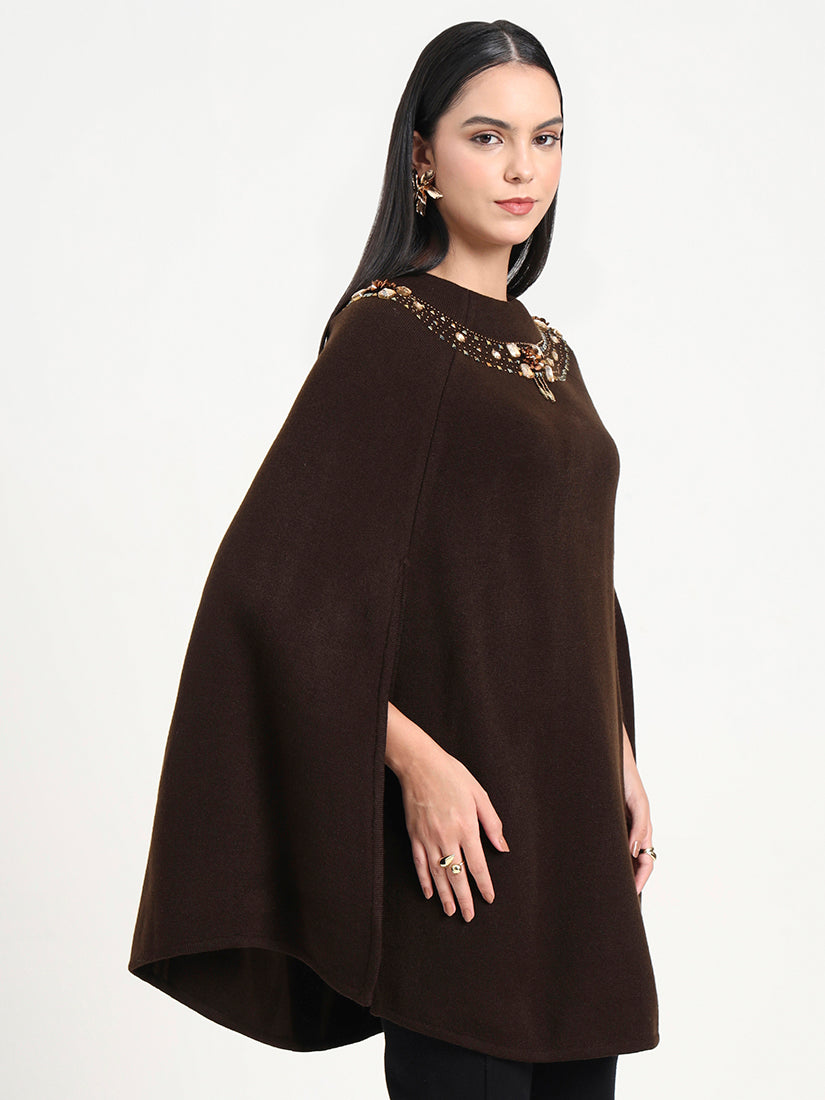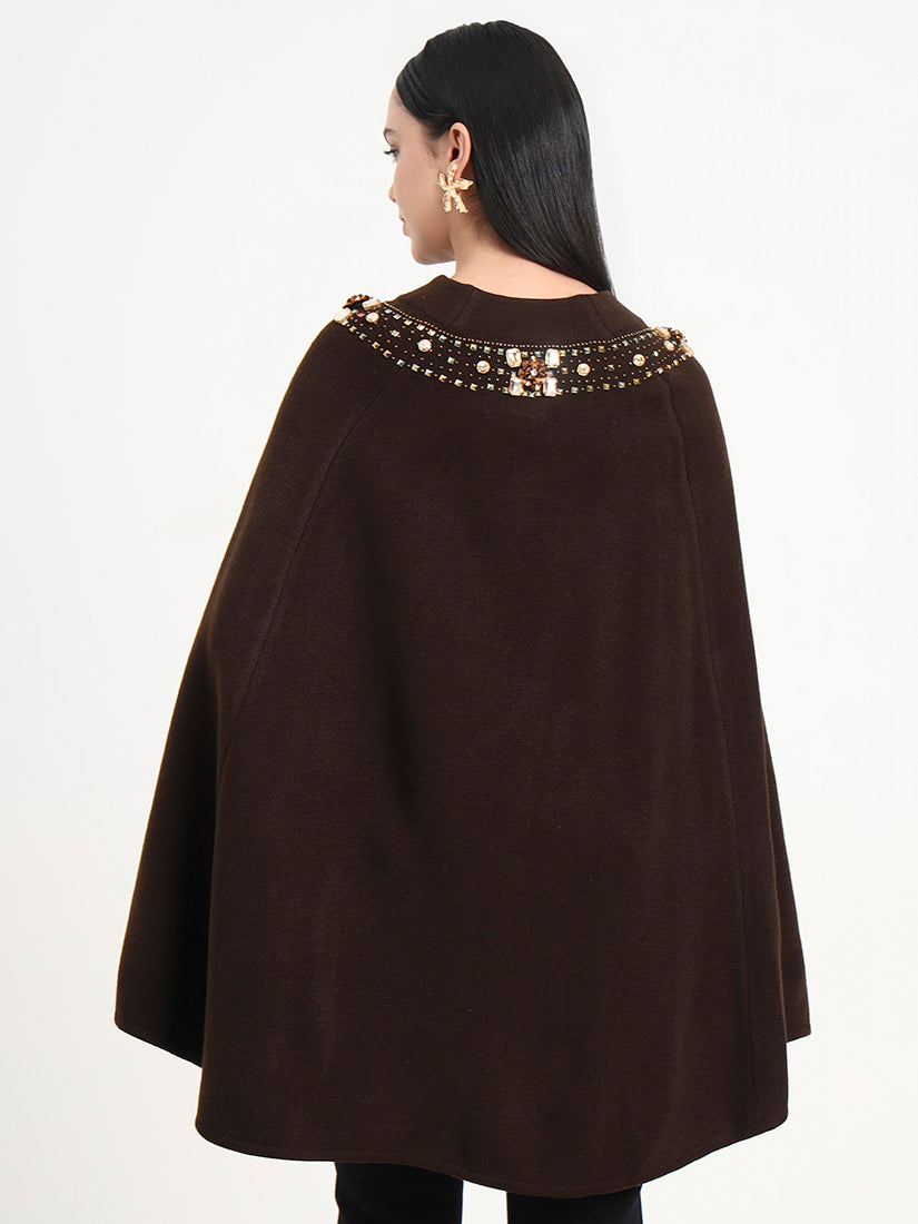 The Café Sorella Cloak is a masterpiece of quiet opulence. Draped in a warm mocha hue, it is crowned with an intricate border of hand-set stones, reminiscent of heirloom jewelry. With its sculptural flow and radiant detailing, this cloak transcends fashion to become a legacy piece — a timeless treasure of refined taste.
