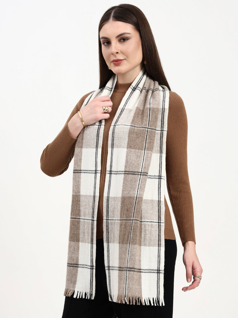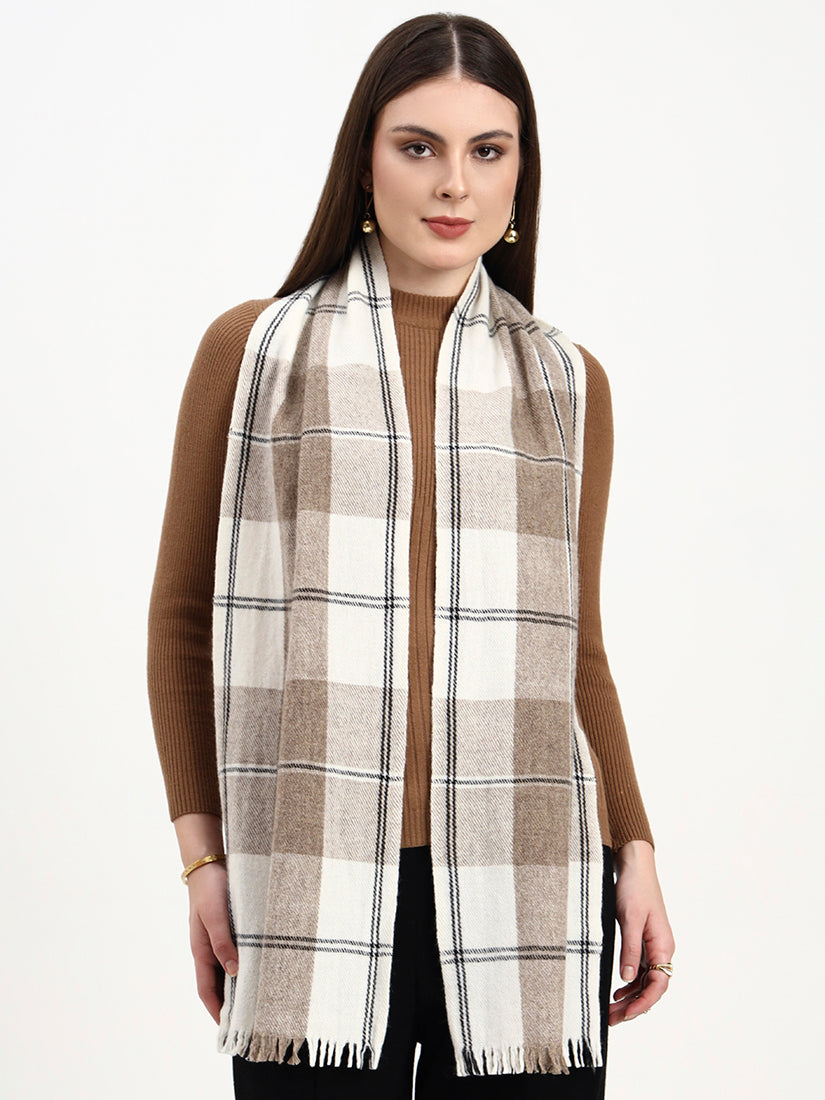 This beige and ivory check scarf is a study in refined contrast — the fine black lines and warm undertones elevate its minimal design. Light, soft, and impeccably woven, it transitions effortlessly from casual to classic.