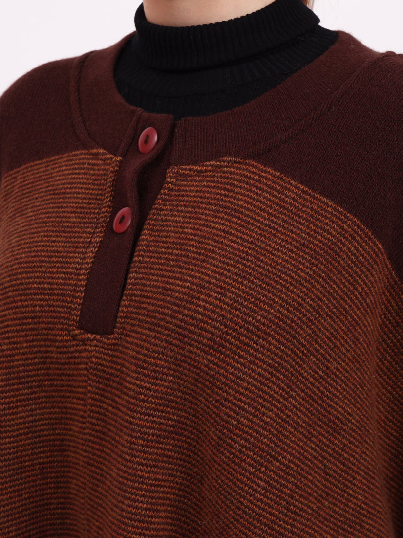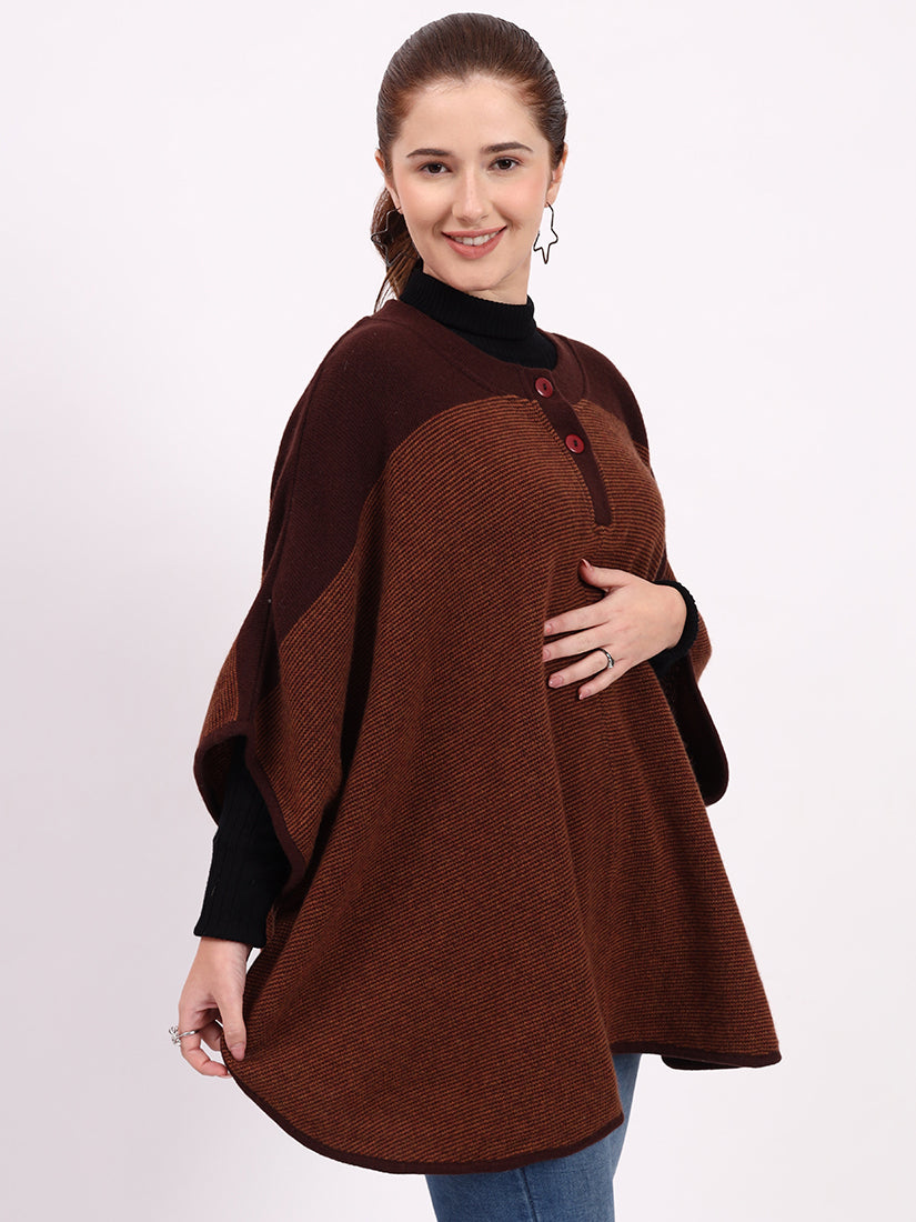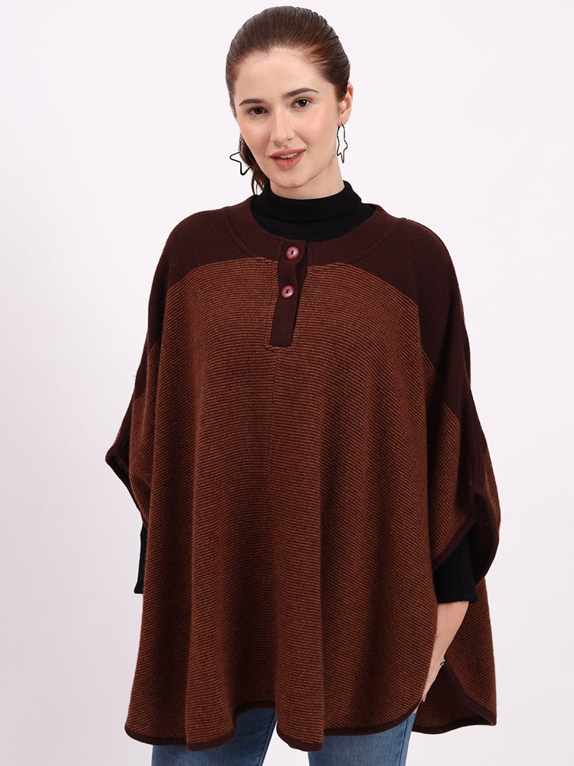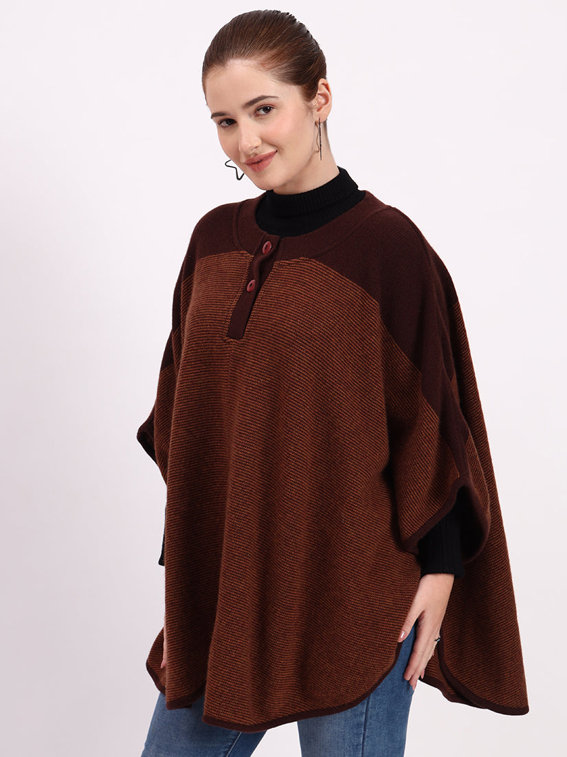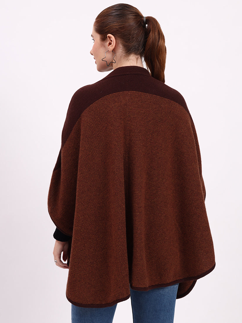 A warm brown base paired with subtle contrasts, this lambswool poncho evokes rustic elegance with a modern touch.