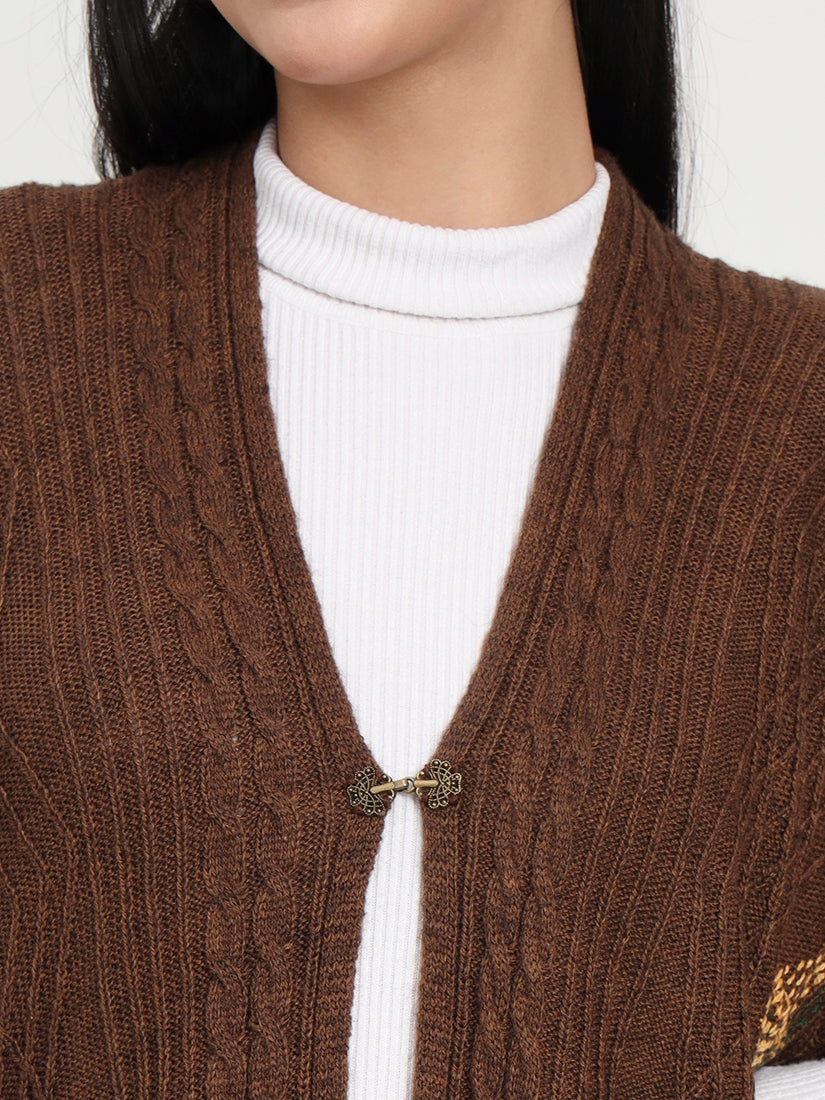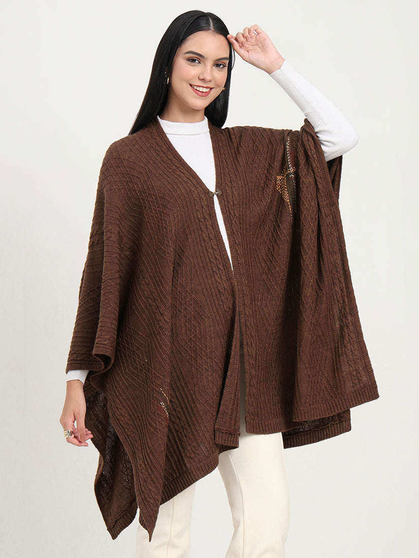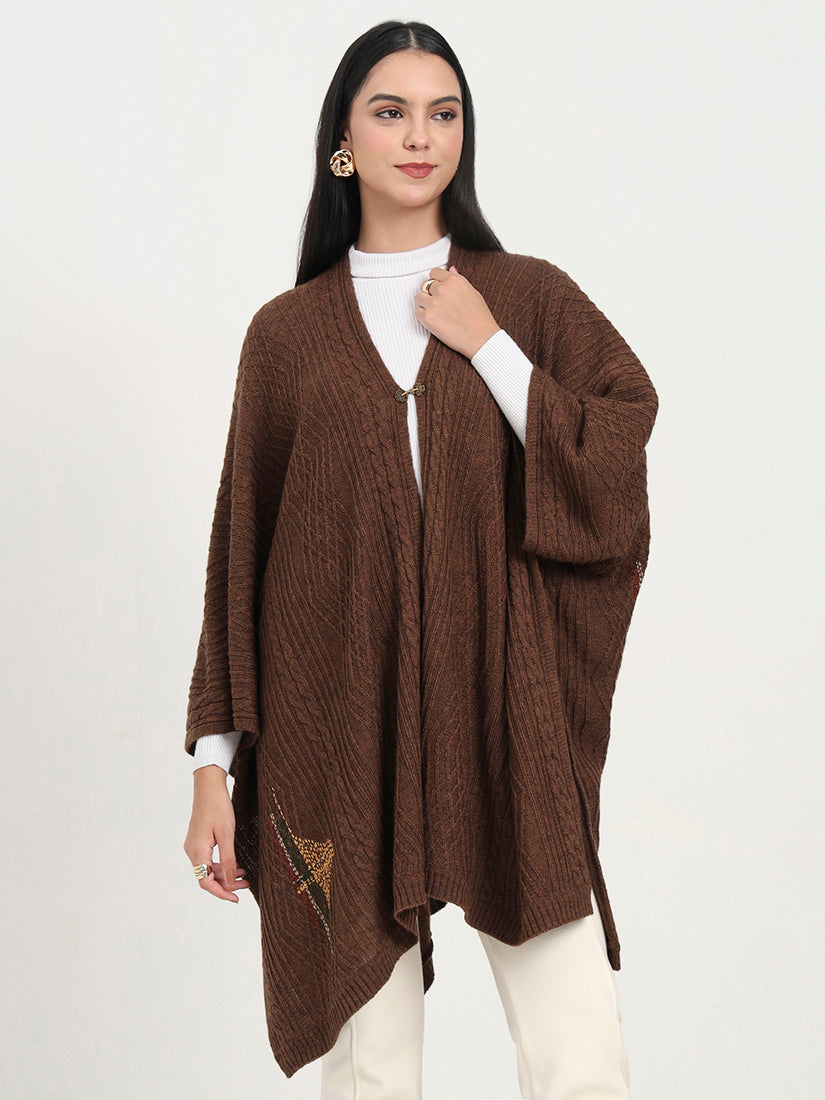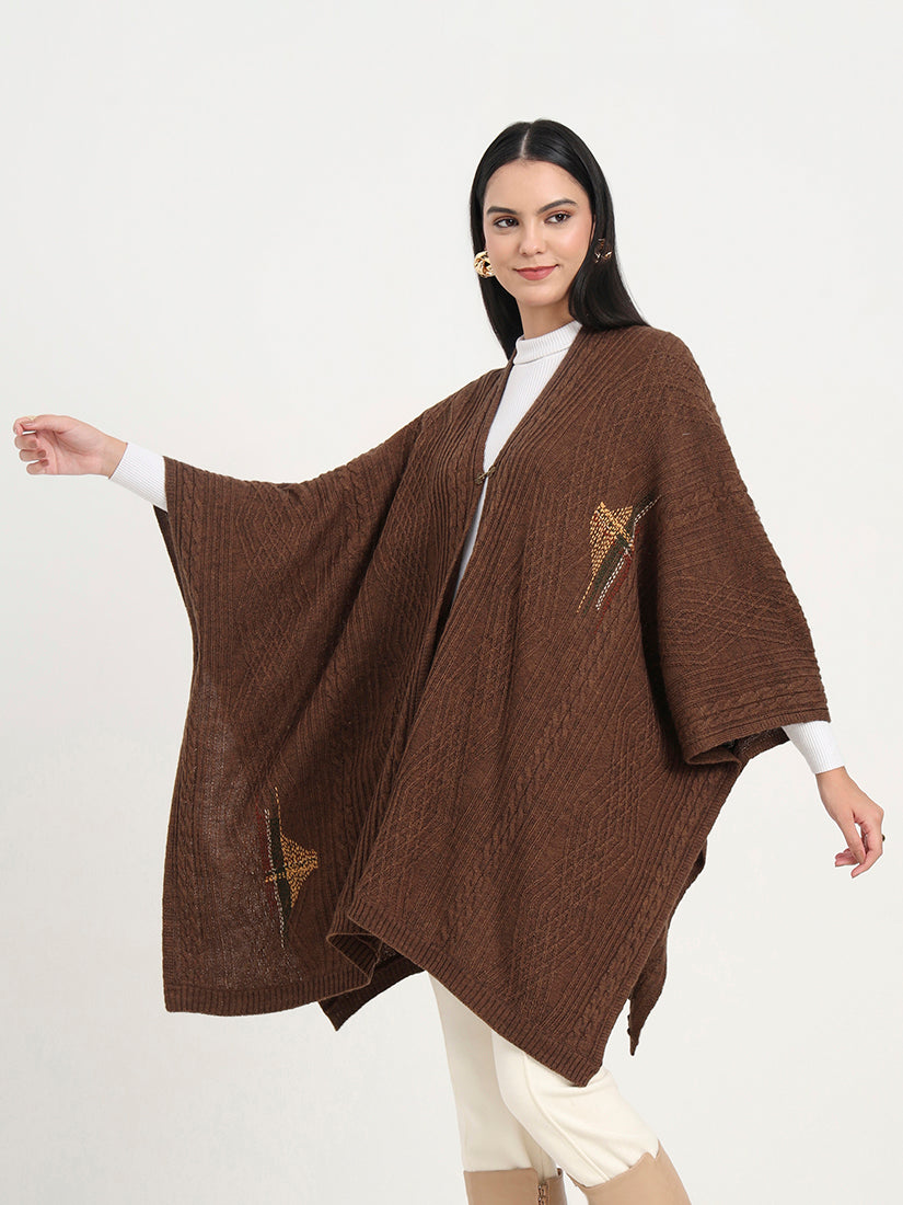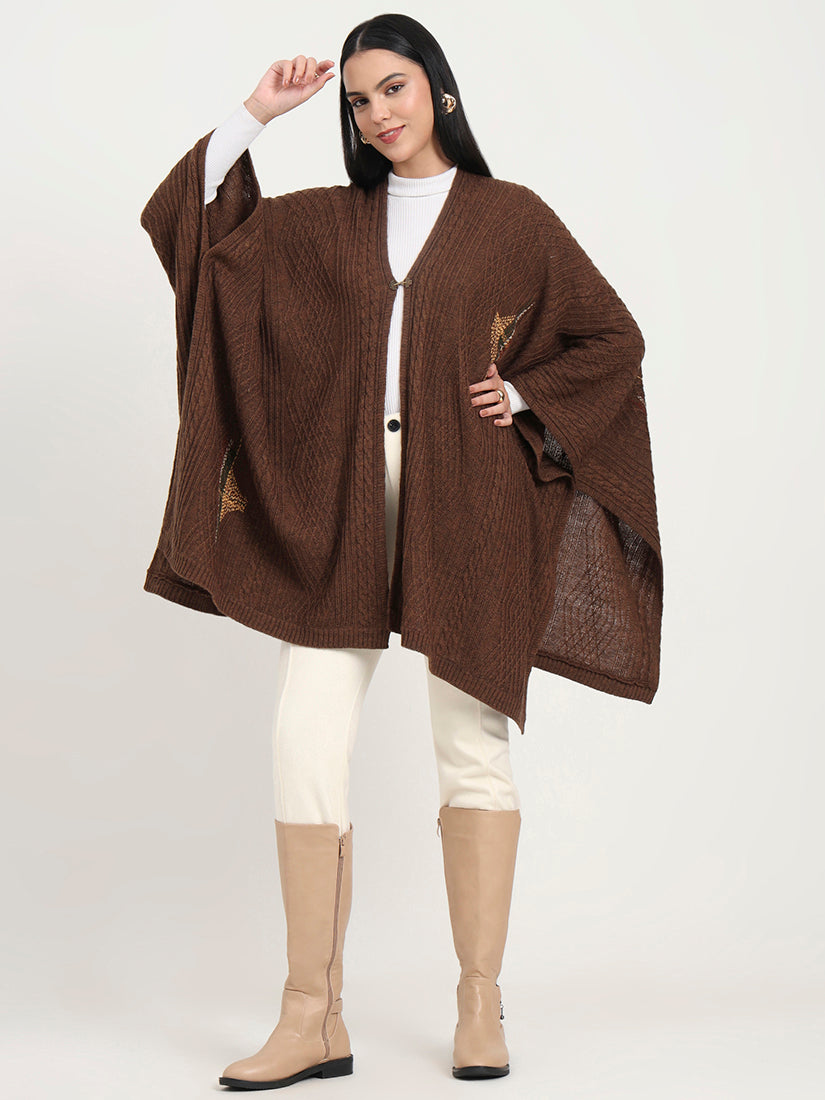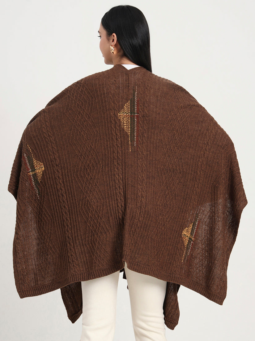 In a deep chestnut hue, this cape carries subtle geometric textures that add dimension and depth. The delicate handwork motifs placed across the front lend a quiet artistry, while the warm undertone makes it a versatile companion for both casual elegance and evening layering.
