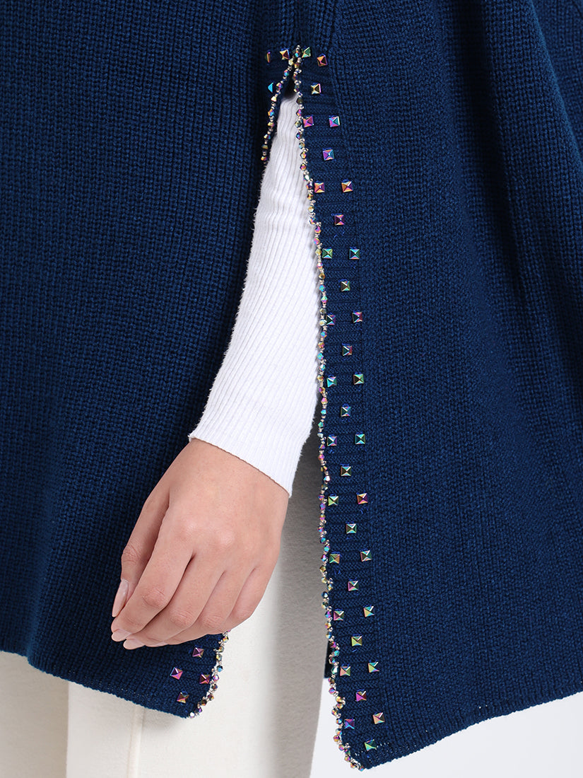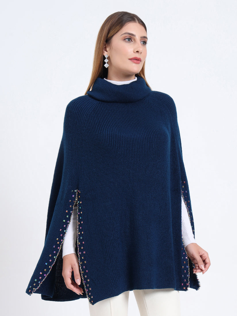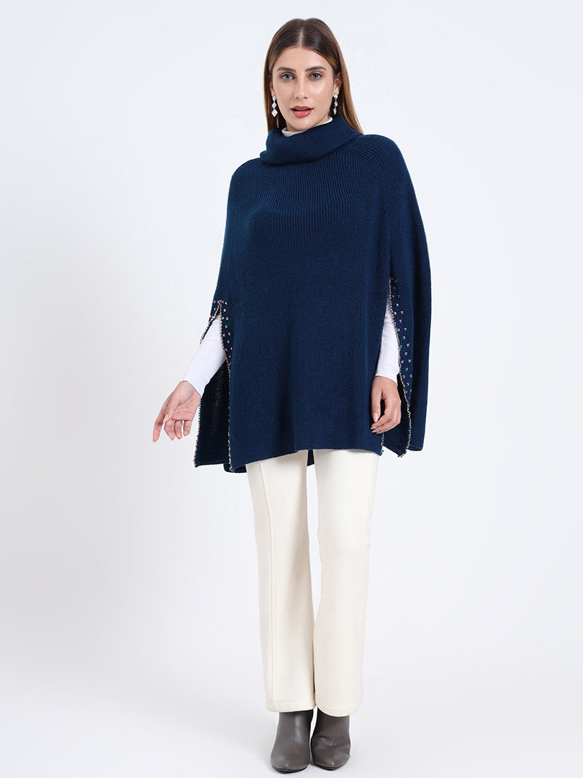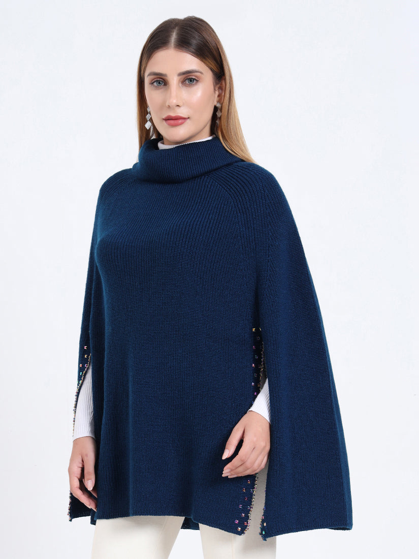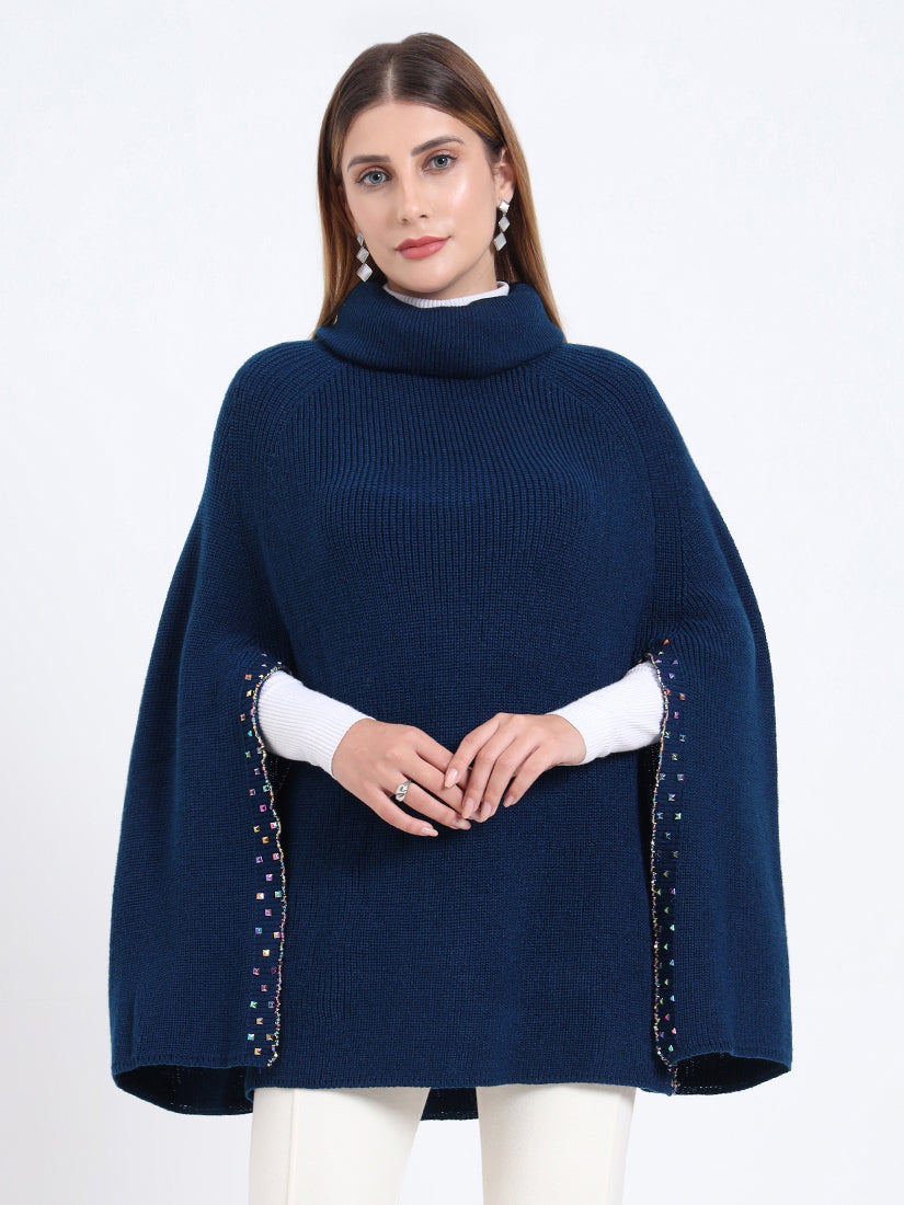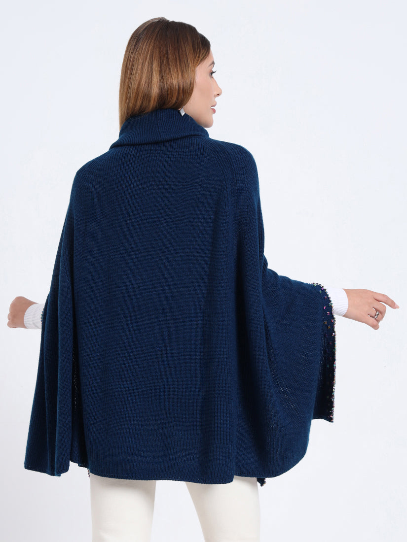 Striking and refined, the Cobalt Aura Poncho in plush wool blends captures the depth of blue with subtle shimmer, offering a bold yet elegant layering statement.