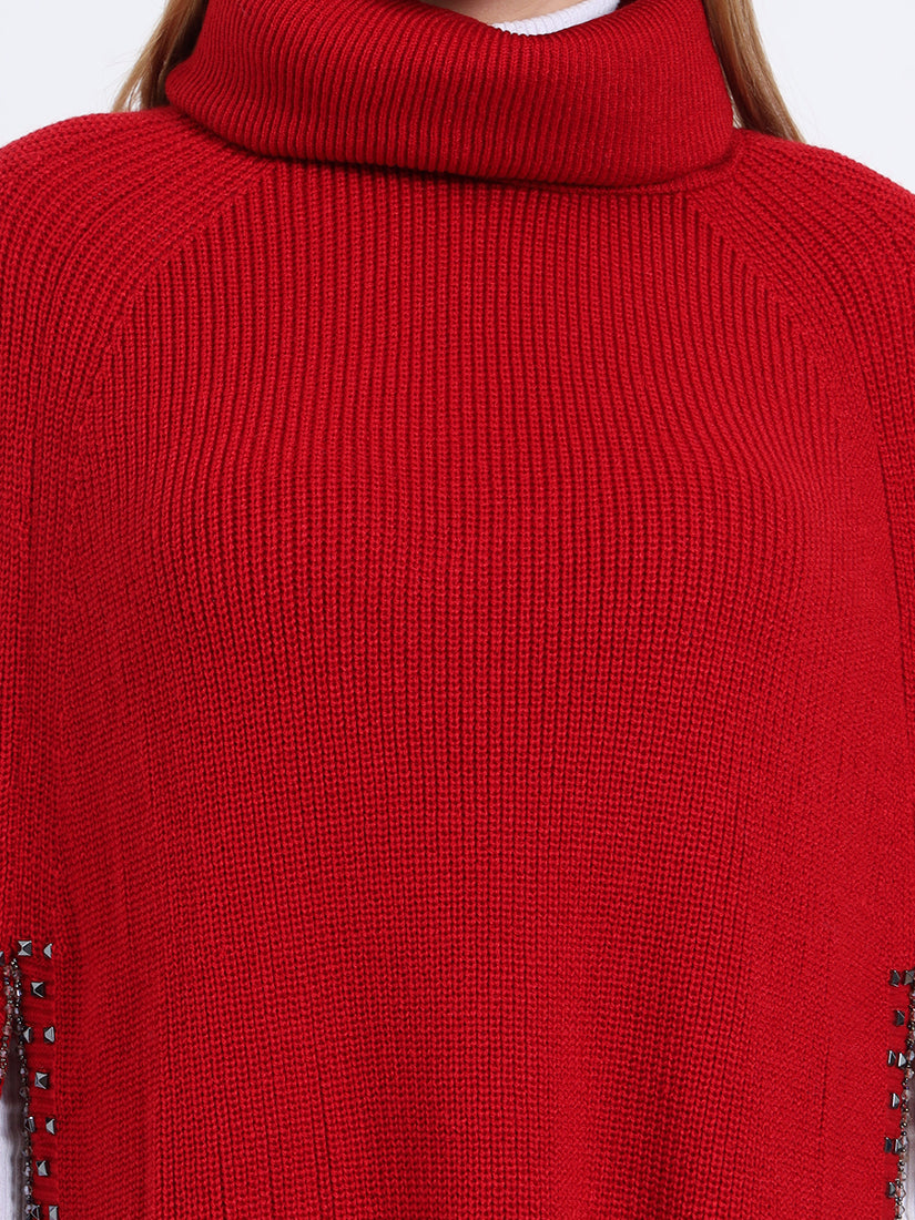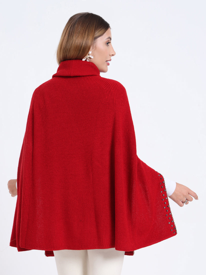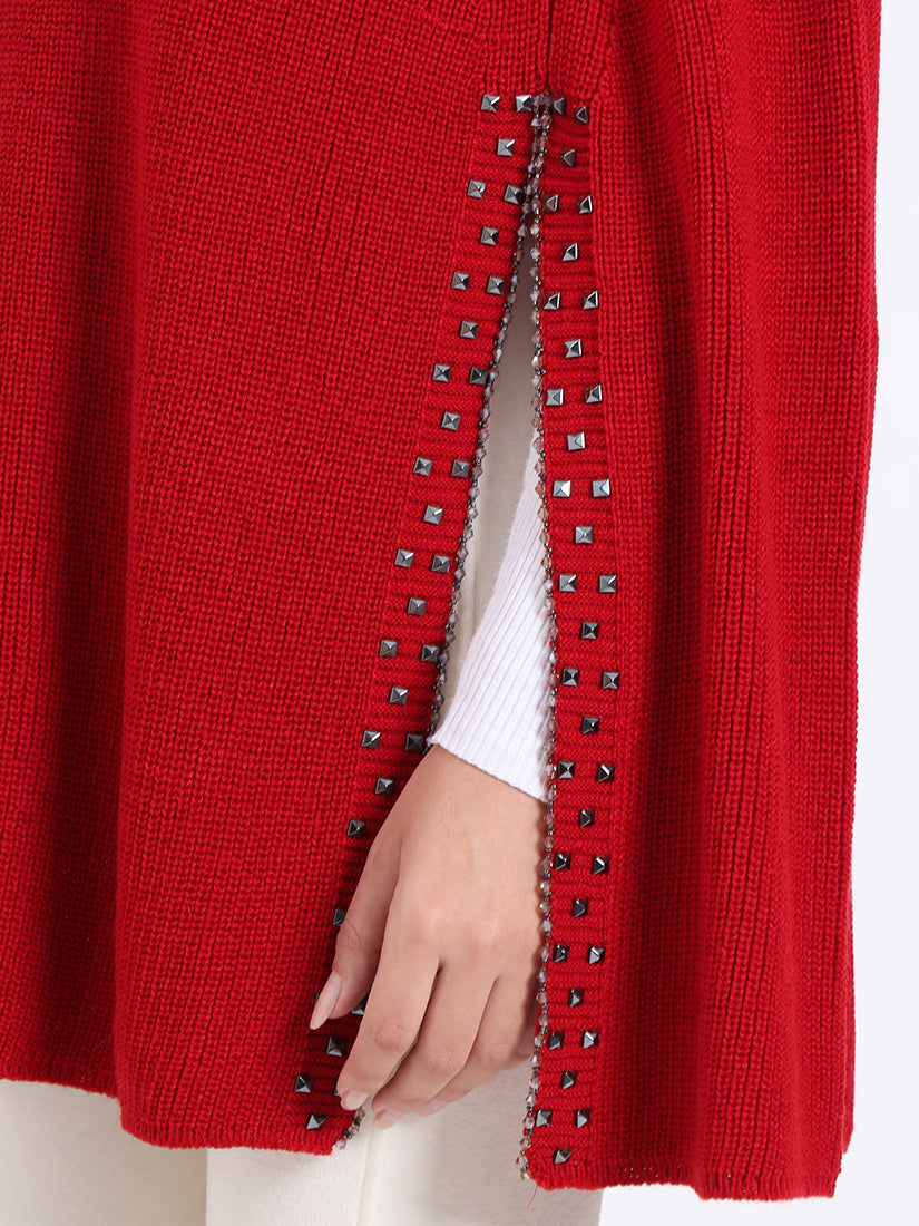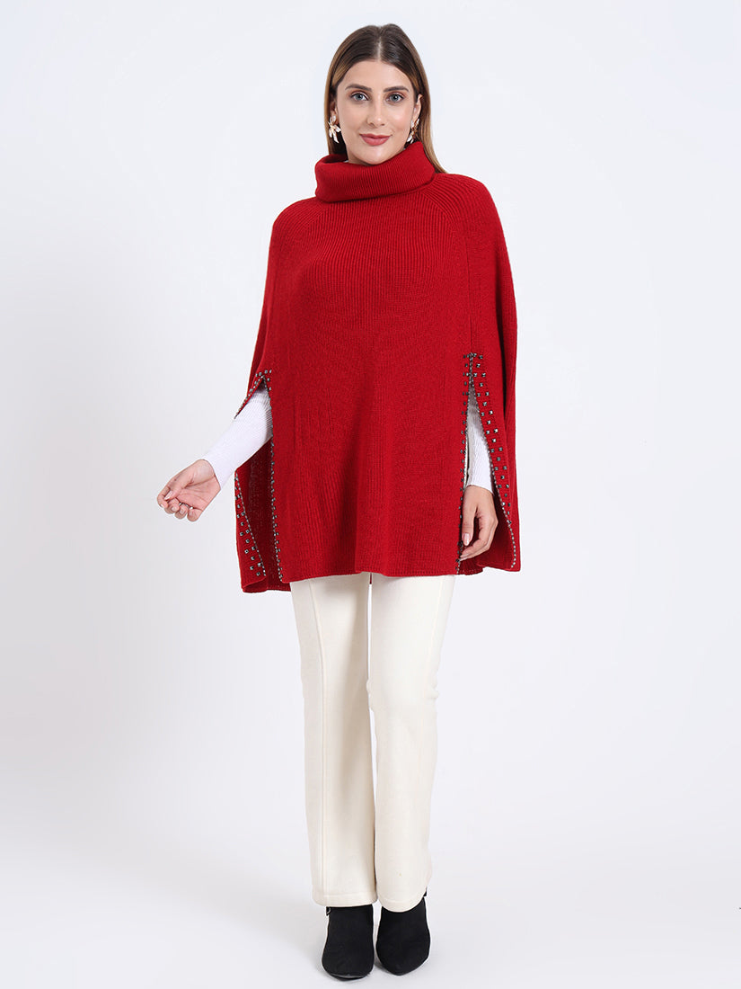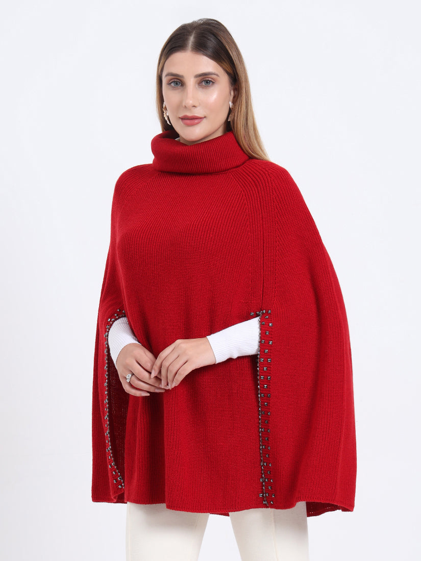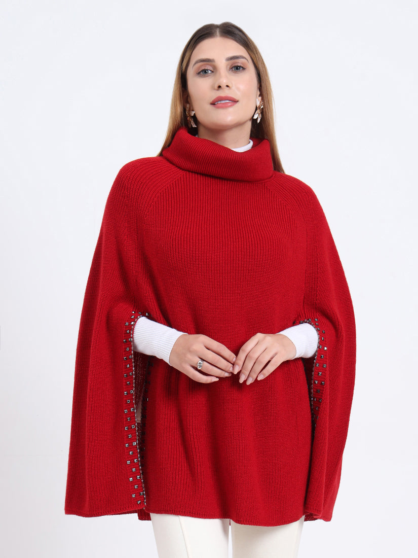 The Crimson Eclipse Poncho pairs rich red tones with the fluid drape of fine wool blends. A statement of bold sophistication and timeless allure.