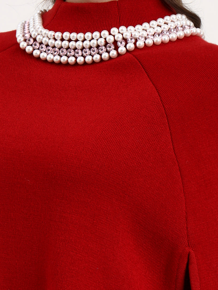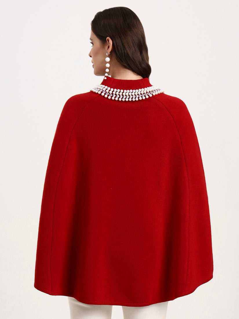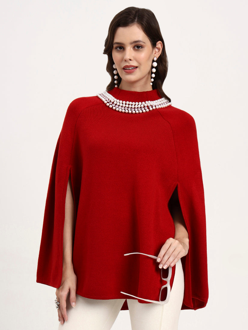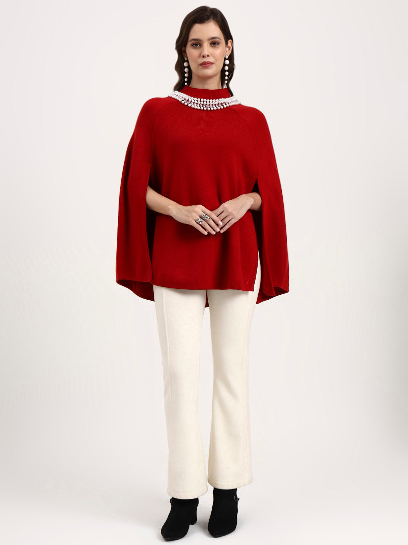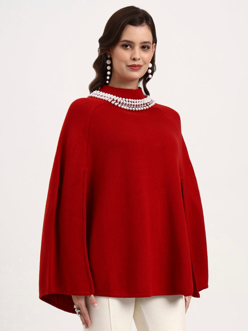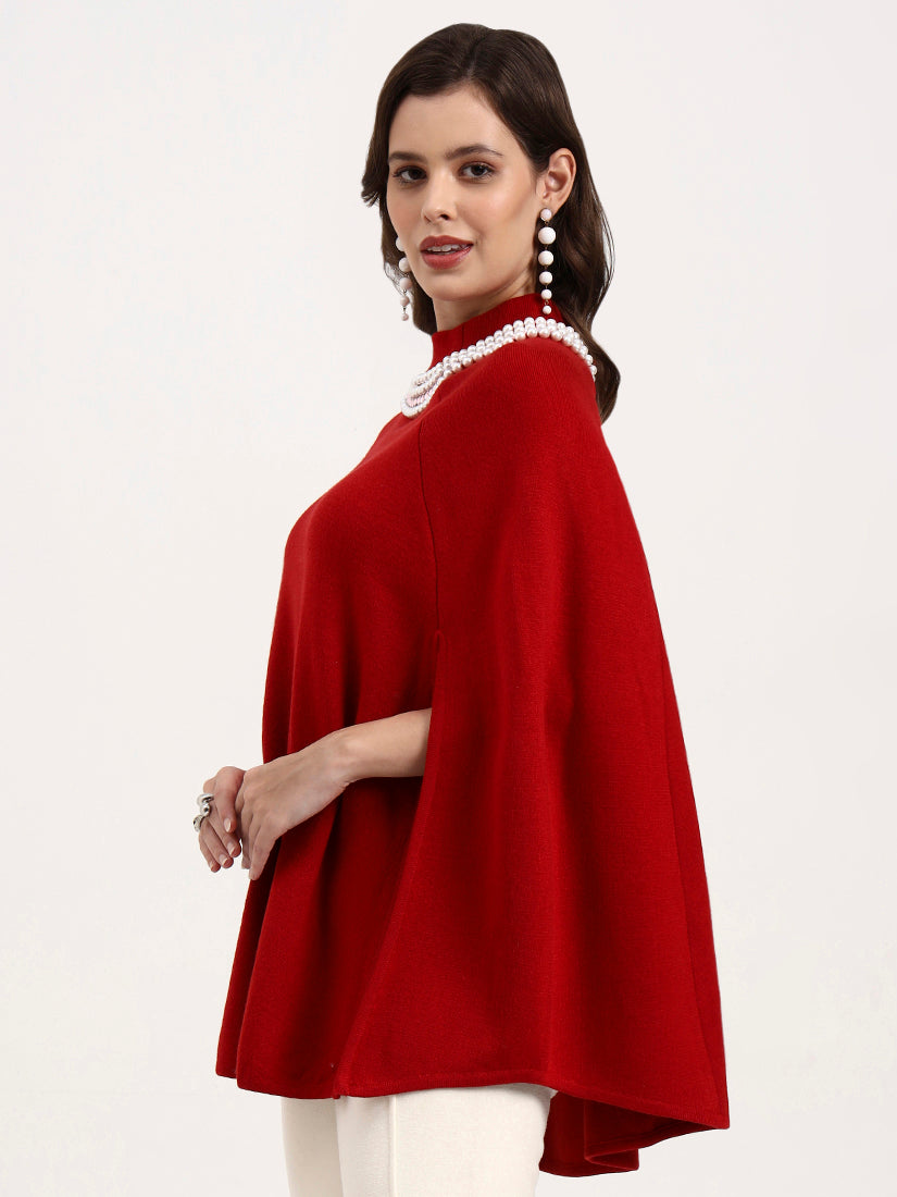 The Crimson Pearl Poncho blends heirloom elegance with contemporary sophistication. Crafted in a vibrant red tone, it features a stunning hand-adorned pearl neckline that instantly elevates the silhouette. Its fluid drape, soft hand-feel, and refined side-slit design make it a standout piece — perfect for elegant evenings, festive gatherings, or adding a touch of luxury to everyday dressing.