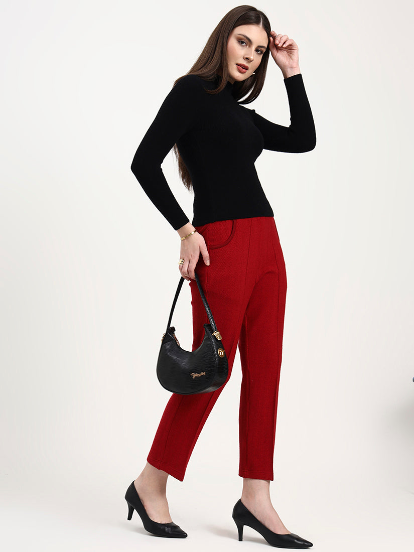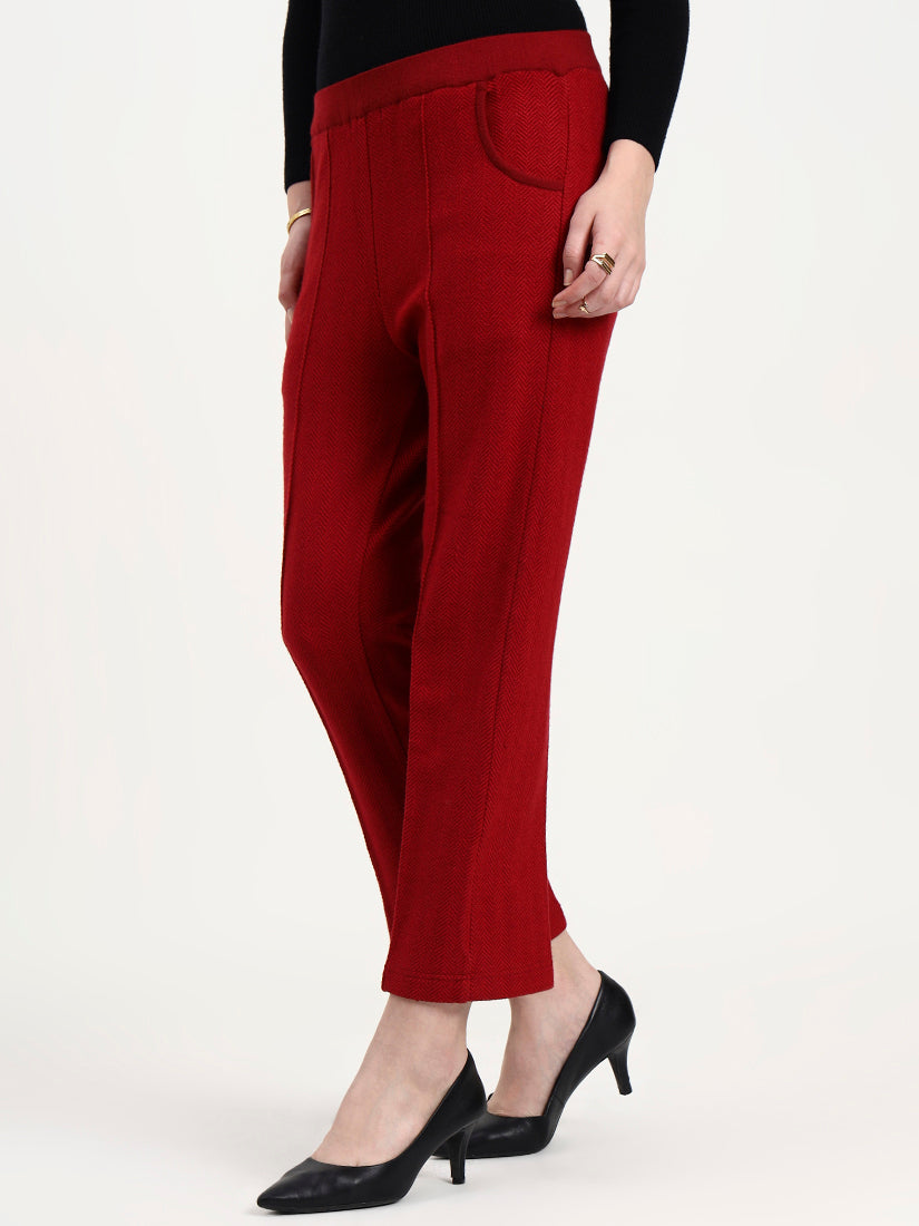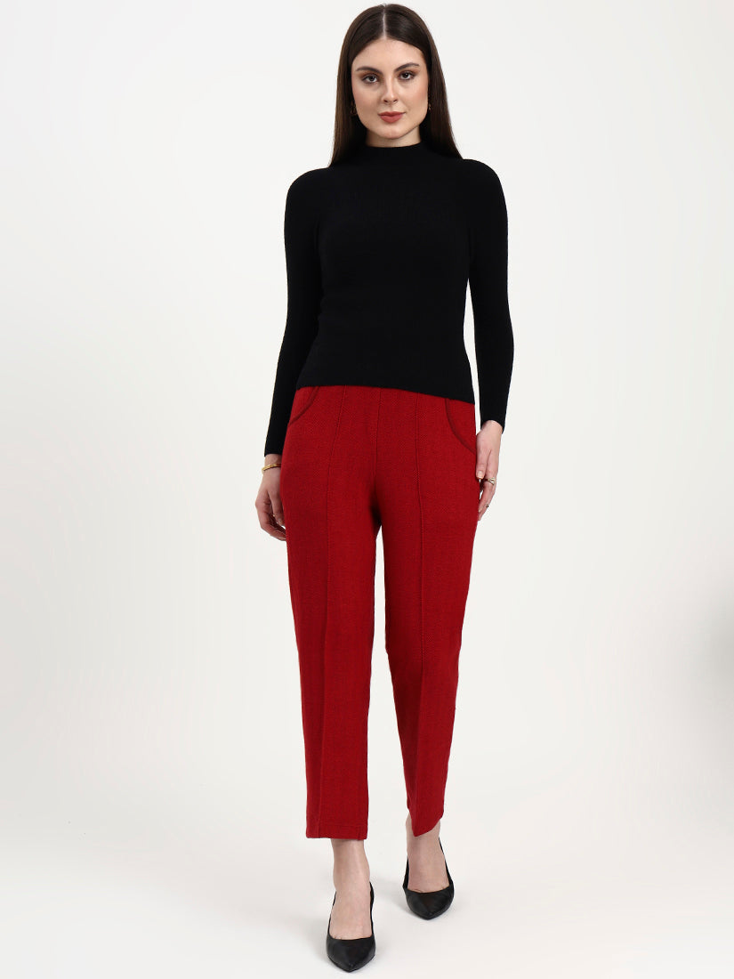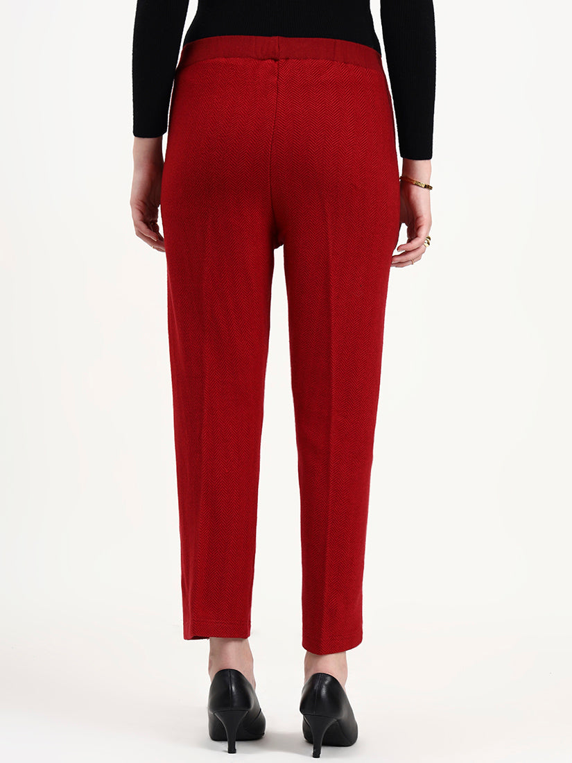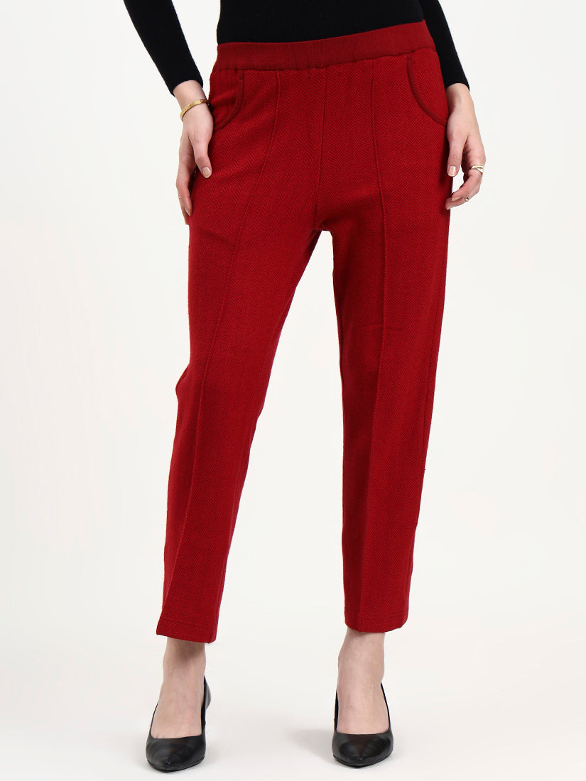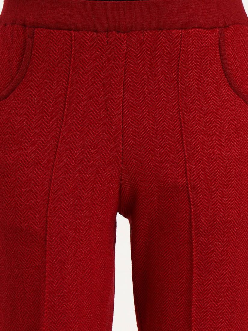 Modern tailoring meets rich texture in these red wool trousers. Designed for ease and poise, the structured silhouette and subtle pattern make them a standout addition to both day and evening looks.