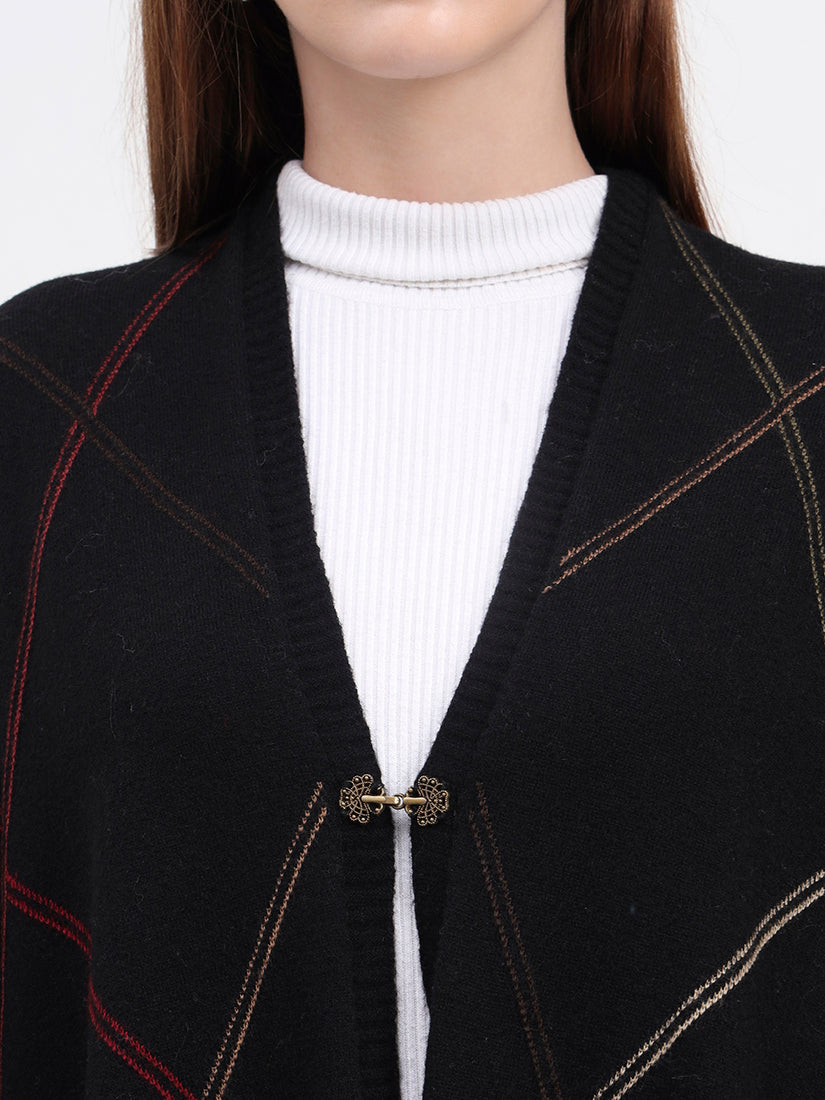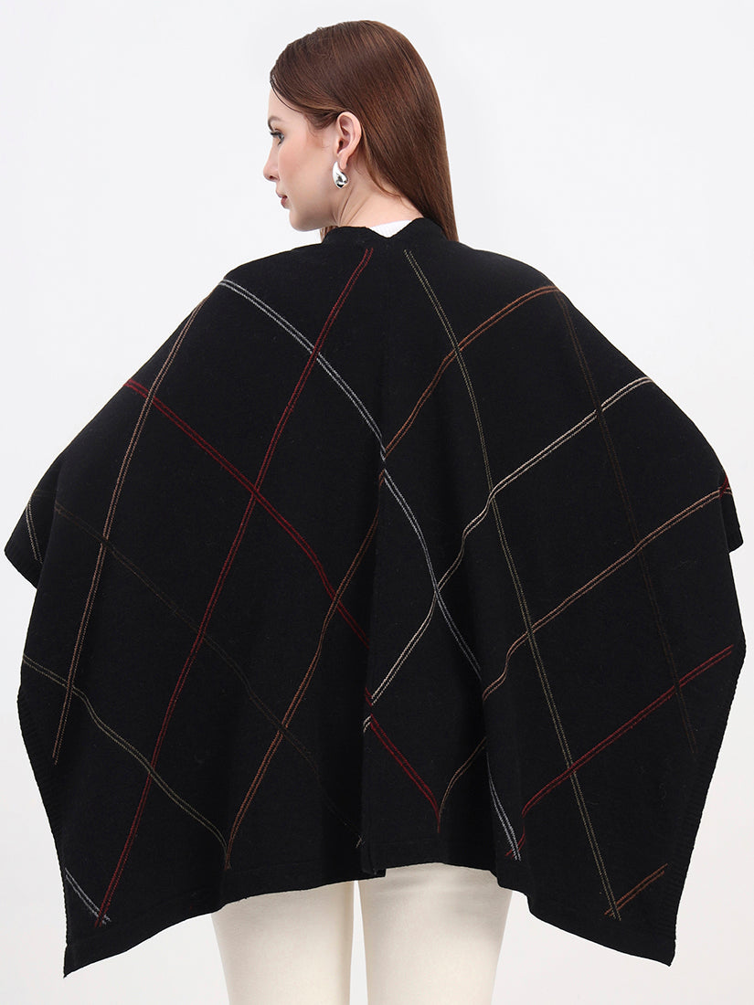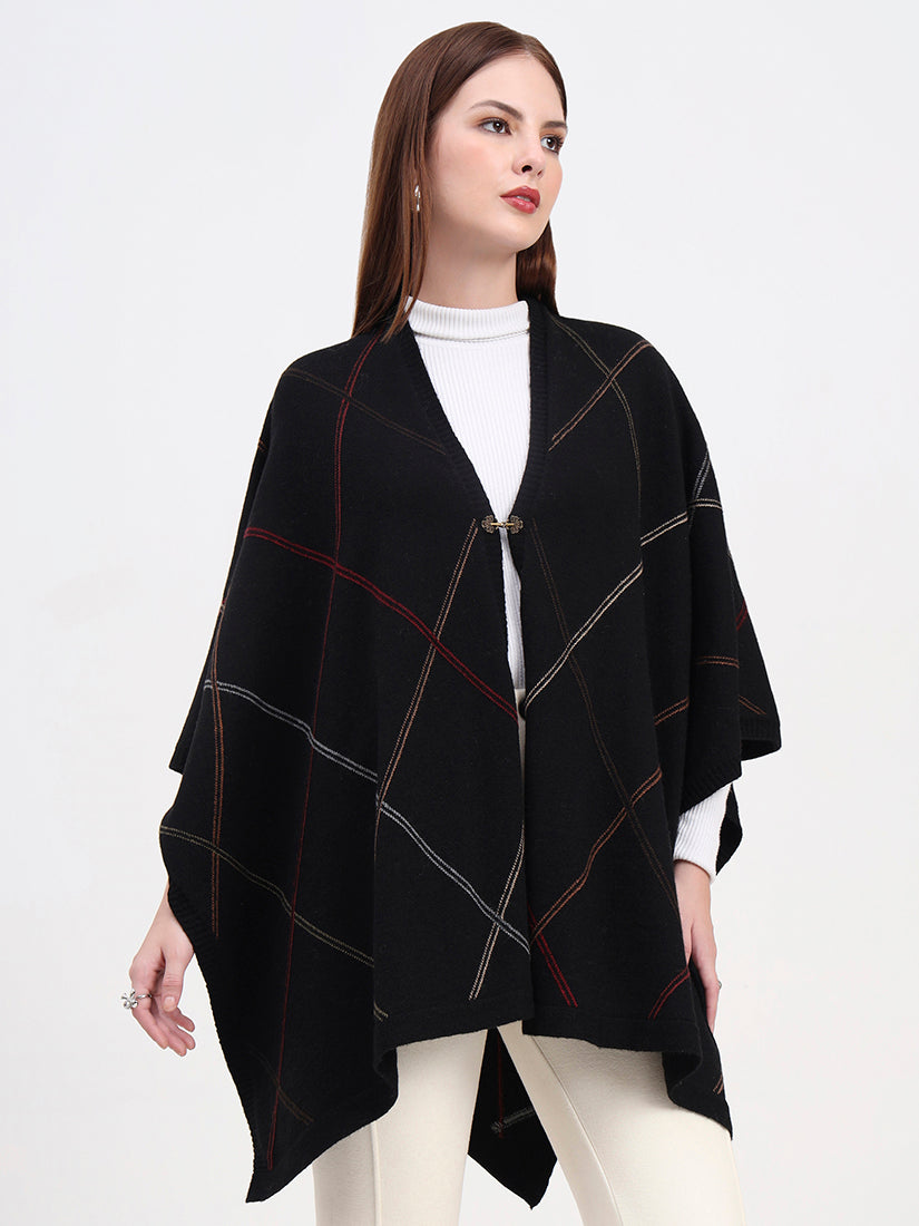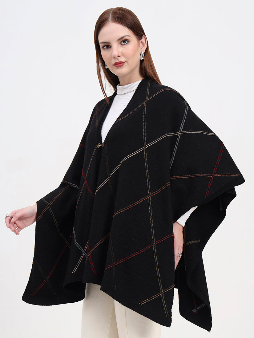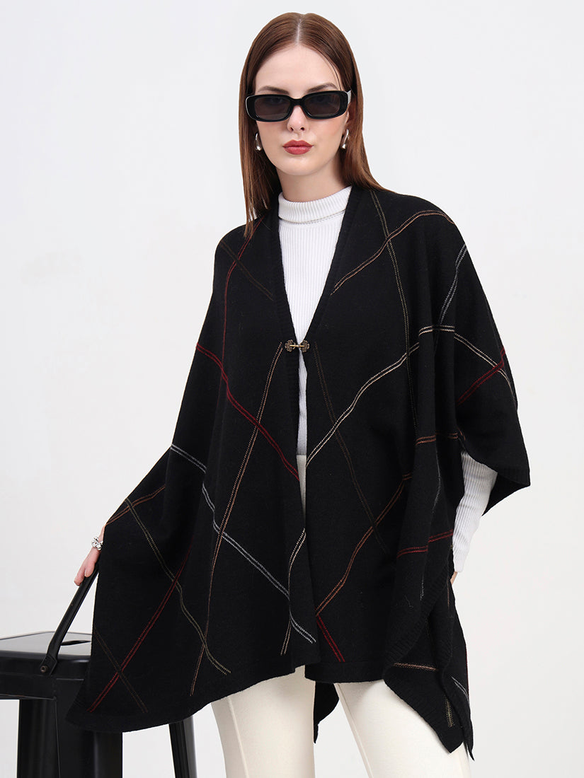 A bold black cape accented with structured grid-like detailing. Designed for versatile elegance, it drapes with ease while adding definition to modern layering.