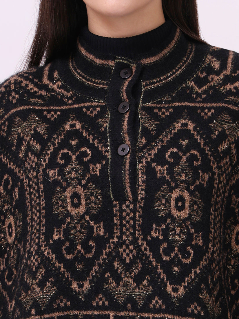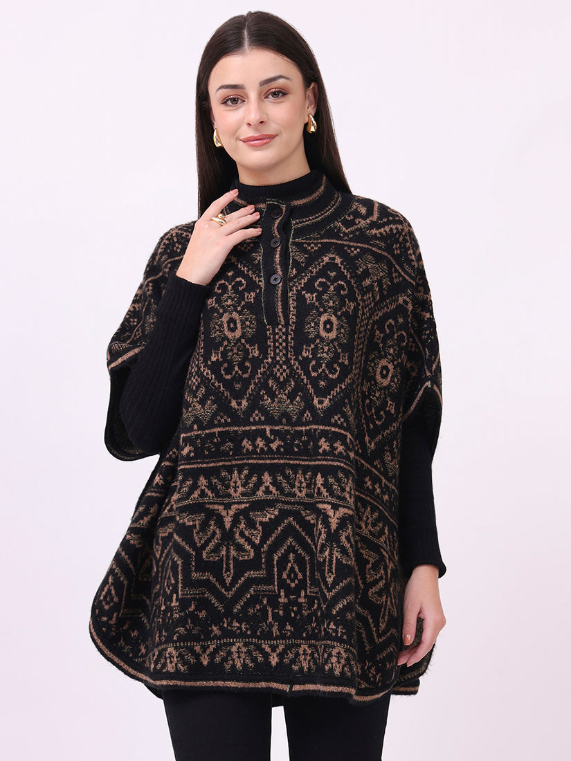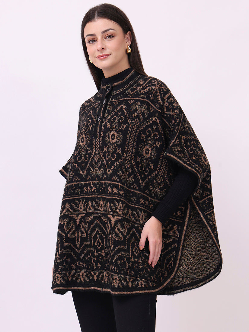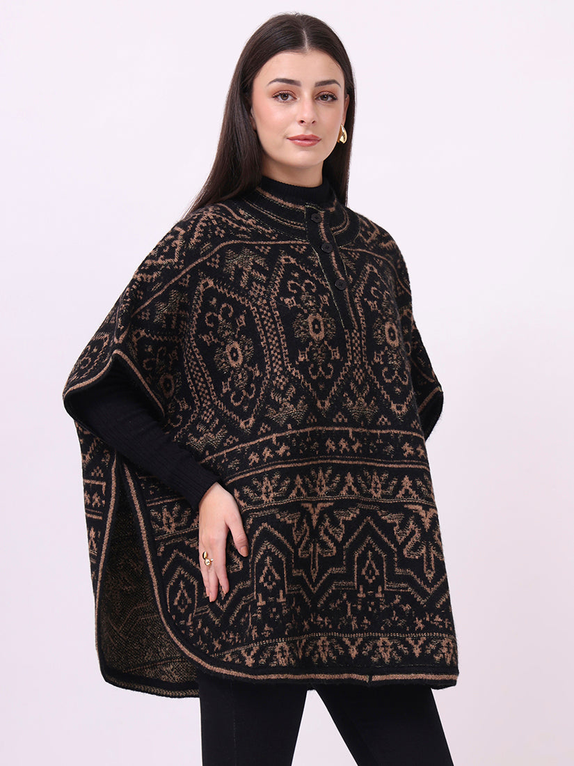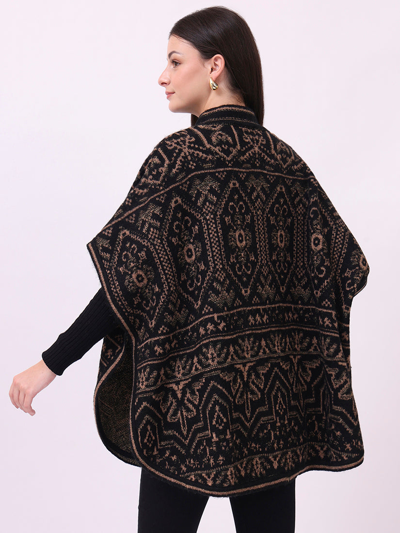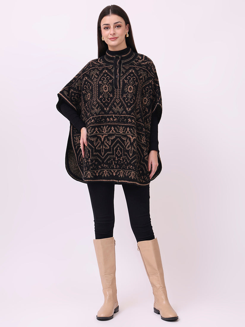Rich and commanding, the ebony jacquard poncho carries the essence of wearable tapestry. A masterpiece of detailing and strength, it is both statement and classic.