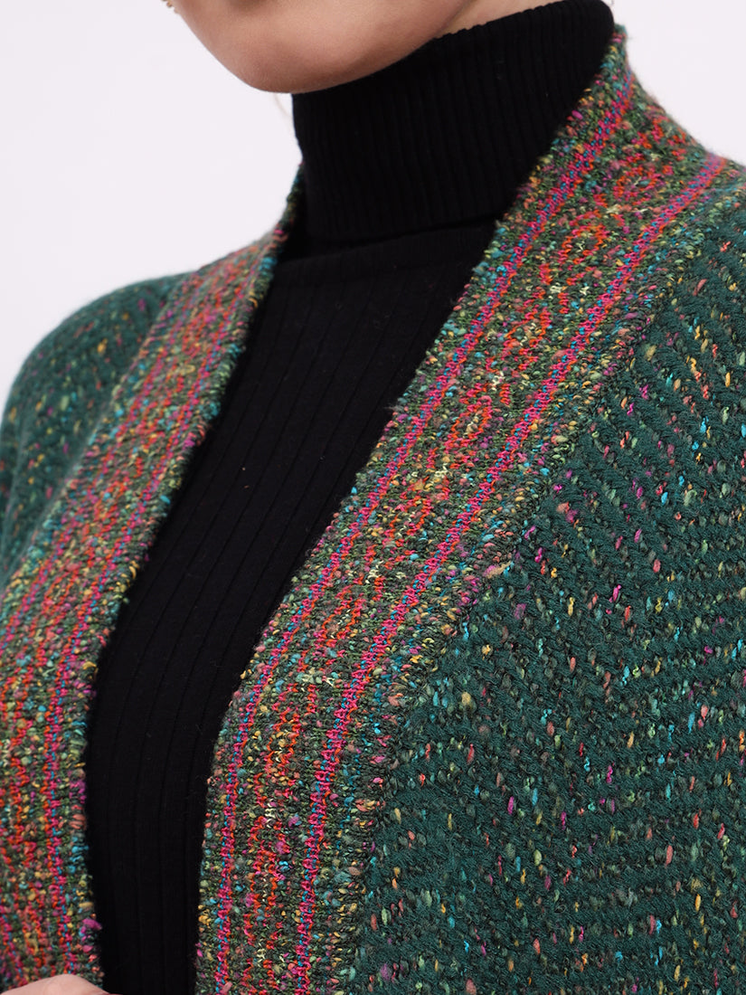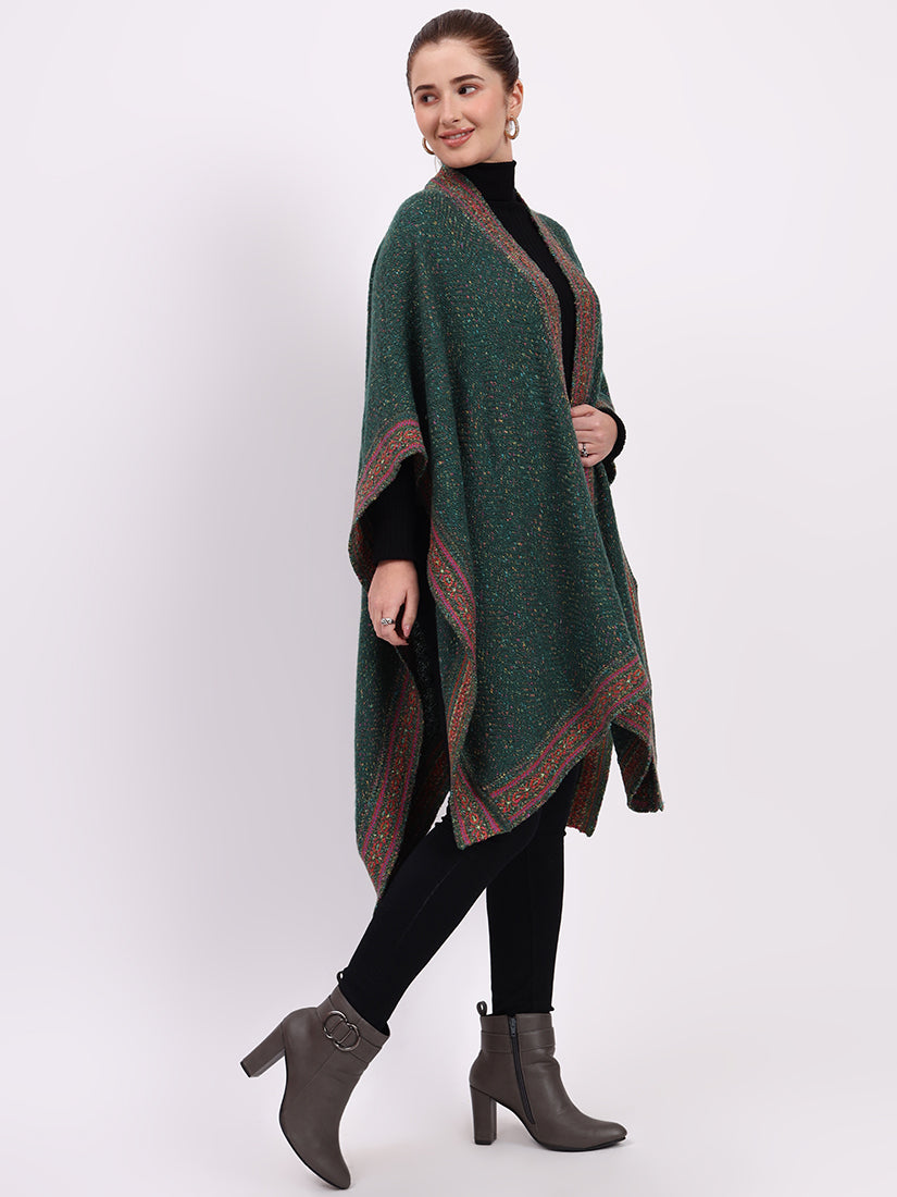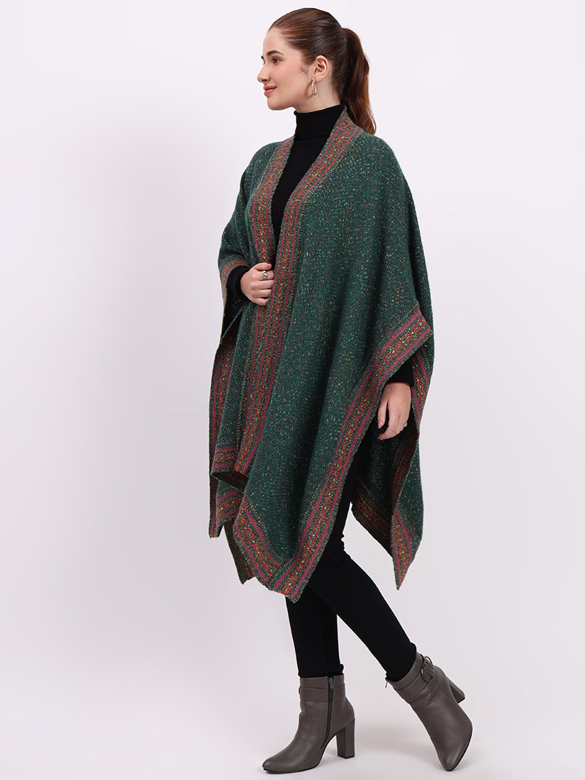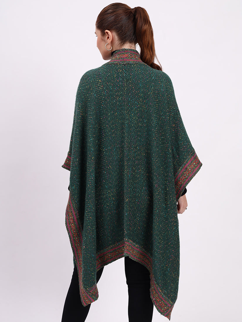 Woven in a luxurious wool blend, the Emerald Mosaic Border Cape features a textured green body highlighted with intricate multicolor woven borders. A statement of artisanal detail, it blends rich vibrancy with timeless sophistication.
