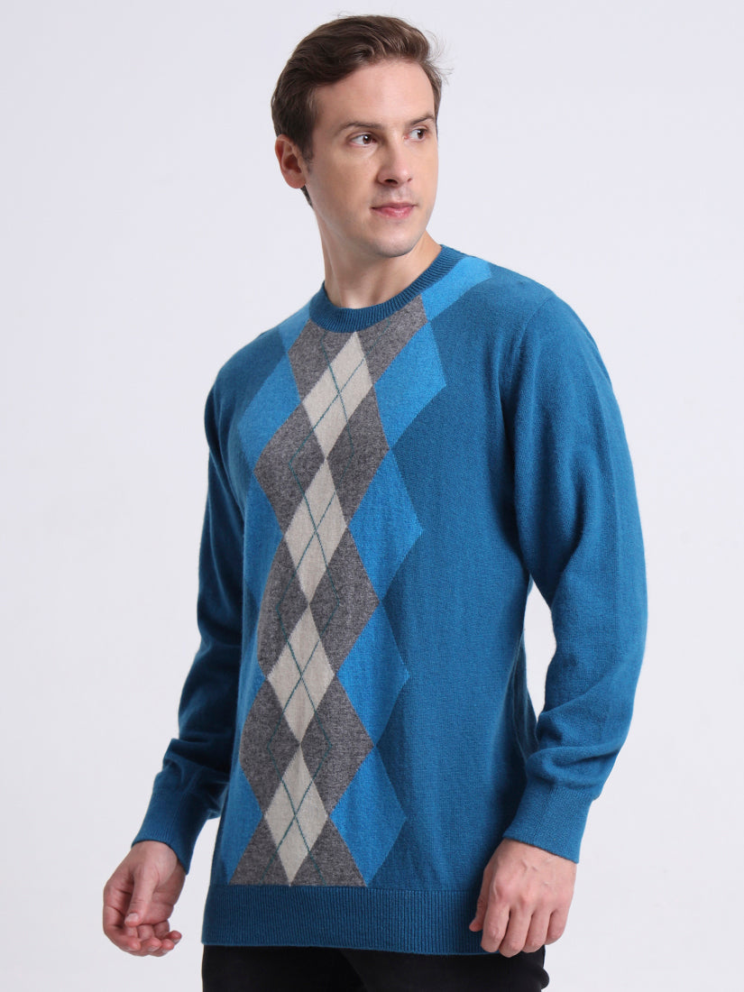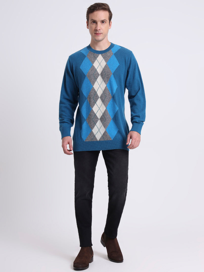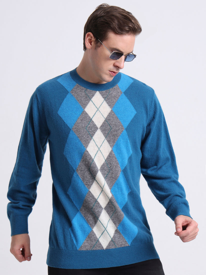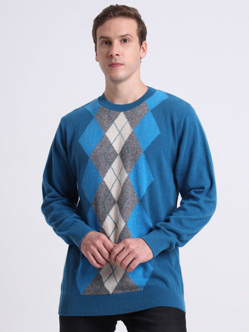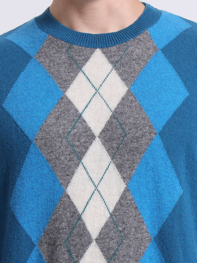 A striking blend of cool ferozi blue and warm neutrals, this lambswool pullover updates the classic Argyle with fresh vibrance. The geometric diamonds are woven for texture and precision, offering a refined statement piece that balances boldness with understated elegance. Perfect for both weekend gatherings and city evenings.