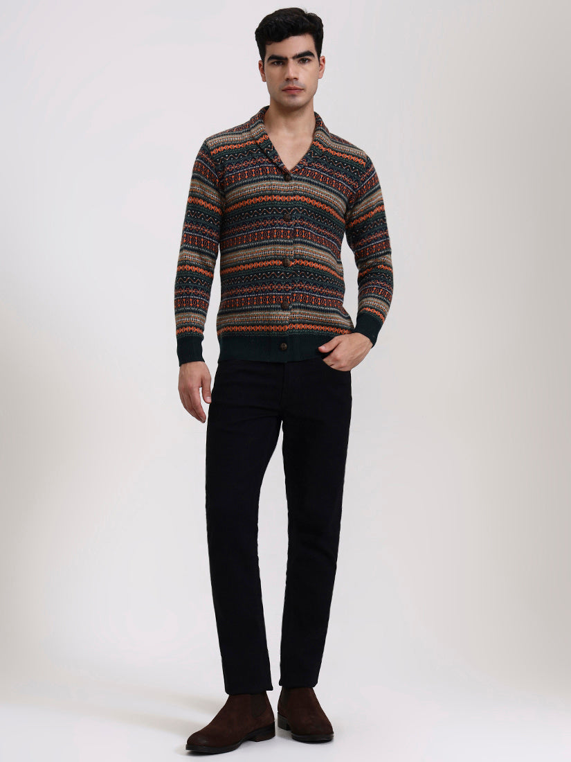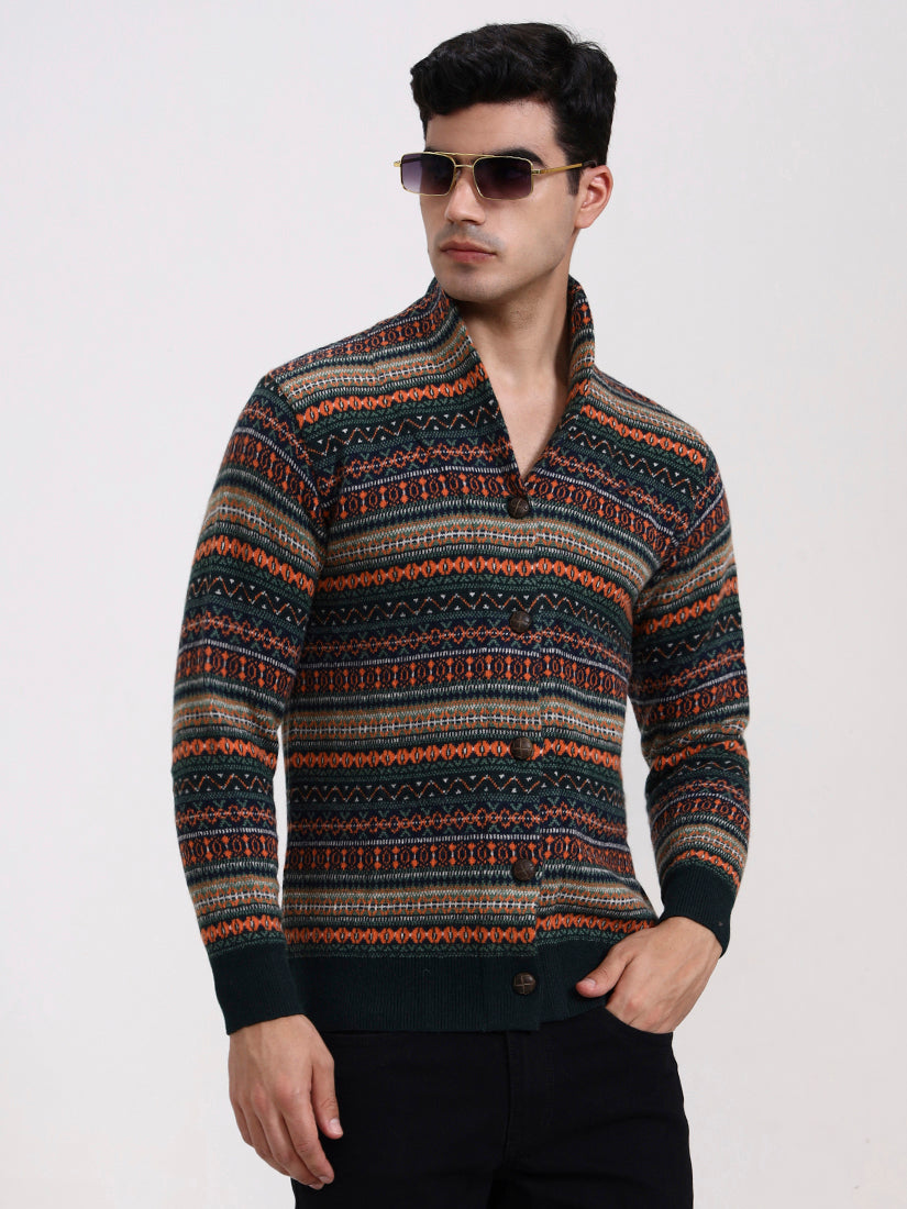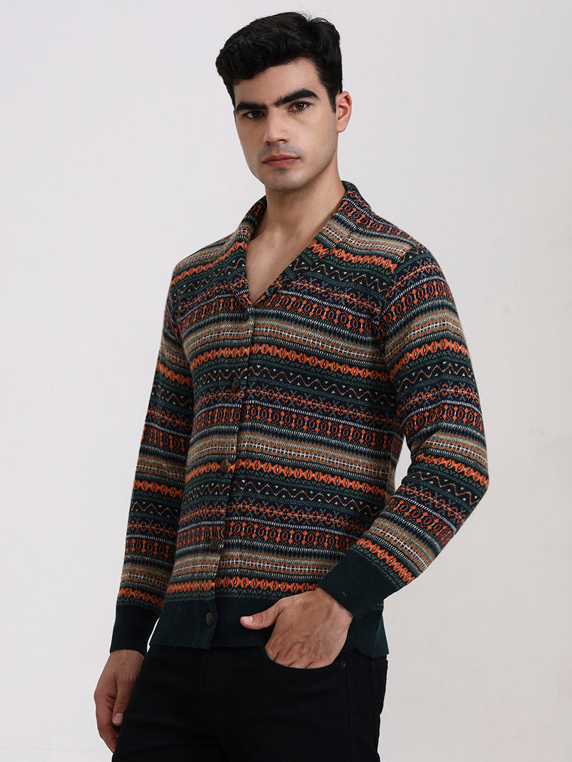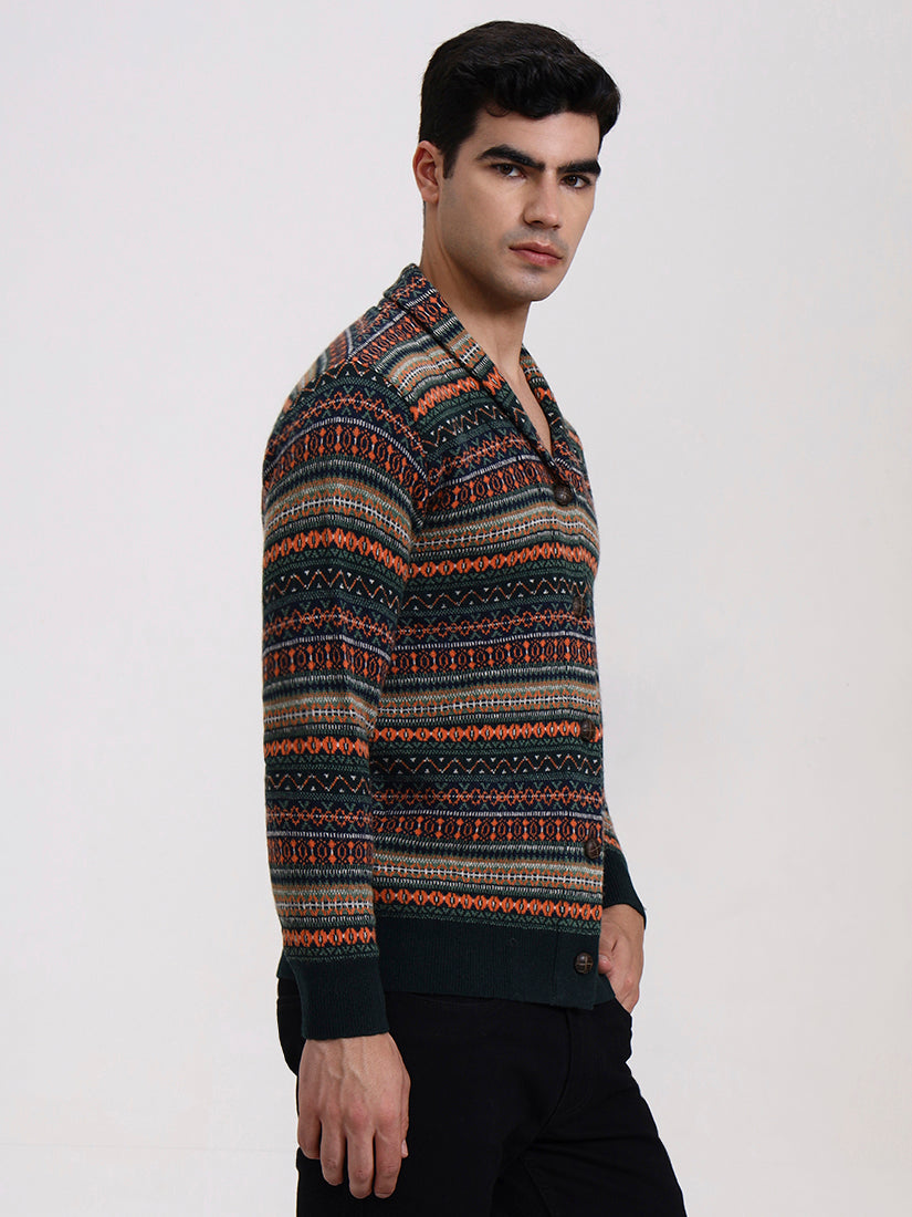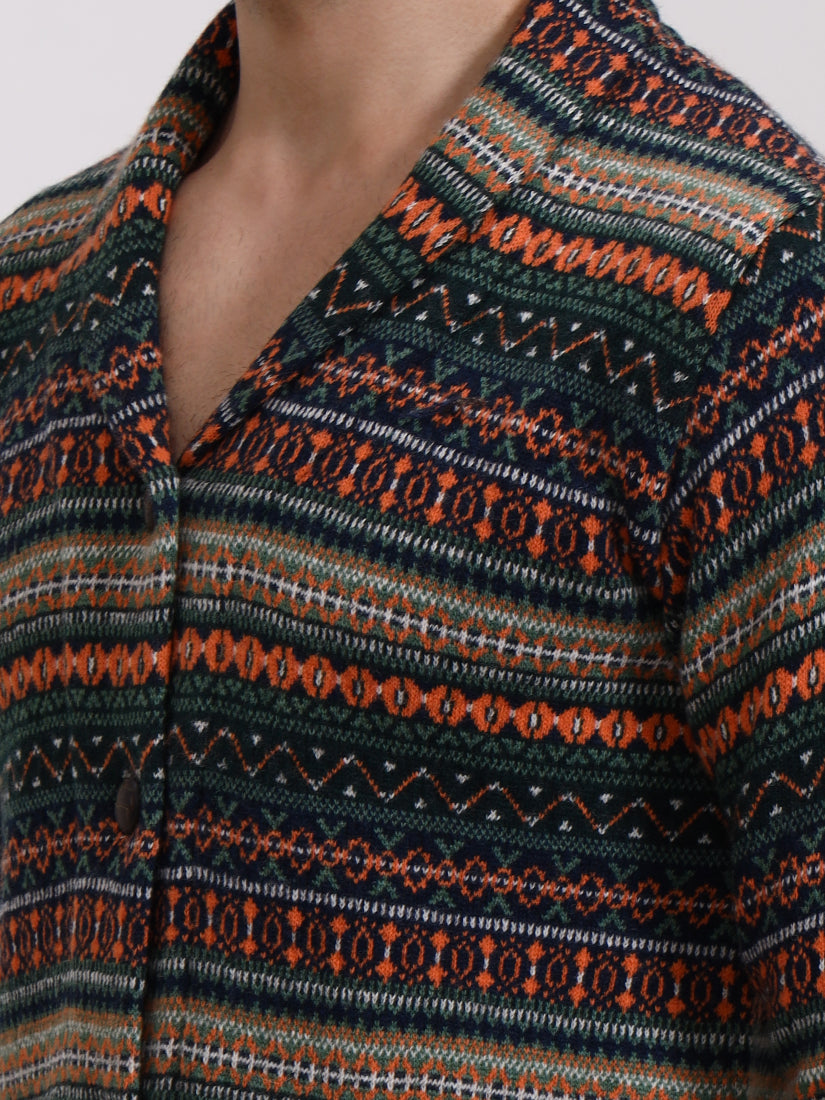 Deep bottle green accented with understated rustic motifs in warm ochres and cool navy tones. A sophisticated yet casual layering piece that evokes the richness of autumn woodlands.