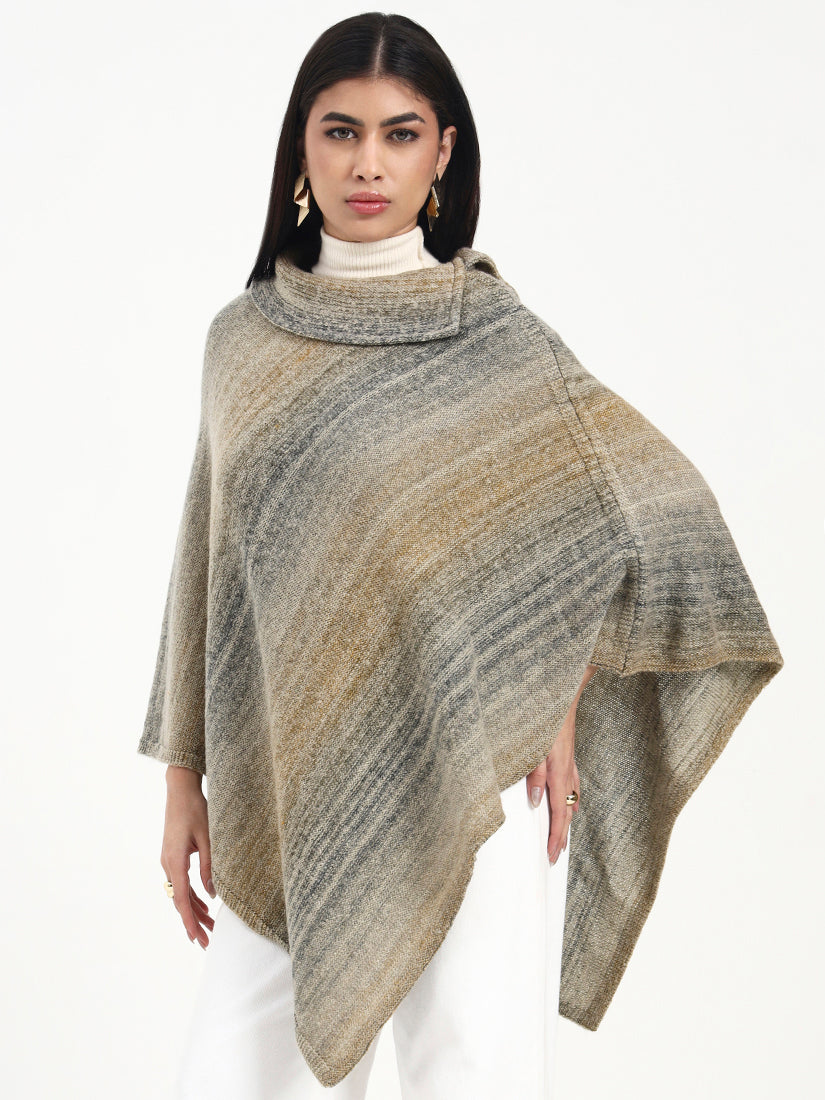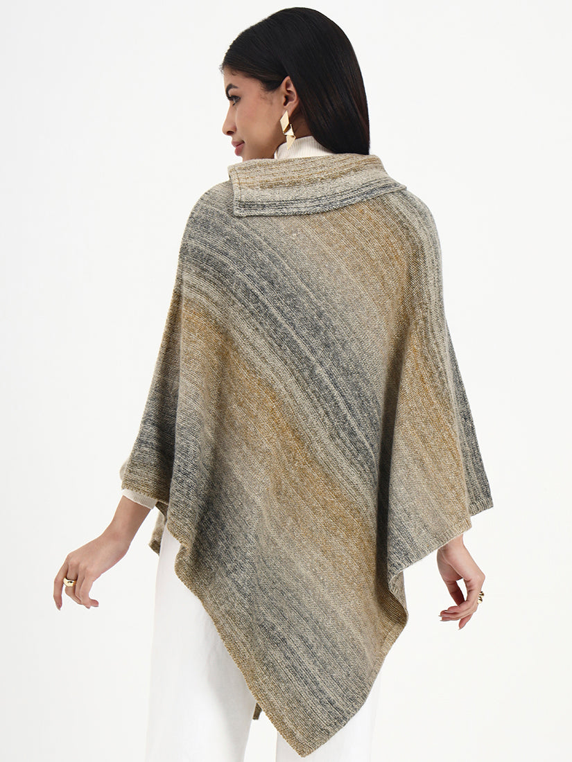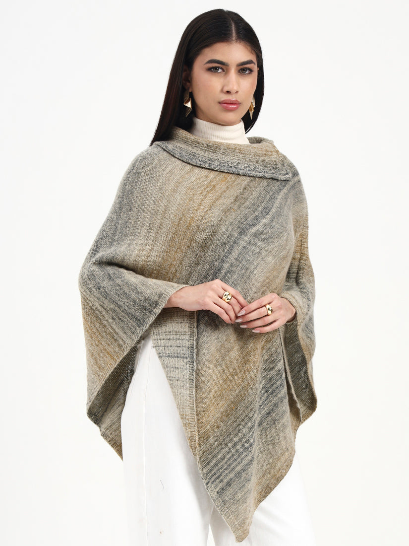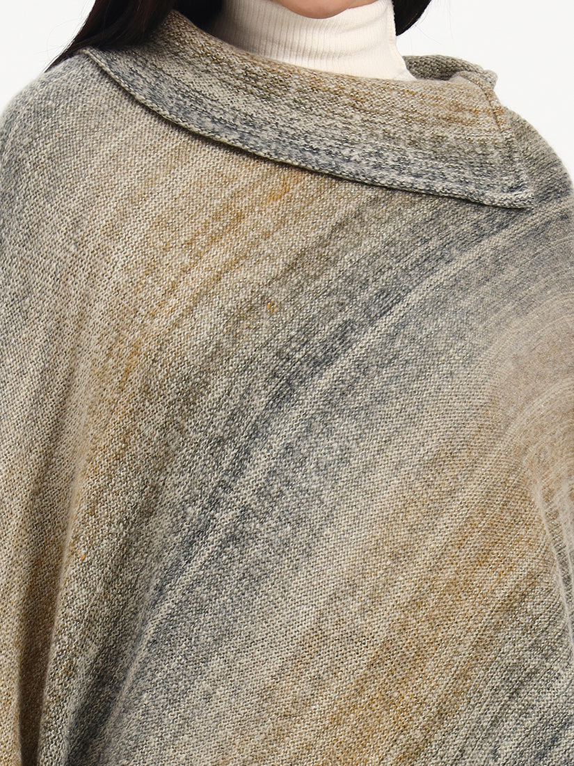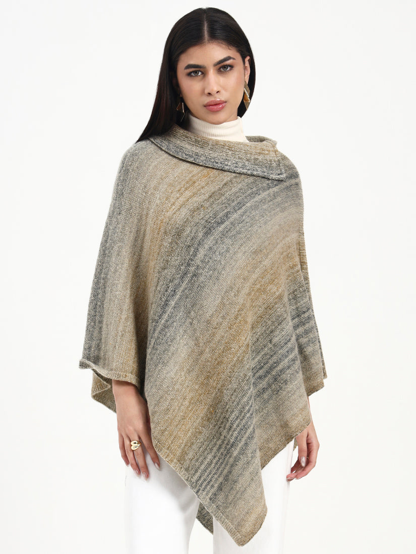 Softly heathered brown tones blend with muted grey undertones, giving this poncho a naturally weathered elegance. The textured knit drapes with ease, offering warmth and quiet sophistication in a silhouette designed for effortless, everyday refinement.