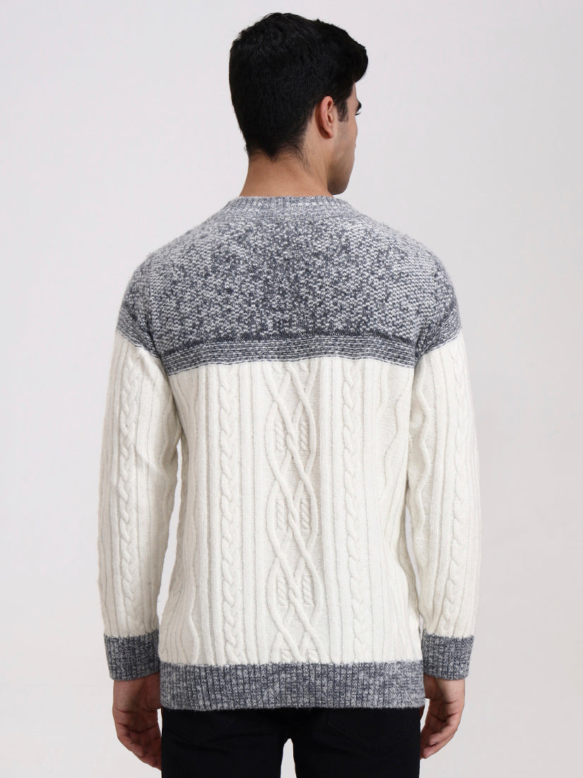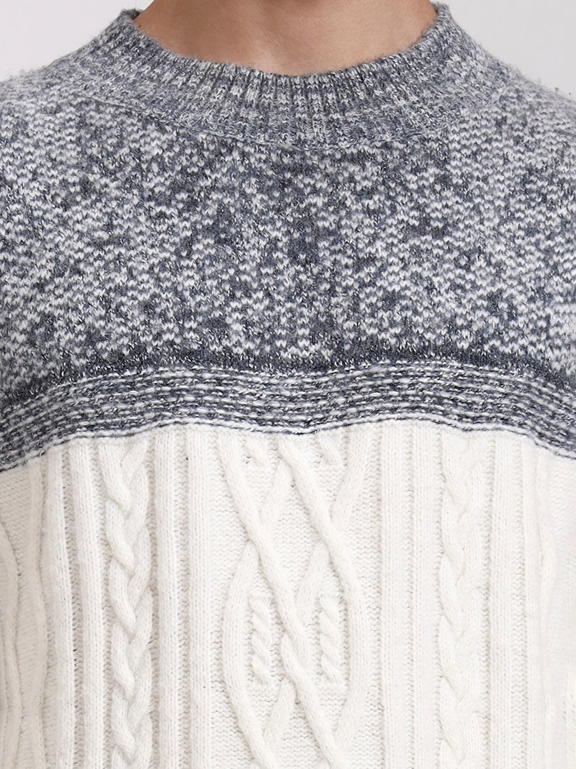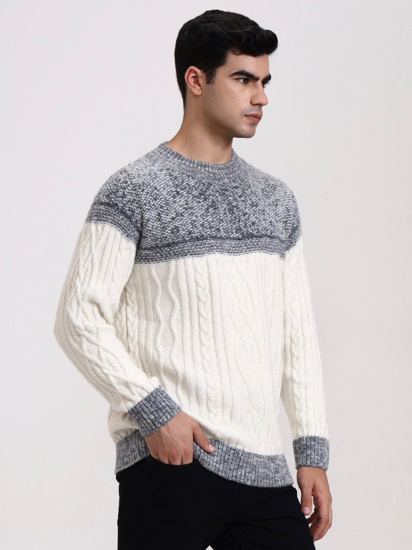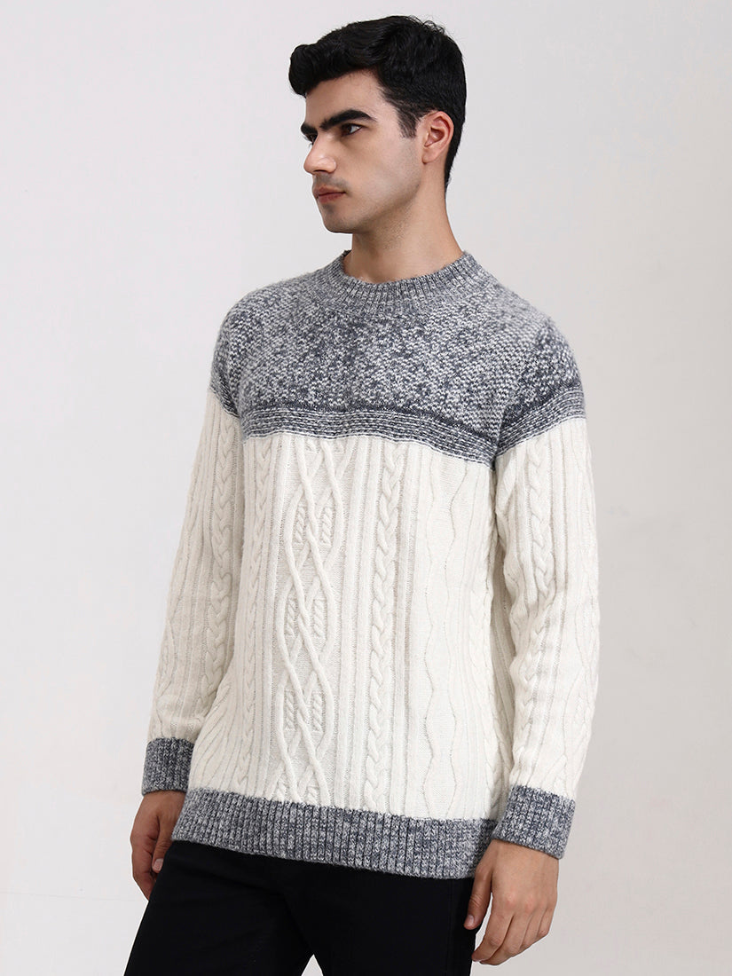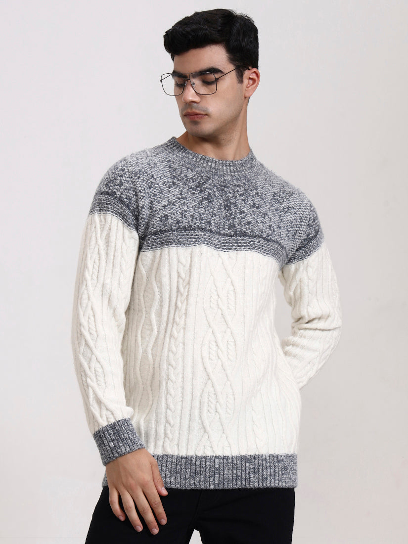 A crisp off-white body contrasted with soft ash-grey detailing across the shoulders and hem. Clean, winter-bright, and versatile, it blends contemporary refinement with timeless knit artistry.
