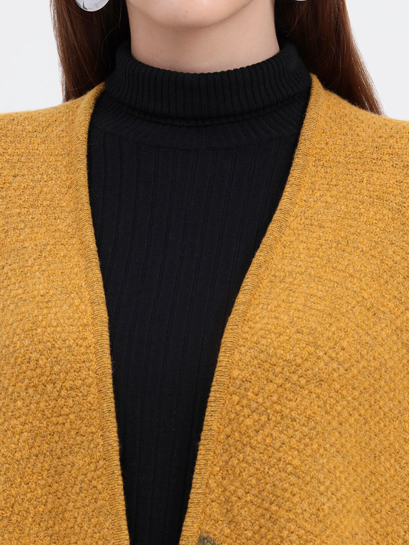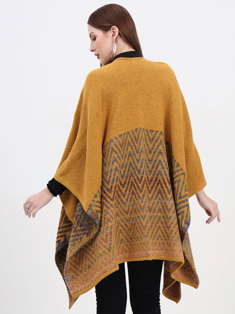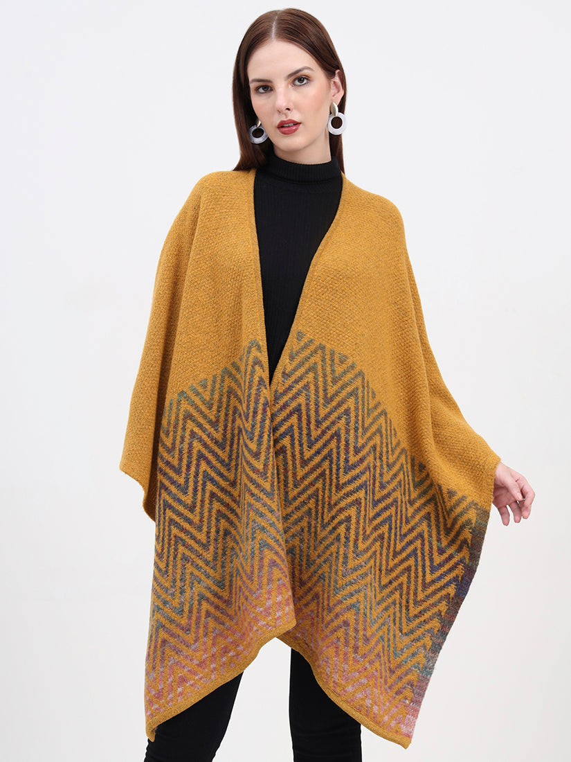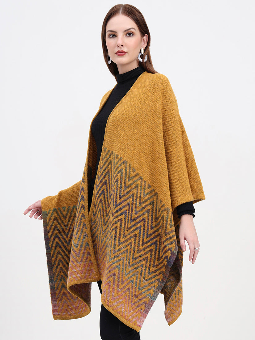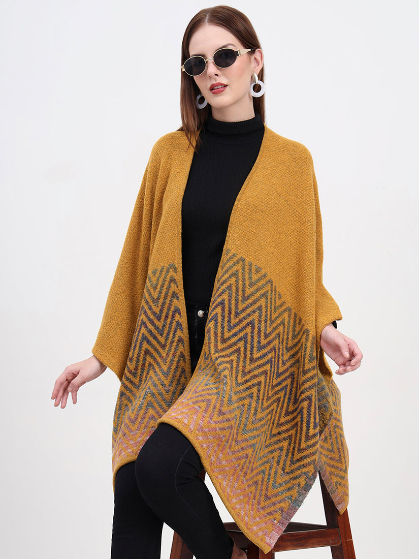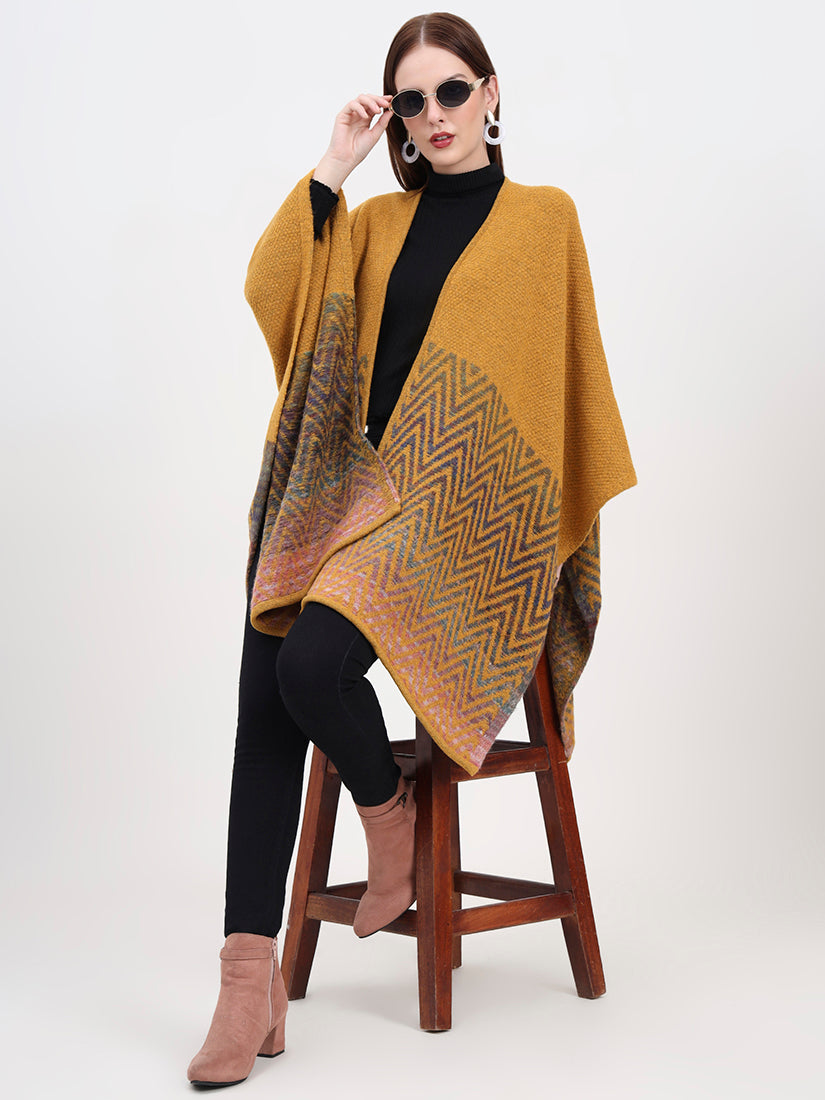 Experience refined artistry with the Golden Ember Chevron Cape. Crafted in premium wool blends, its radiant mustard hue meets intricate chevron patterns, creating a versatile statement of elegance for every season.