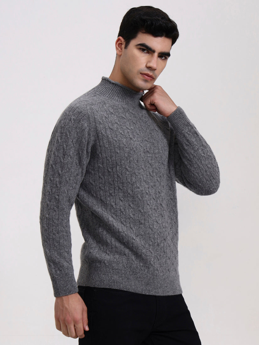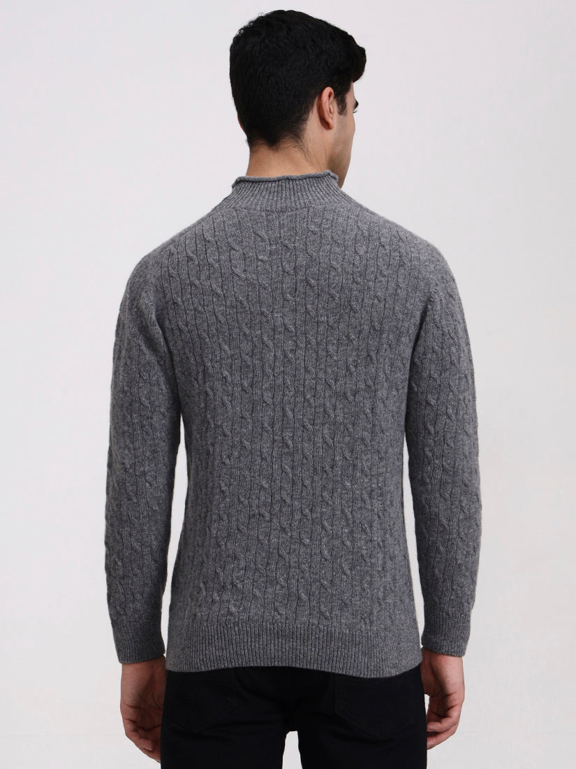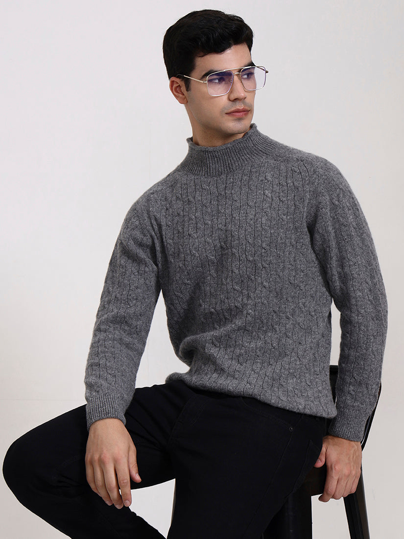 A timeless neutral shade, recalling stone ridges and mountain terrain. This grey cable knit in lambswool pairs seamlessly with casual denim or tailored trousers for enduring elegance.