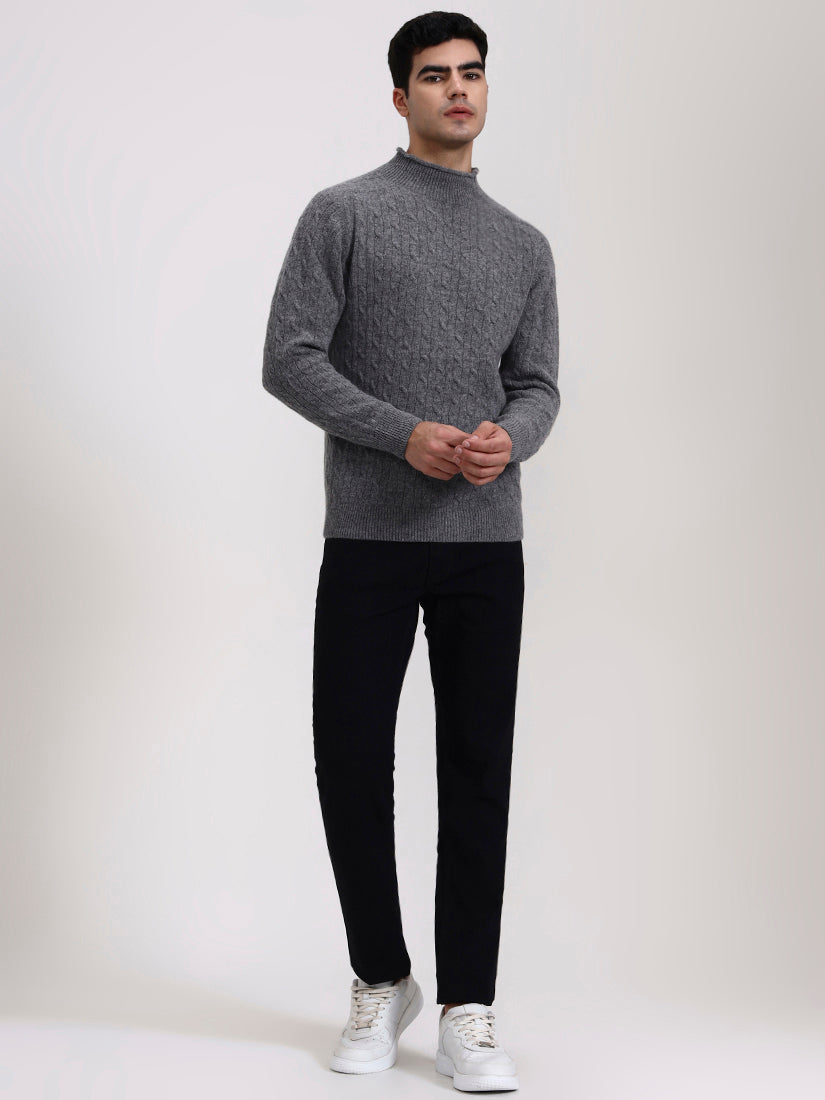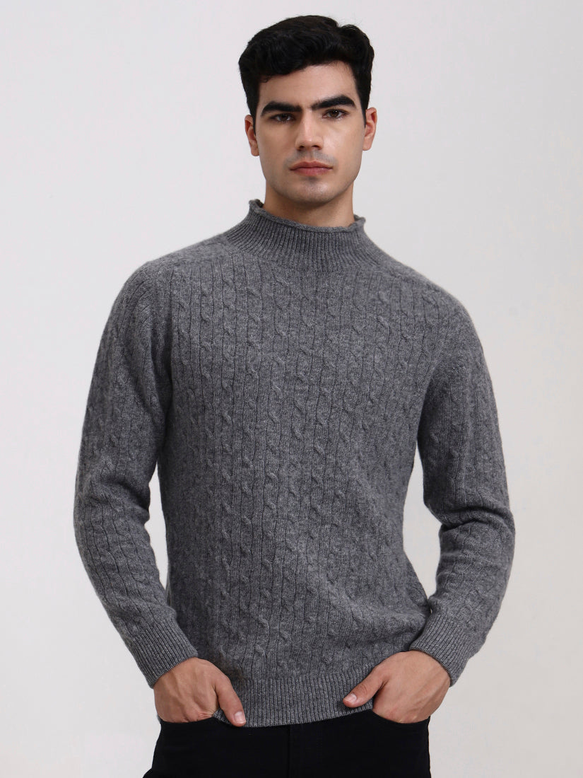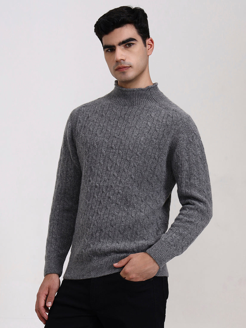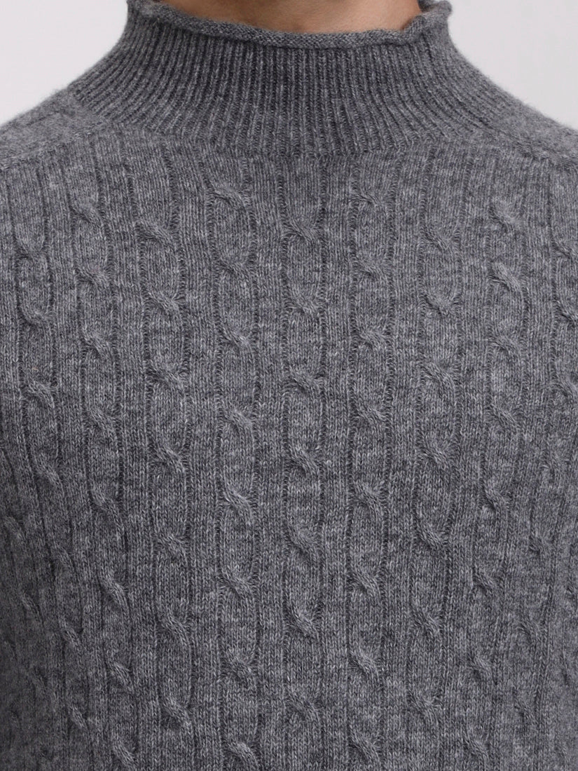 A timeless neutral shade, recalling stone ridges and mountain terrain. This grey cable knit in lambswool pairs seamlessly with casual denim or tailored trousers for enduring elegance.