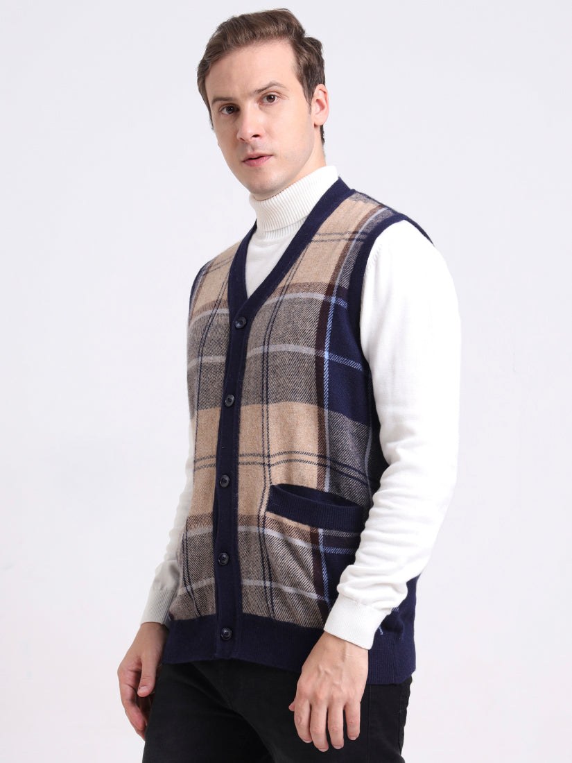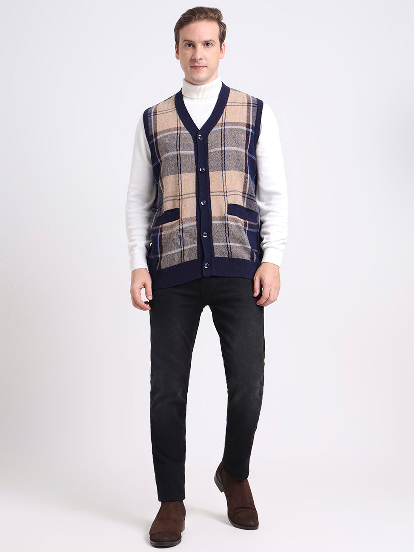 A sleeveless interpretation in deep navy with heritage checks, designed for layering over shirts or turtlenecks. Lightweight yet warm, with functional pockets and button fastening for effortless refinement.