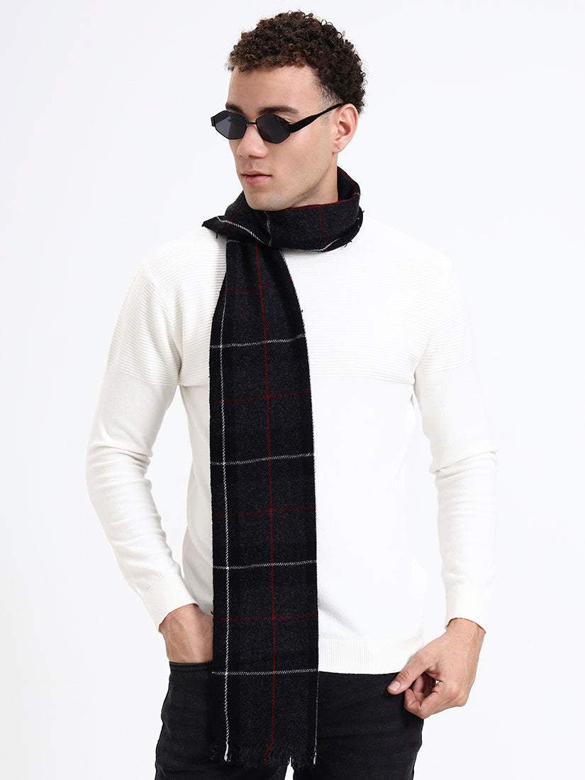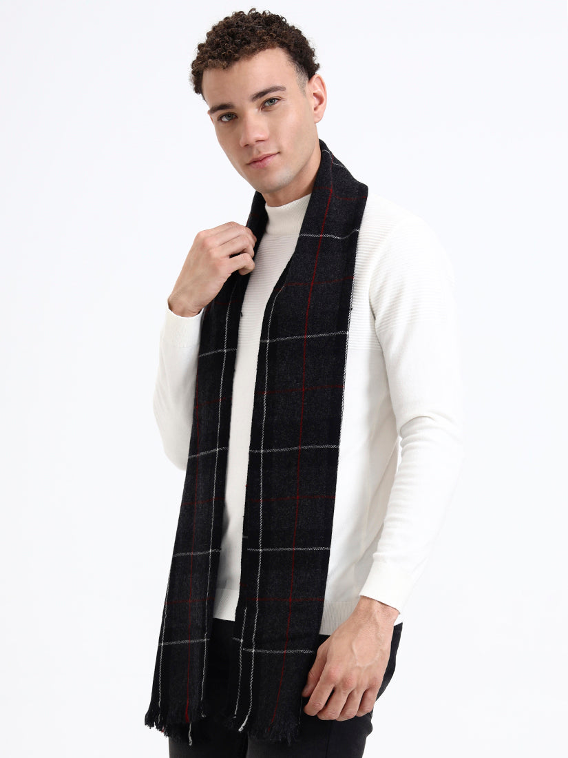 Crafted from pure Lambswool, this black checked scarf features fine red and white lines that add subtle contrast to its classic design. With a soft brushed texture and elegant drape, it’s a timeless piece of warmth and sophistication.