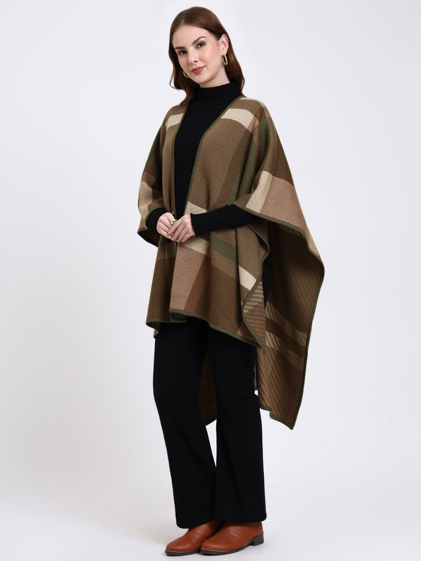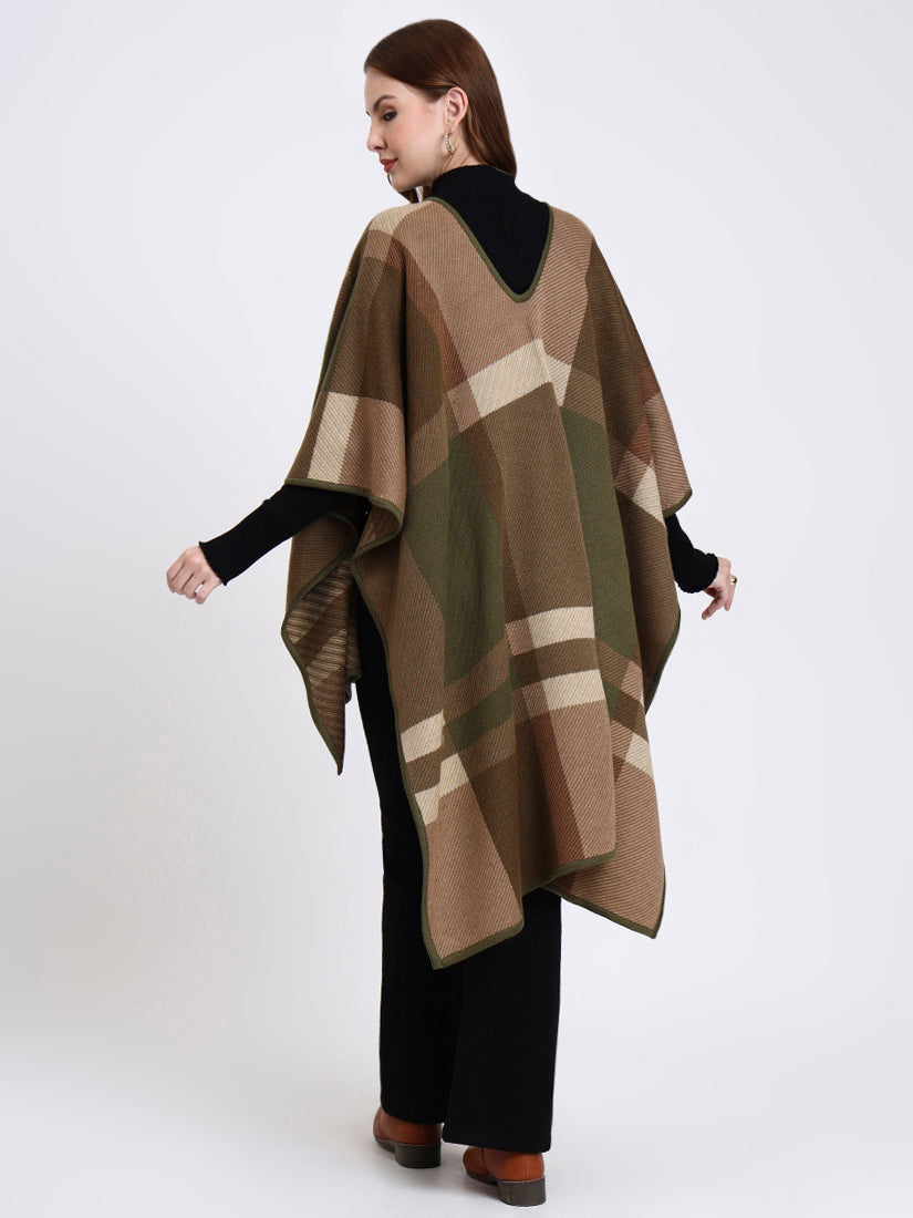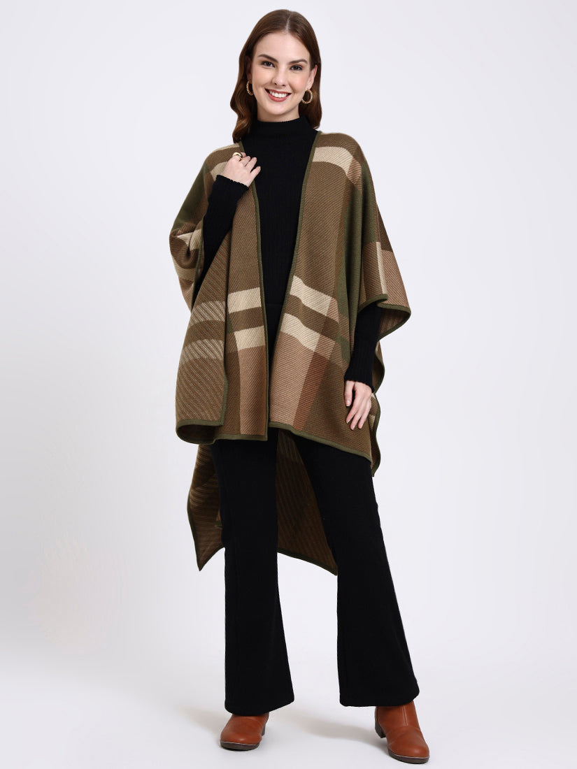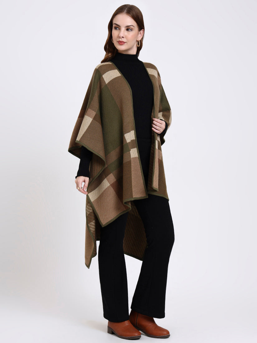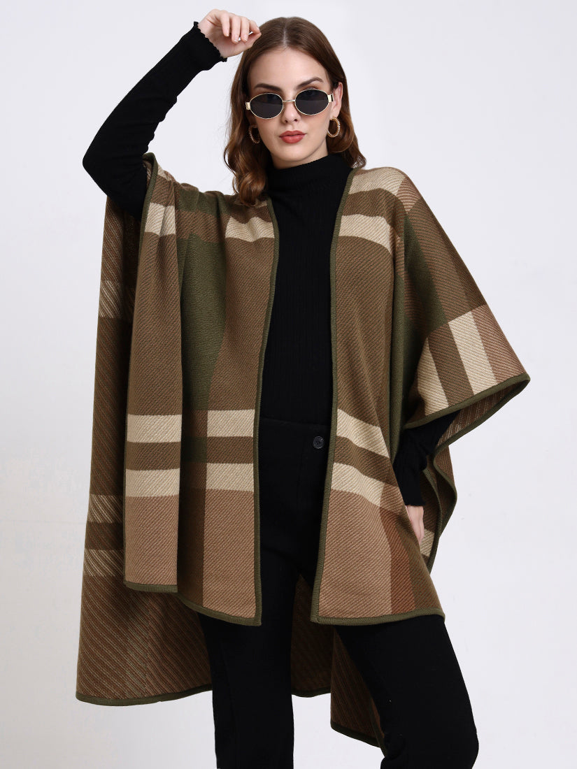 The Highland Grove Cape reflects understated English refinement, blending fawn and olive in sweeping checks that echo timeless landscapes. Its muted palette makes it an endlessly versatile companion for both travel and everyday sophistication.