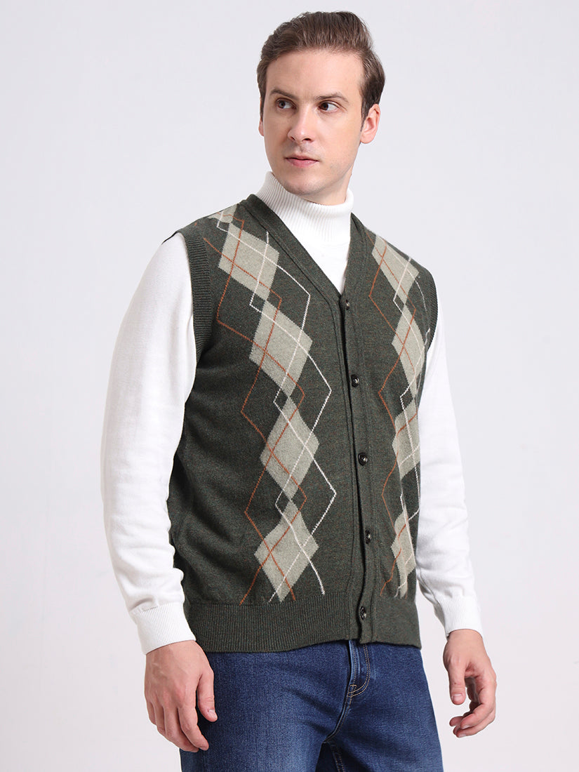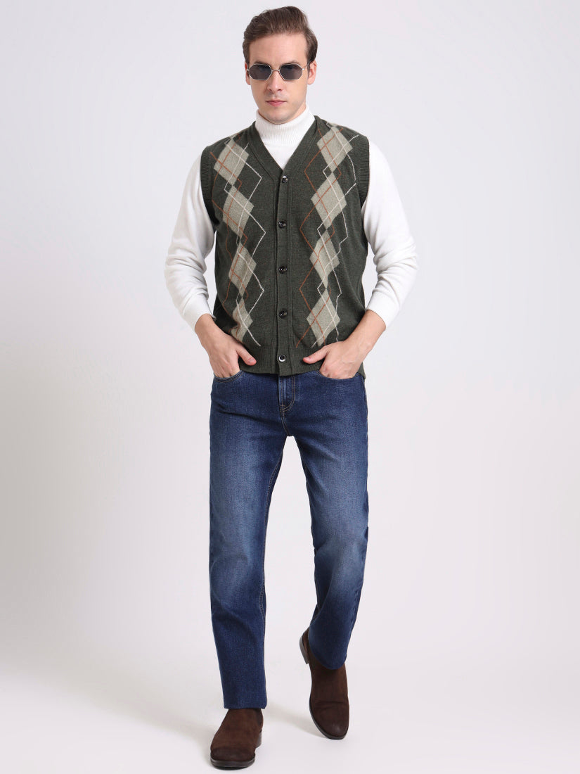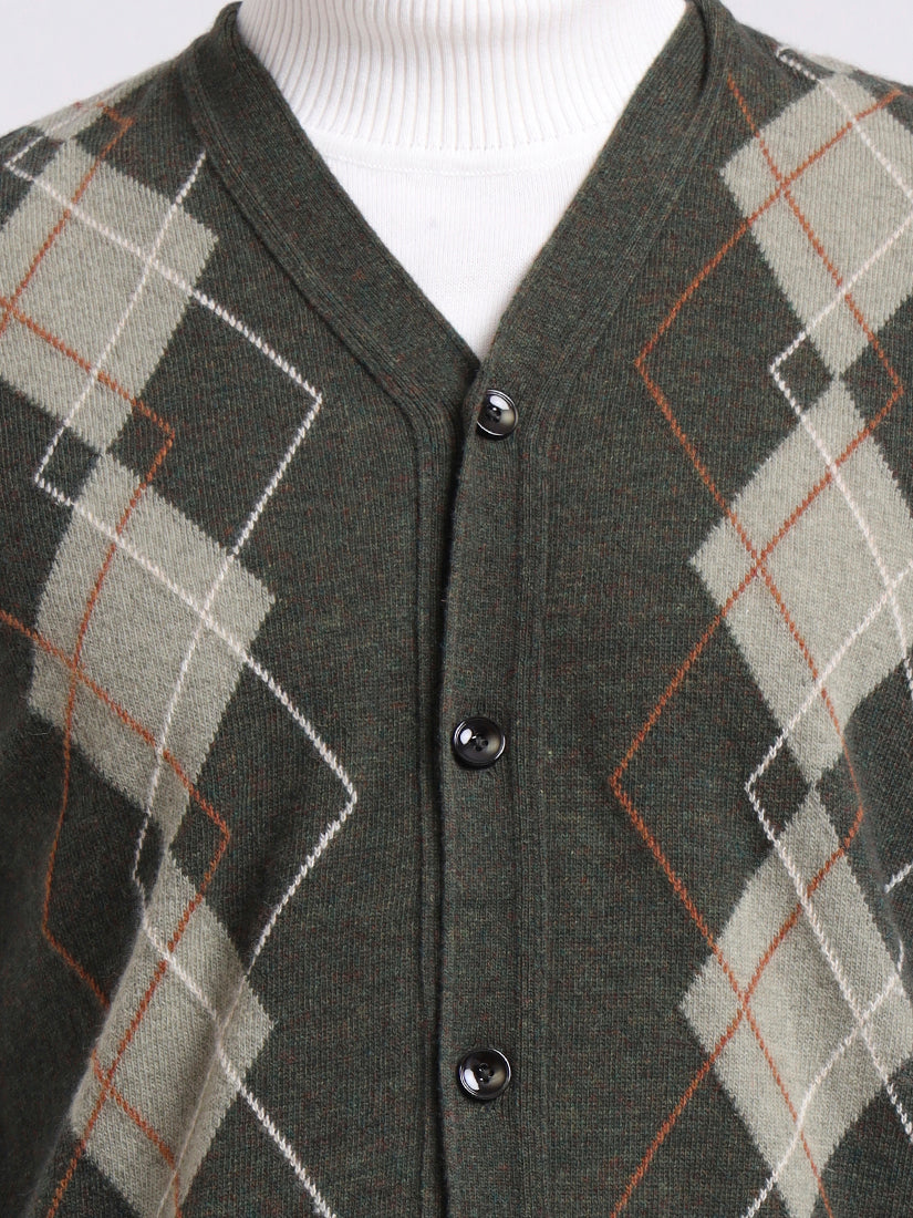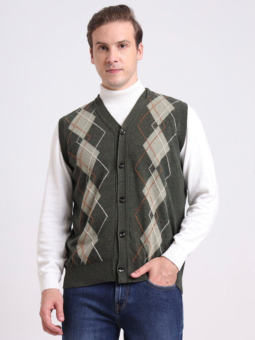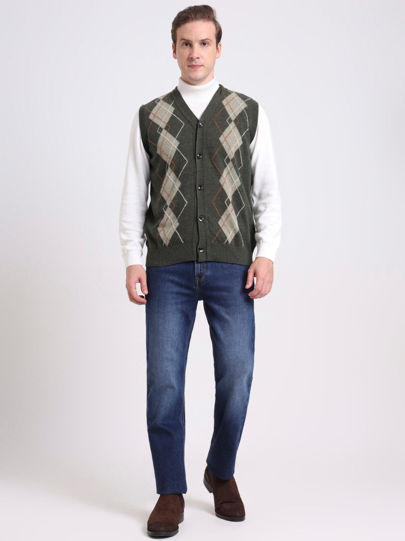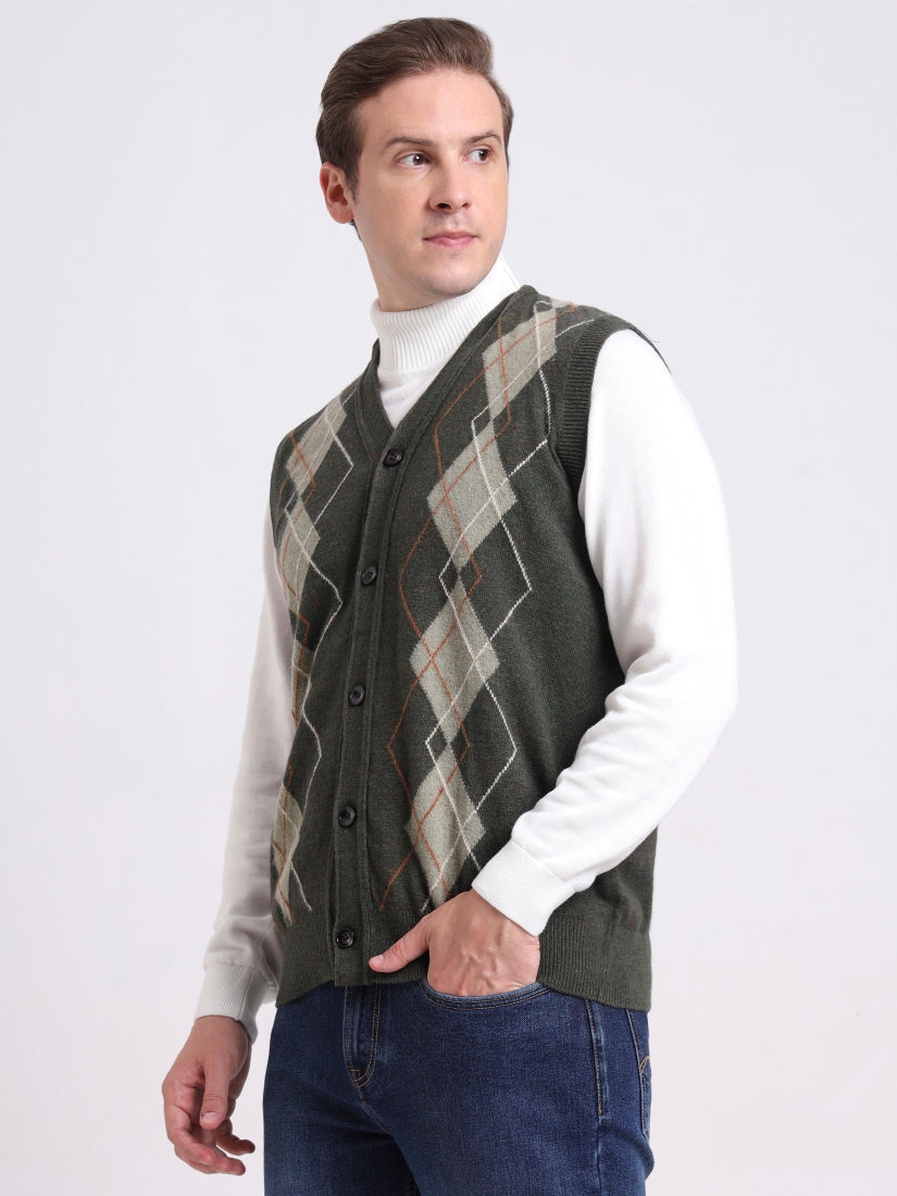 A muted olive shade enriched with soft argyle contrasts, this half-sleeve vest layers effortlessly over shirts — evoking the mossy greens of Highland stone walls.