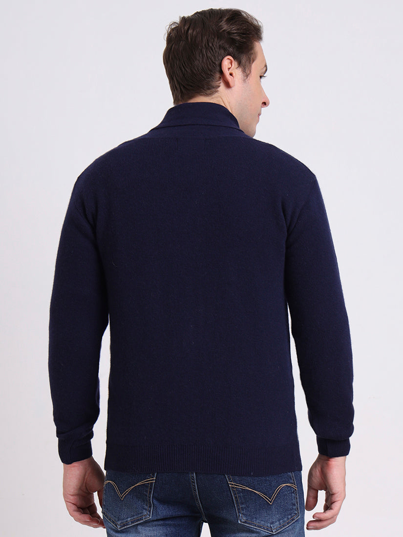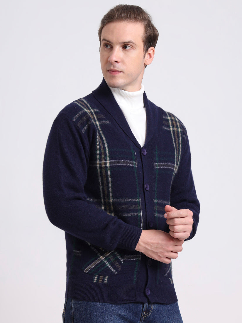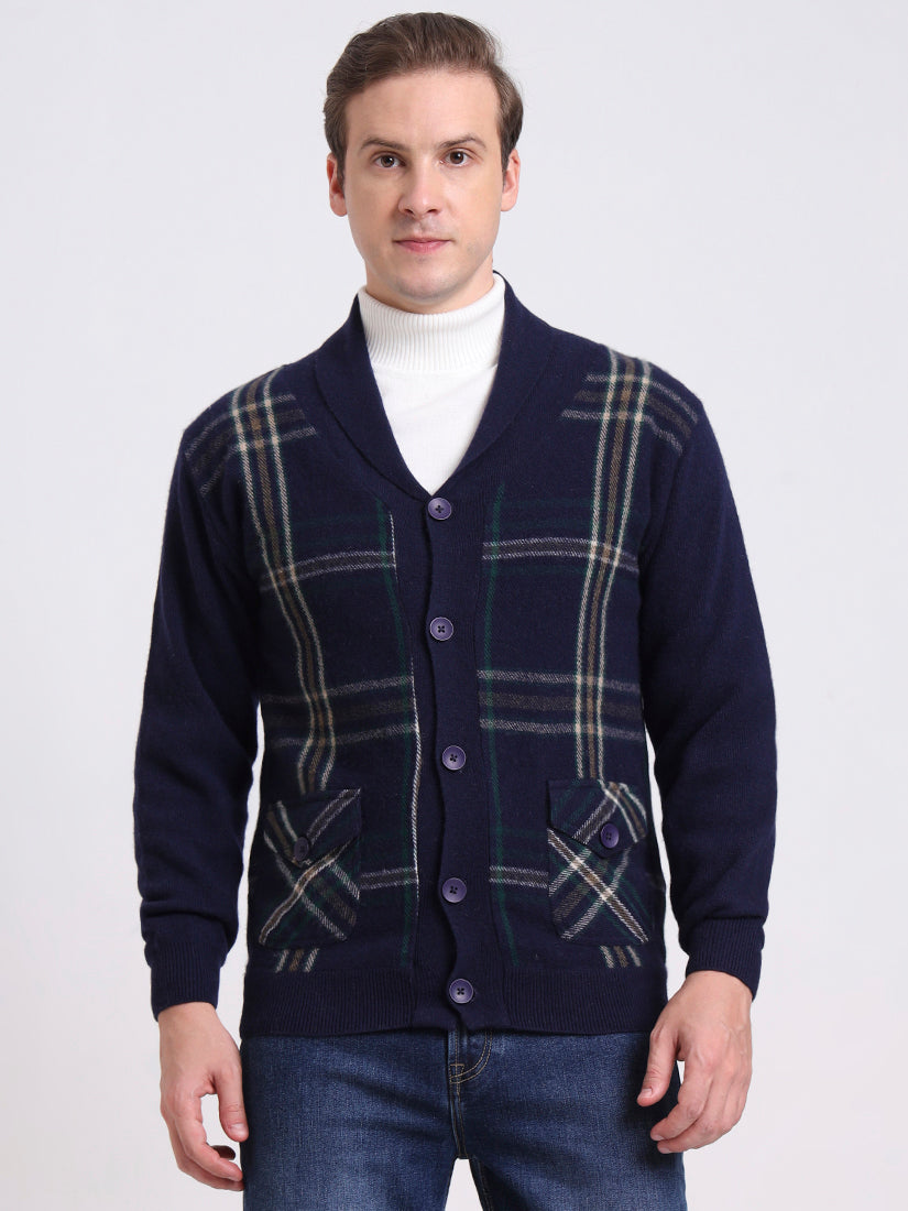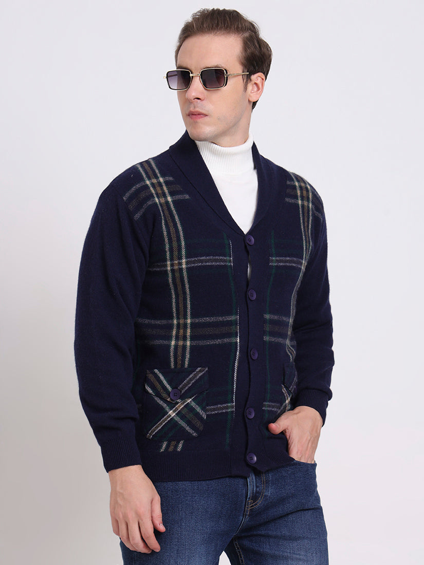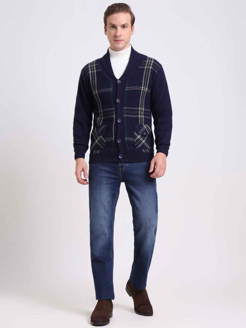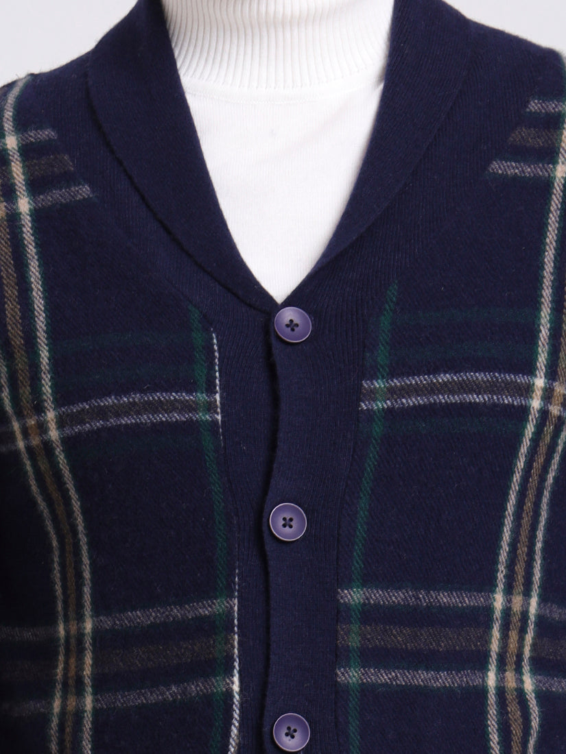 Classic navy adorned with refined checks for a contemporary twist on heritage dressing. The full buttoned front and tailored pockets make it ideal for both casual layering and polished evening ensembles.
