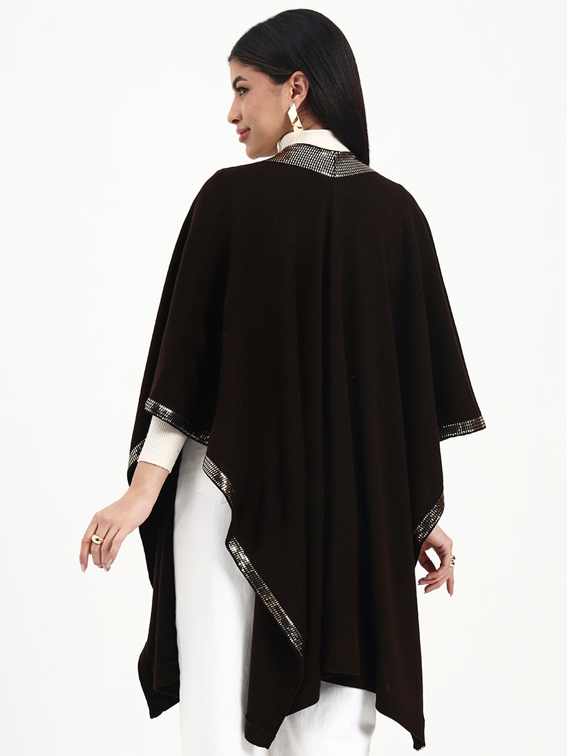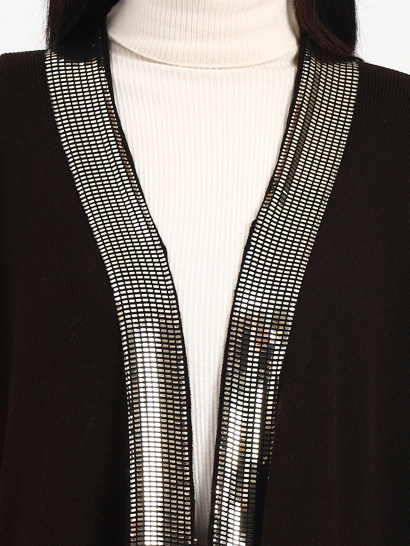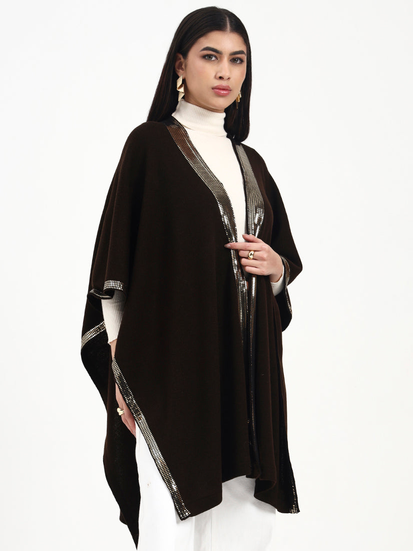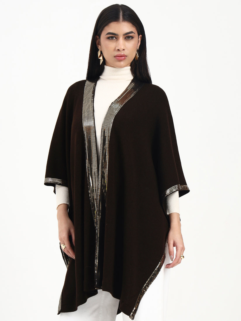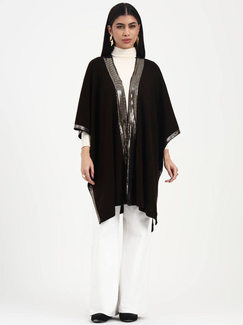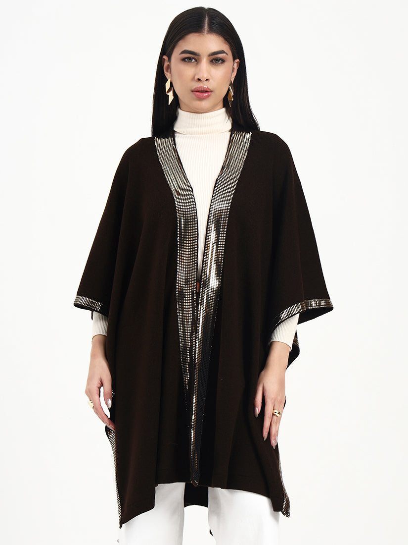 This open-front cape is crafted in a deep dark brown base, elevated by a luminous sequin trim that catches the light with every movement. Balanced by a fluid fall and clean, minimal construction, it delivers refined drama while remaining effortlessly versatile for day-to-evening wear.