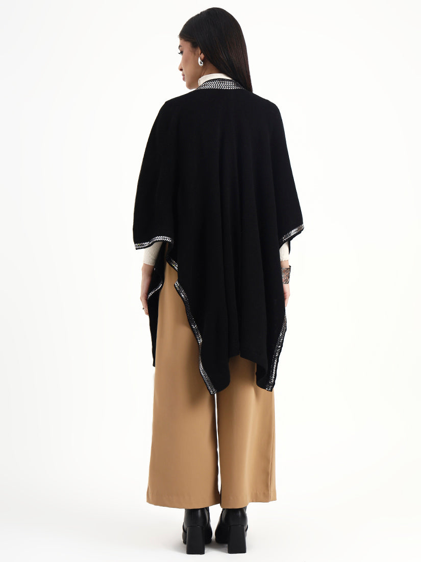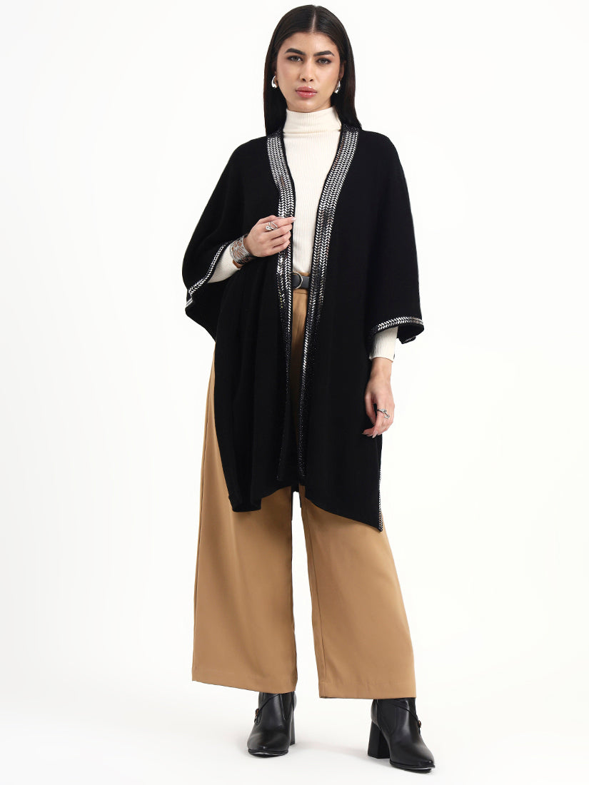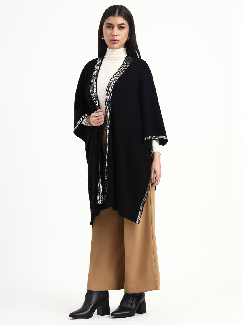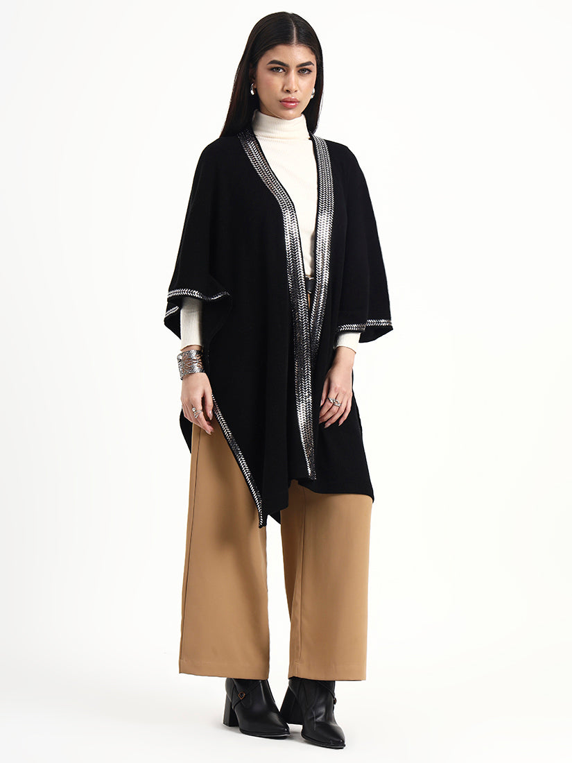 A fluid open-front cape in a black base, defined by clean lines and a finely textured metallic border that frames the silhouette with restraint. Designed to drape softly over winter layers, it brings quiet structure and modern elegance to day-to-evening dressing.