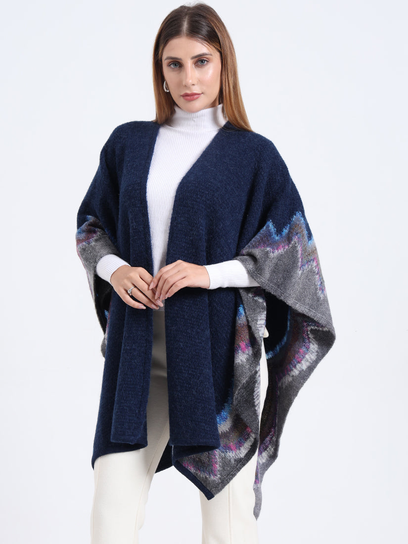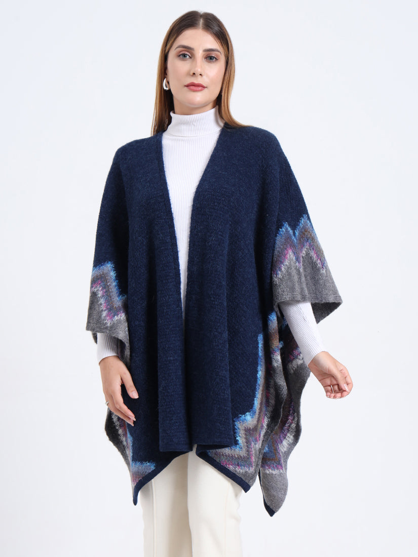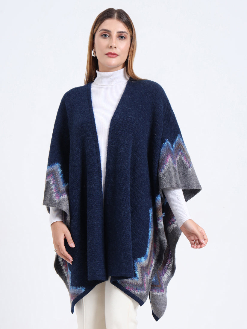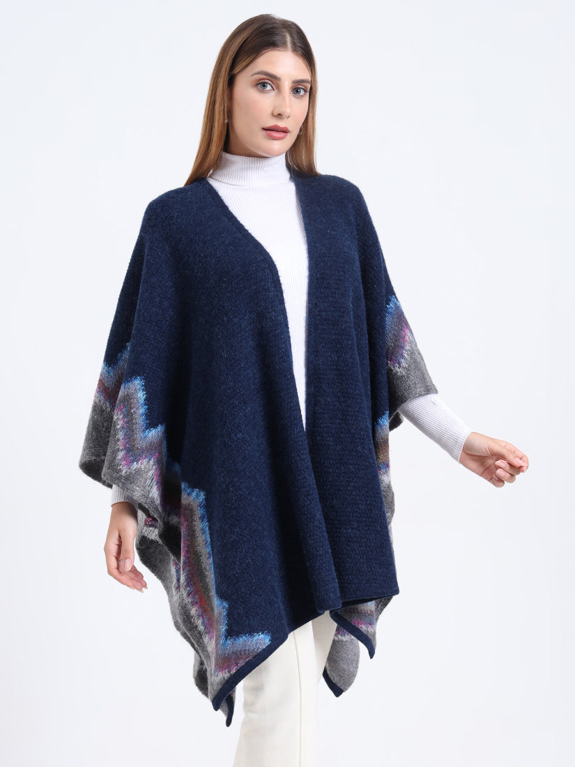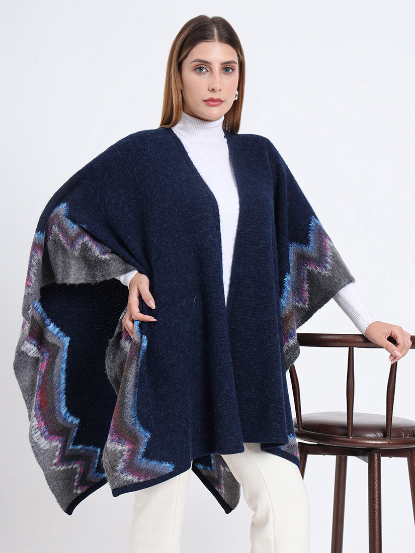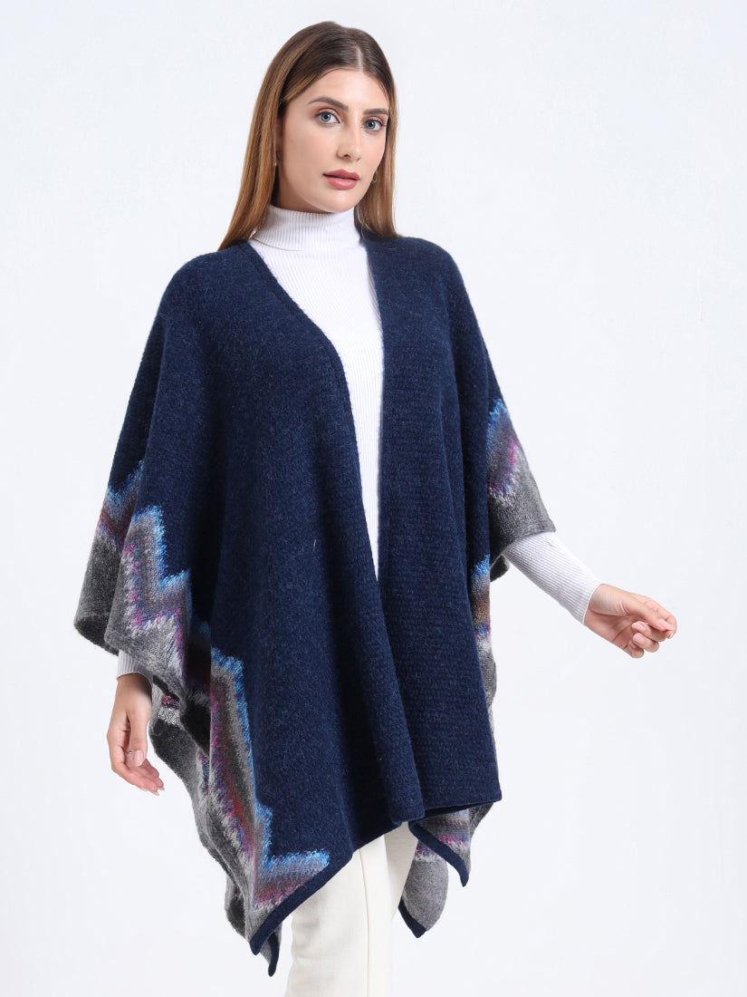 Wrap yourself in timeless sophistication with the Midnight Aurora Cape. Crafted from luxurious wool blends, its deep navy drape is accented with iridescent chevron edges, echoing the beauty of northern skies while offering warmth, softness, and effortless elegance.