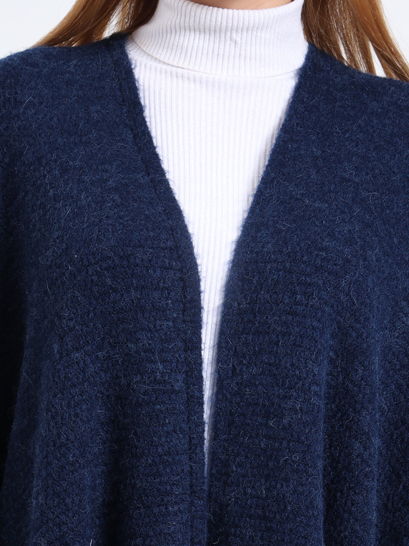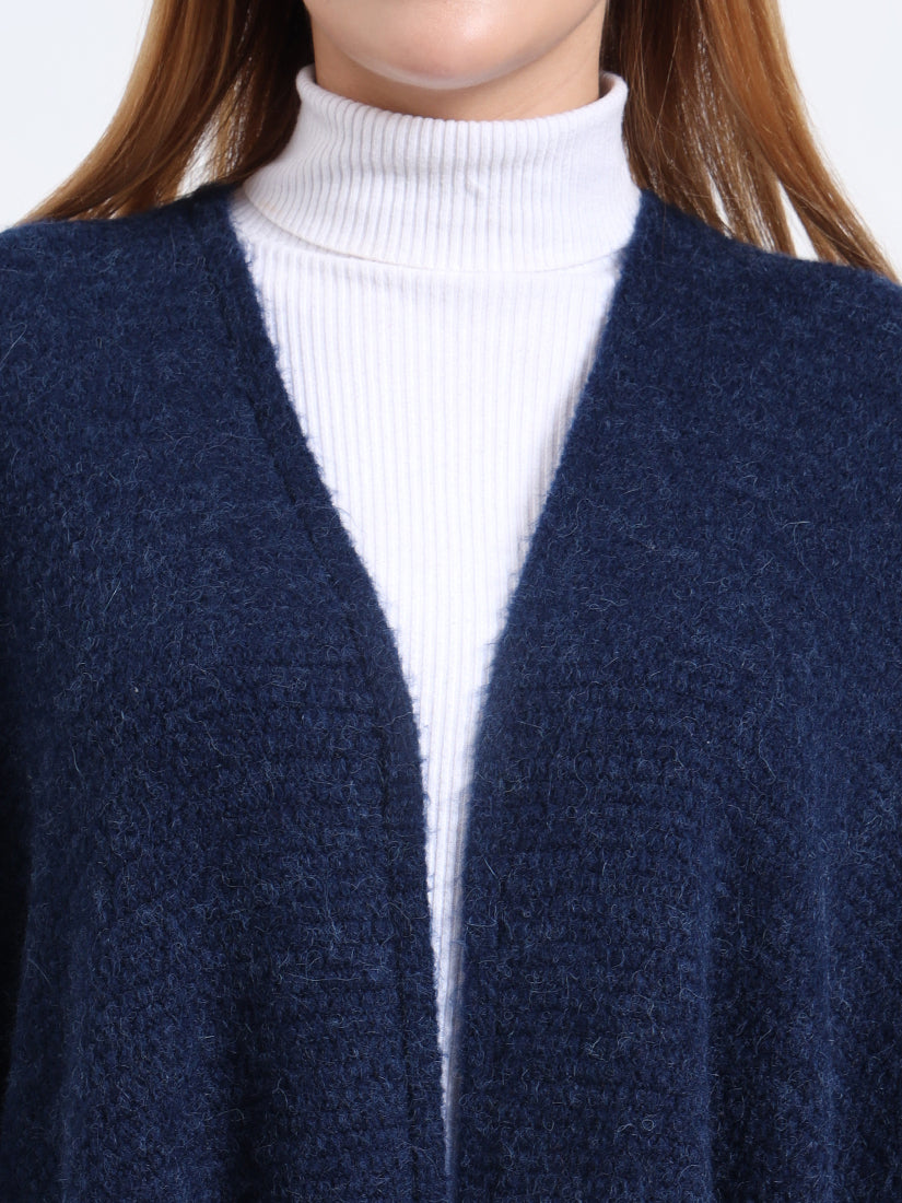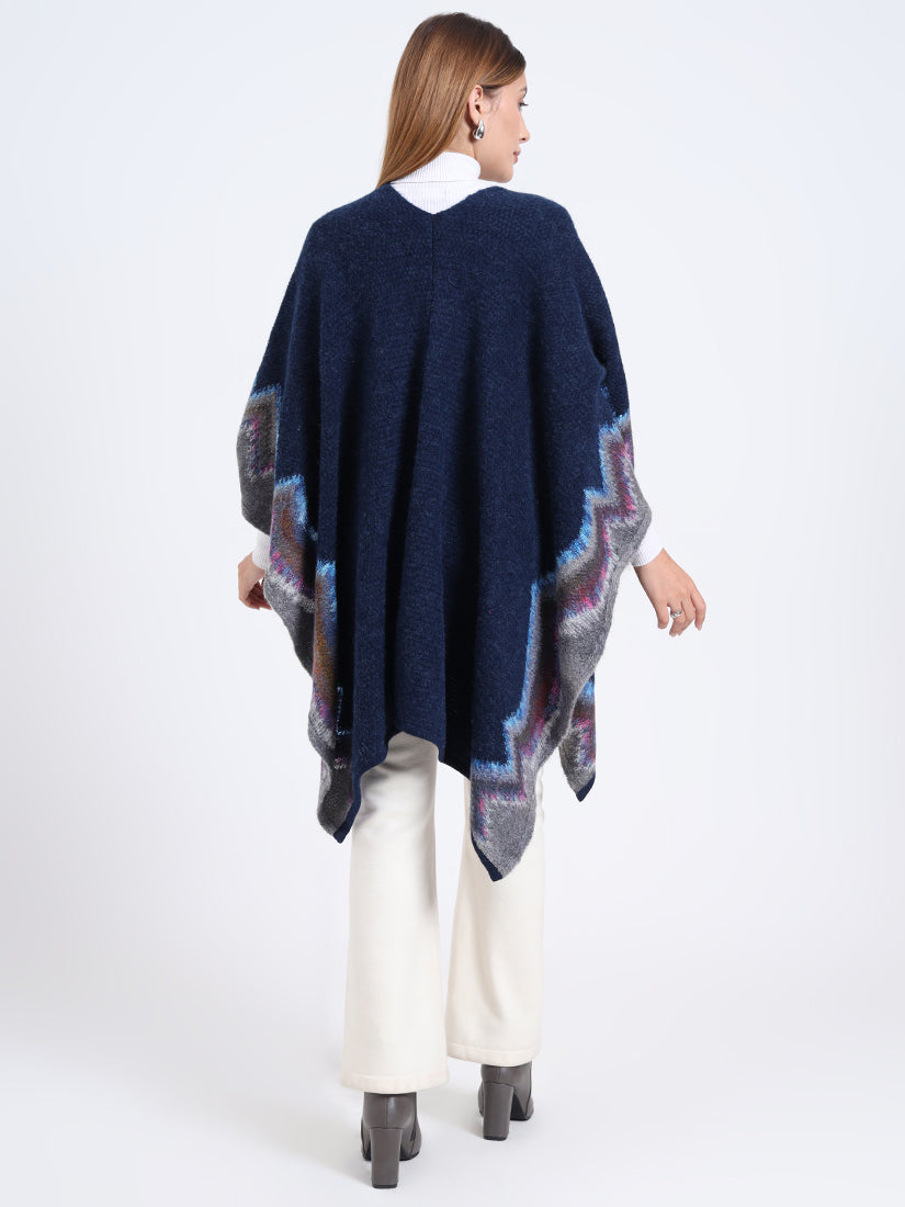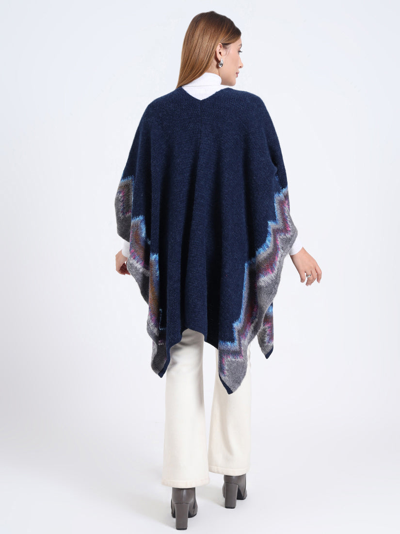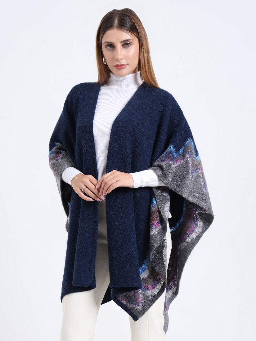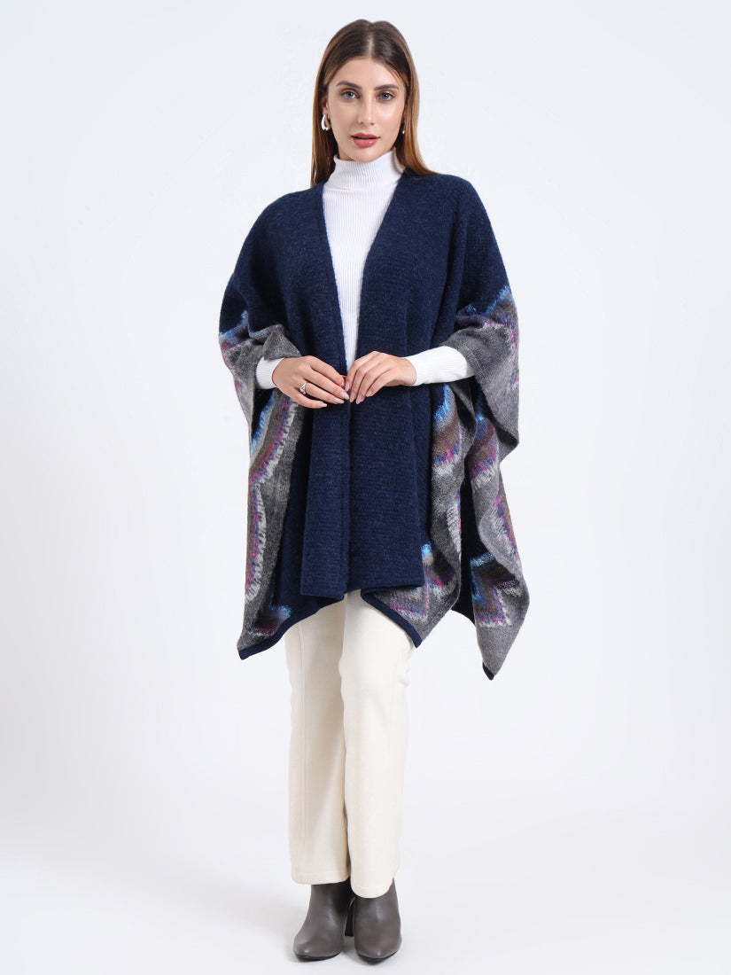 Wrap yourself in timeless sophistication with the Midnight Aurora Cape. Crafted from luxurious wool blends, its deep navy drape is accented with iridescent chevron edges, echoing the beauty of northern skies while offering warmth, softness, and effortless elegance.