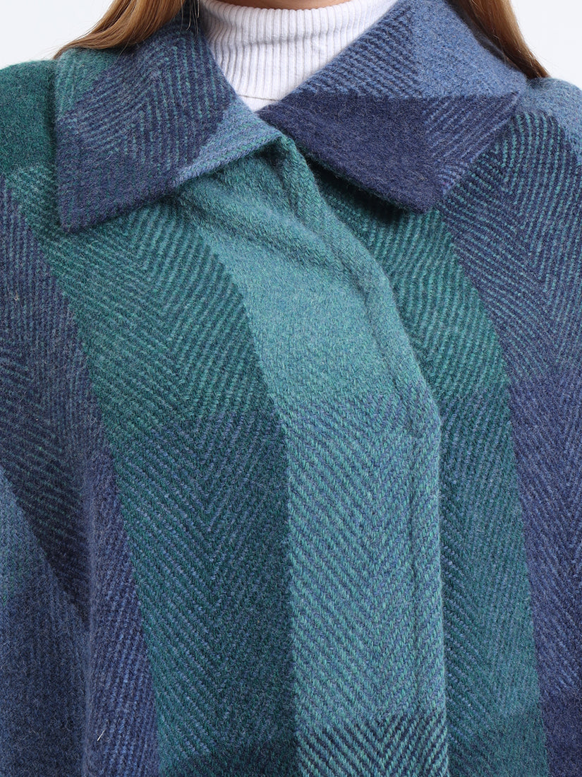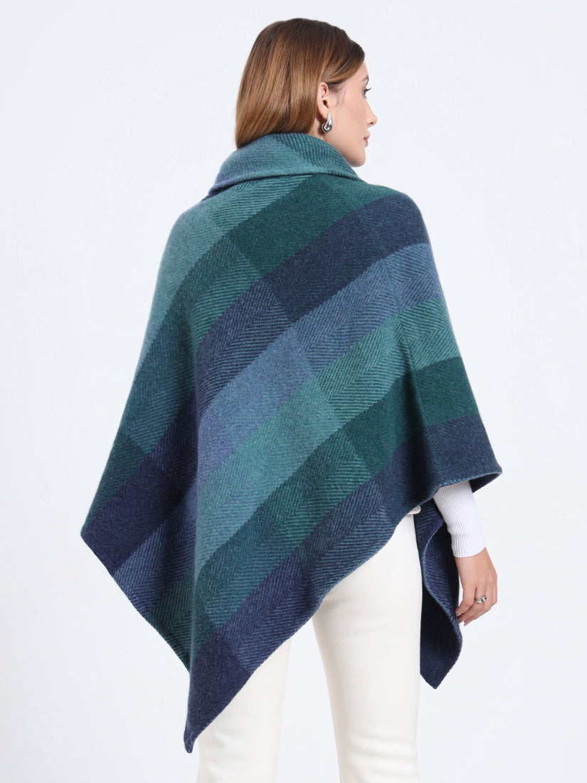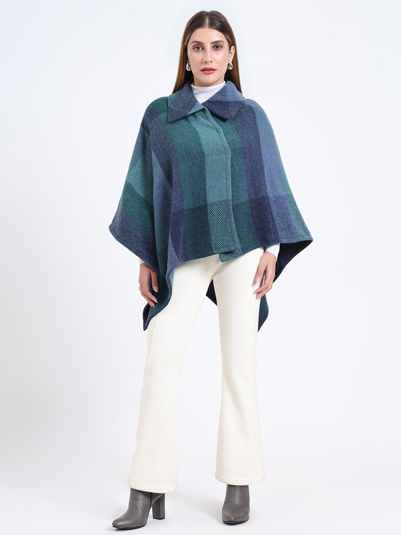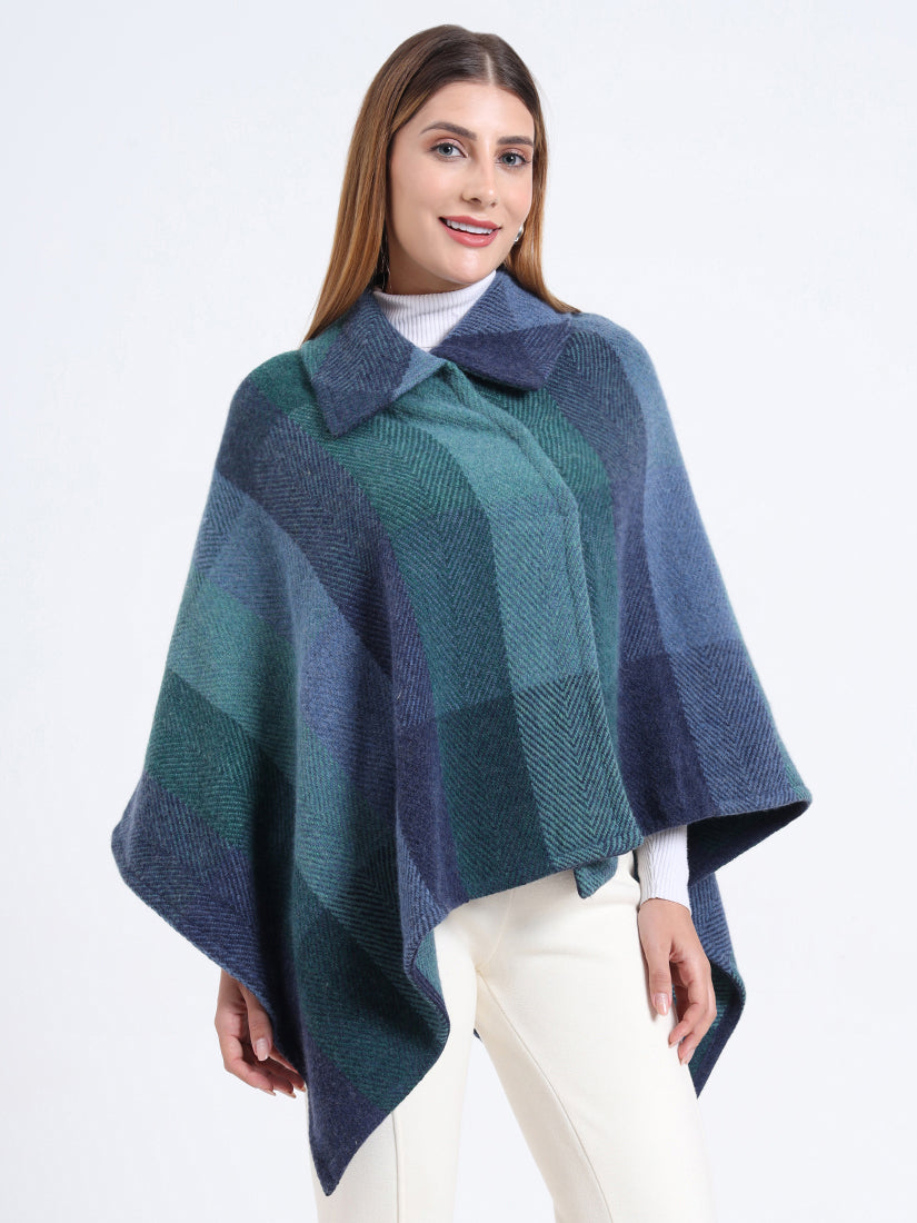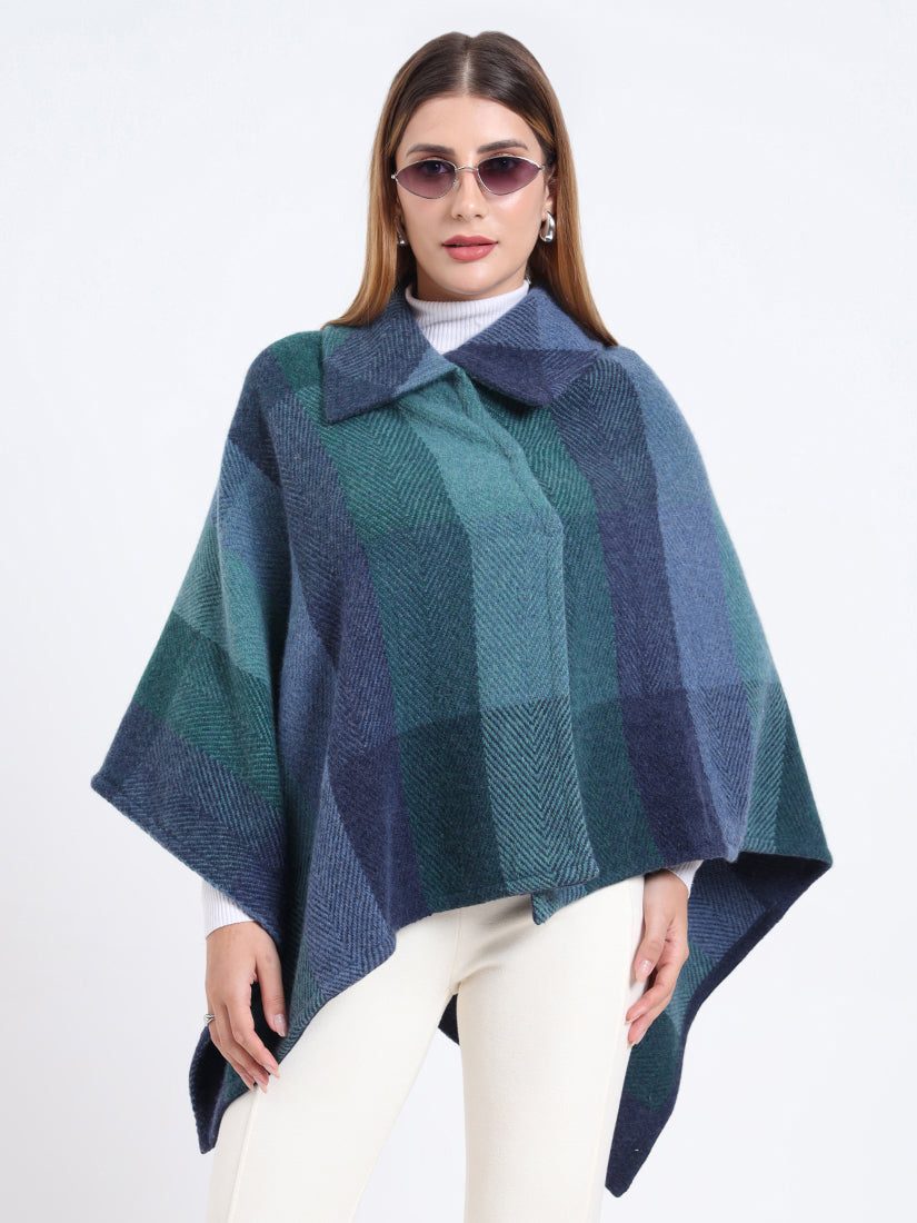 The Midnight Check Poncho brings sophistication in deep navy with bold check accents. Finished with a tailored collar, it offers a polished silhouette perfect for both casual layering and refined evenings.