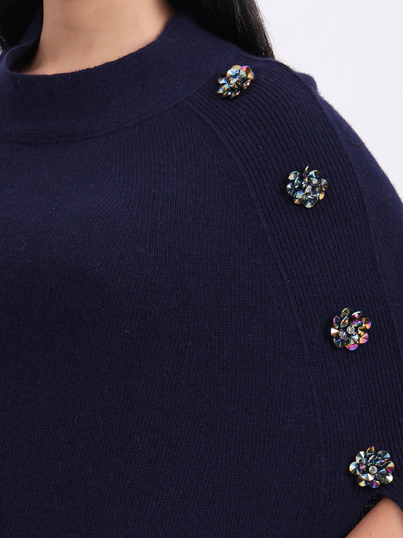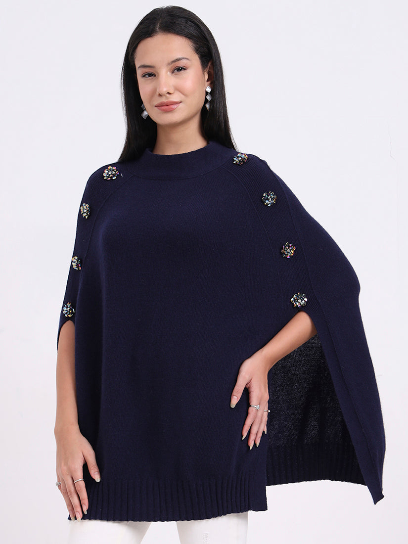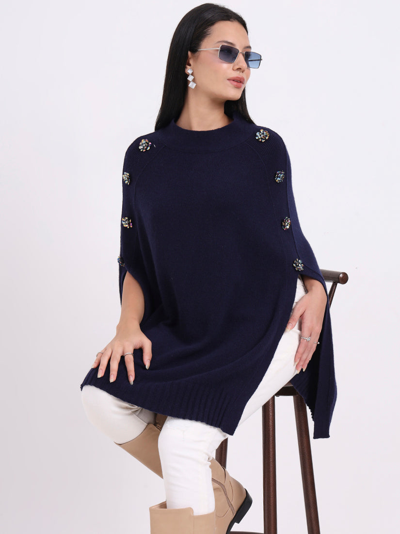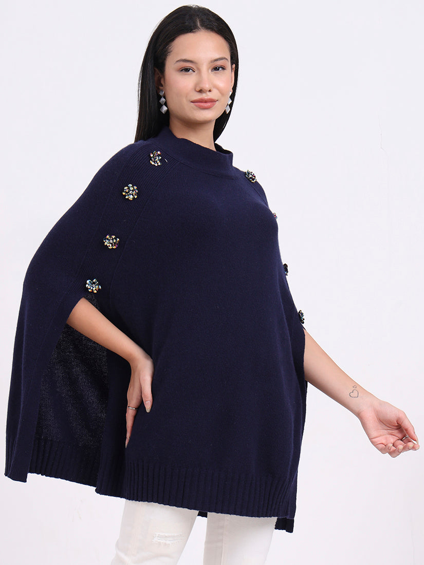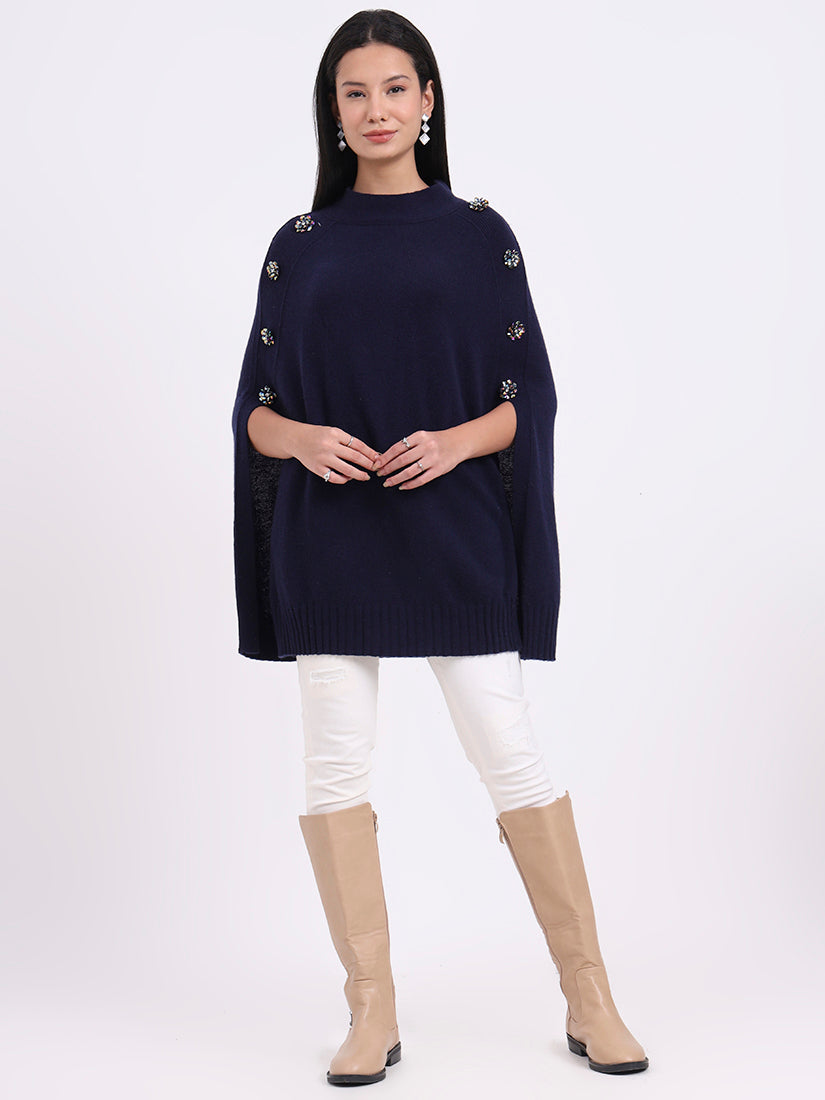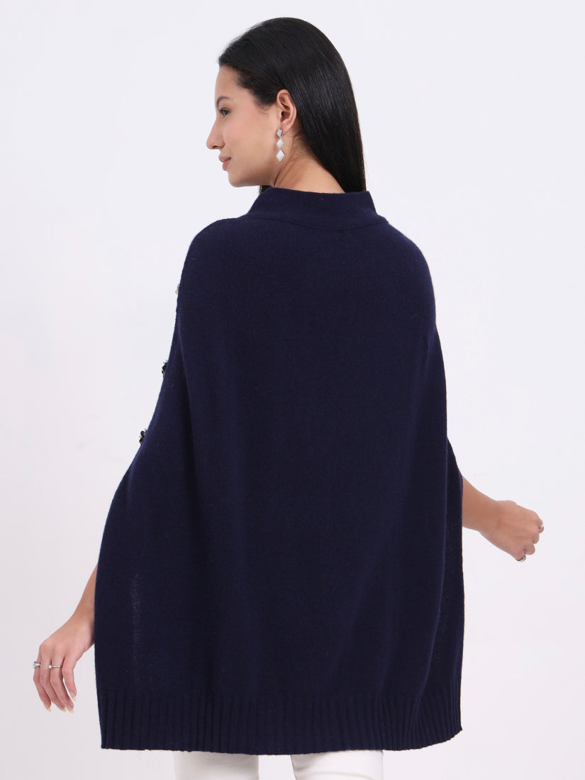 Draped in deep navy, the Midnight Crest Poncho in fine wool blends embodies quiet strength and sophistication. Button accents add a modern edge to its timeless silhouette.