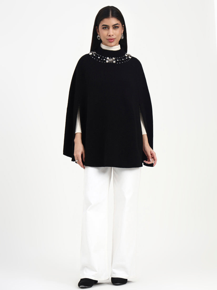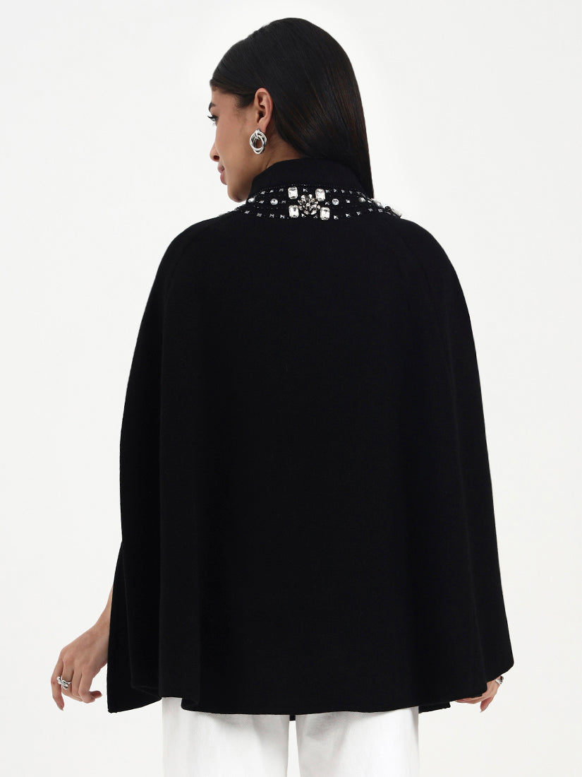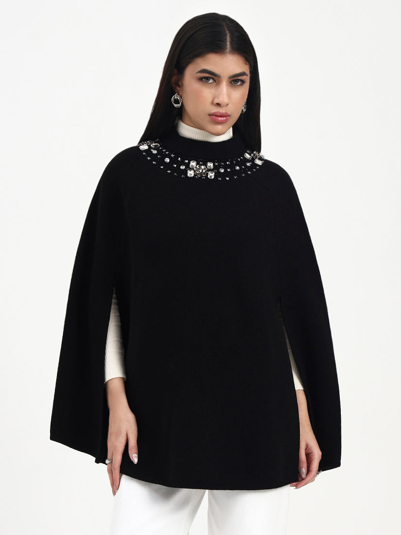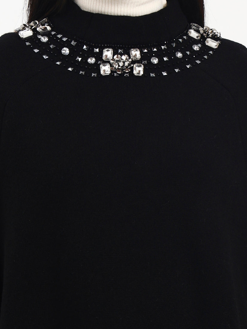 Deep black tones meet delicately placed crystal embellishments, creating a soft glow against the fabric. The crystals add dimension without overpowering the classic black base. The fluid drape and understated sparkle make it an effortless statement for modern winter dressing.