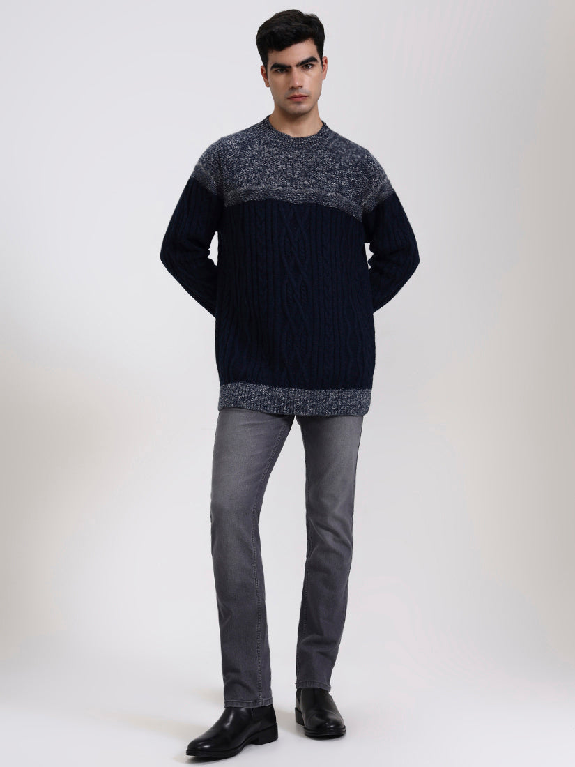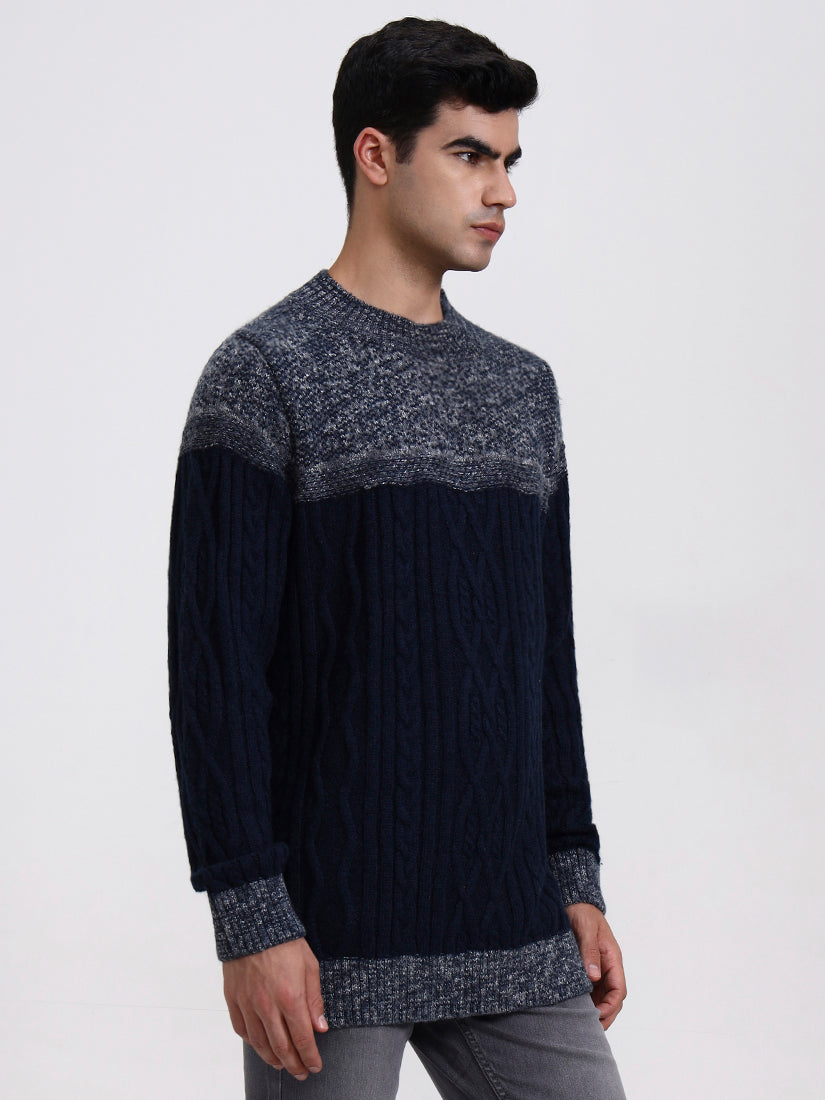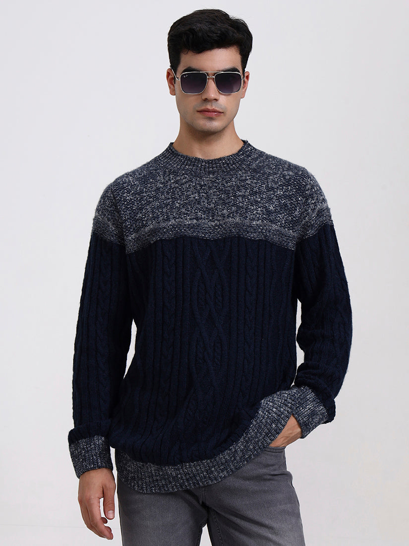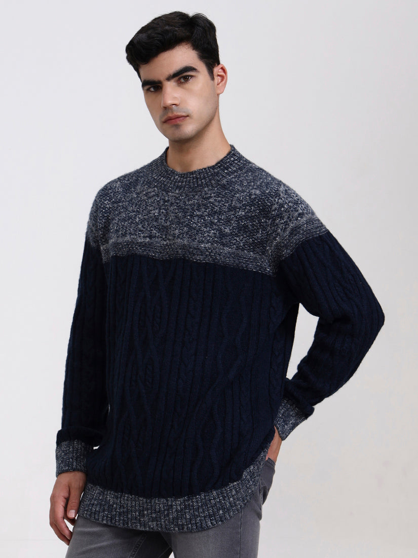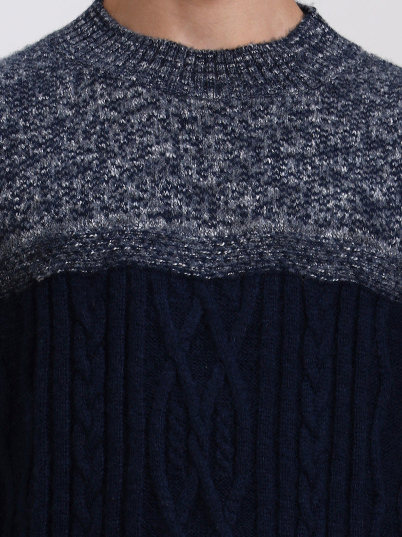 A deep navy pullover elevated with a textured cable-knit body and contrasting grey yoke. The sophisticated dual-tone design creates subtle depth while staying understated and modern, perfect for smart layering.
