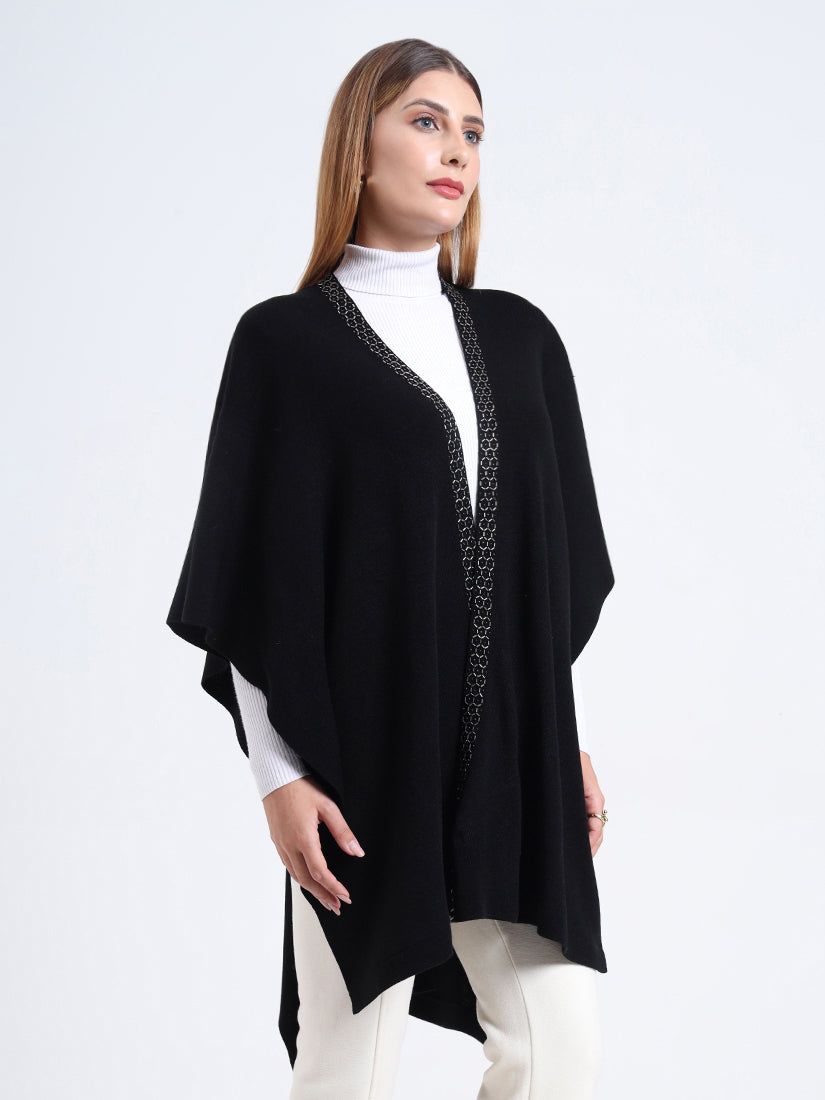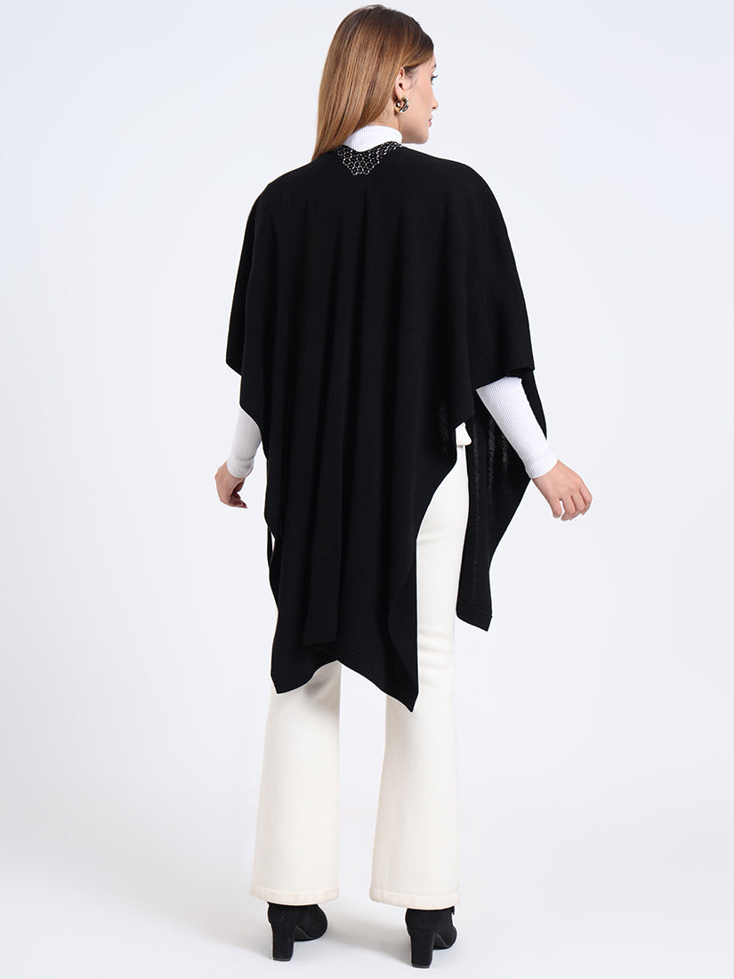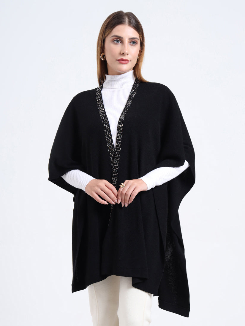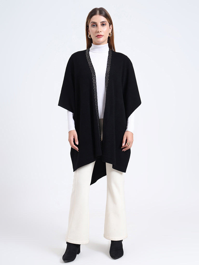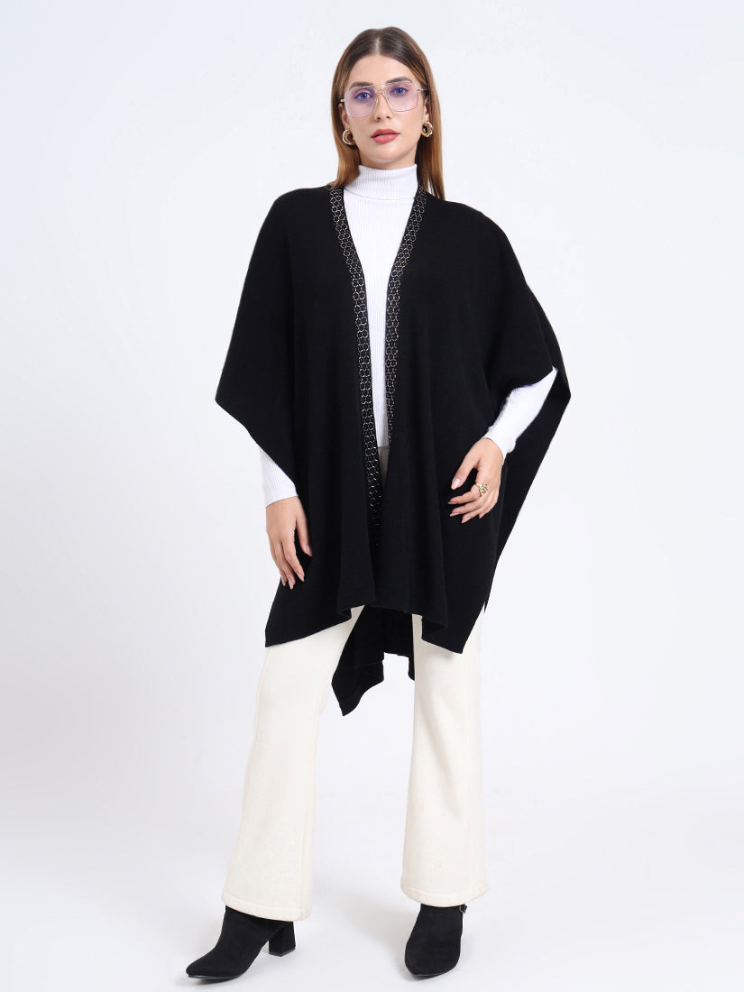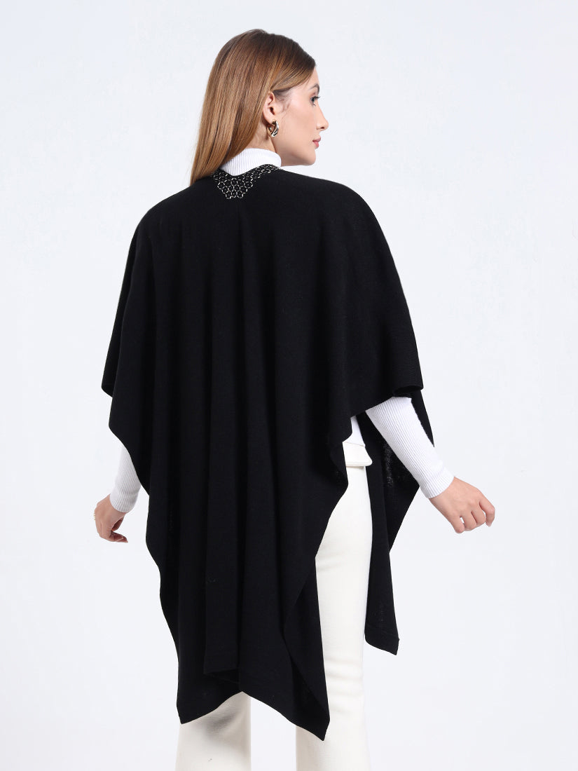 Crafted in a premium wool blends, the Midnight Hexa Embellished Cape features a sleek black body framed with geometric beadwork along the neckline, blending timeless warmth with modern sophistication.