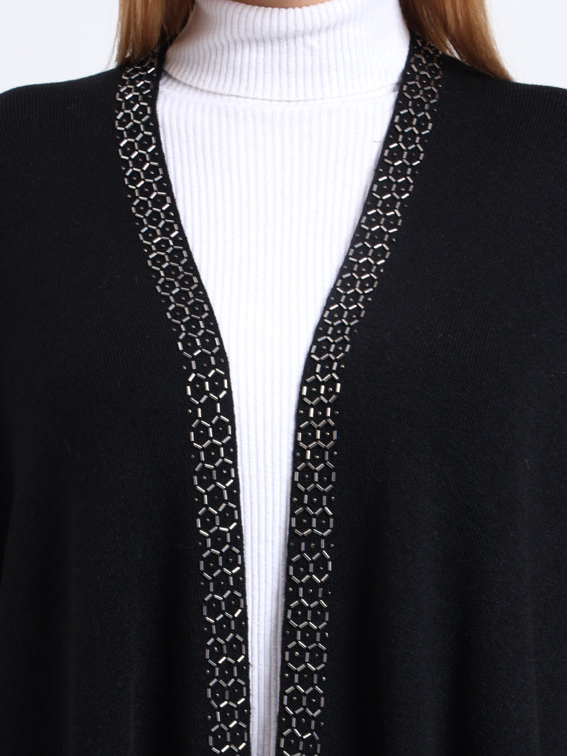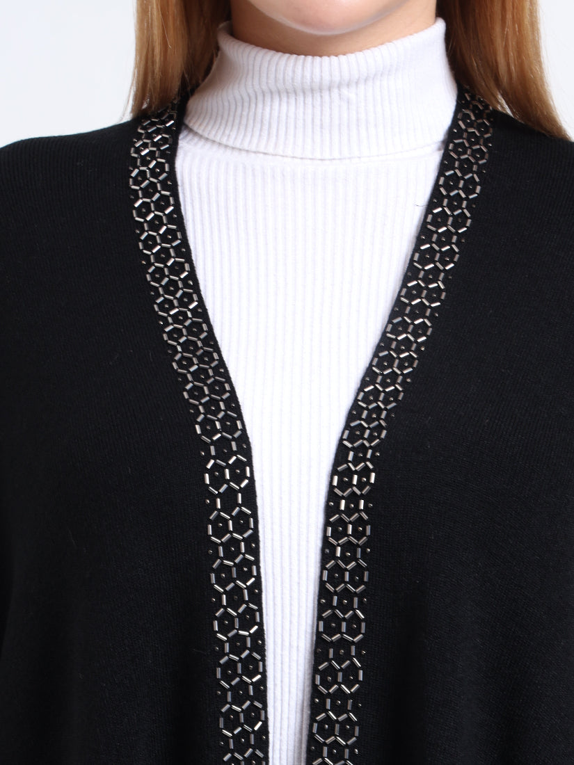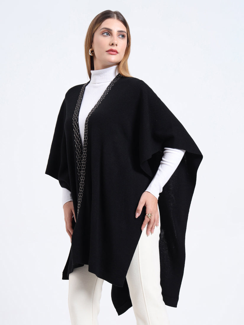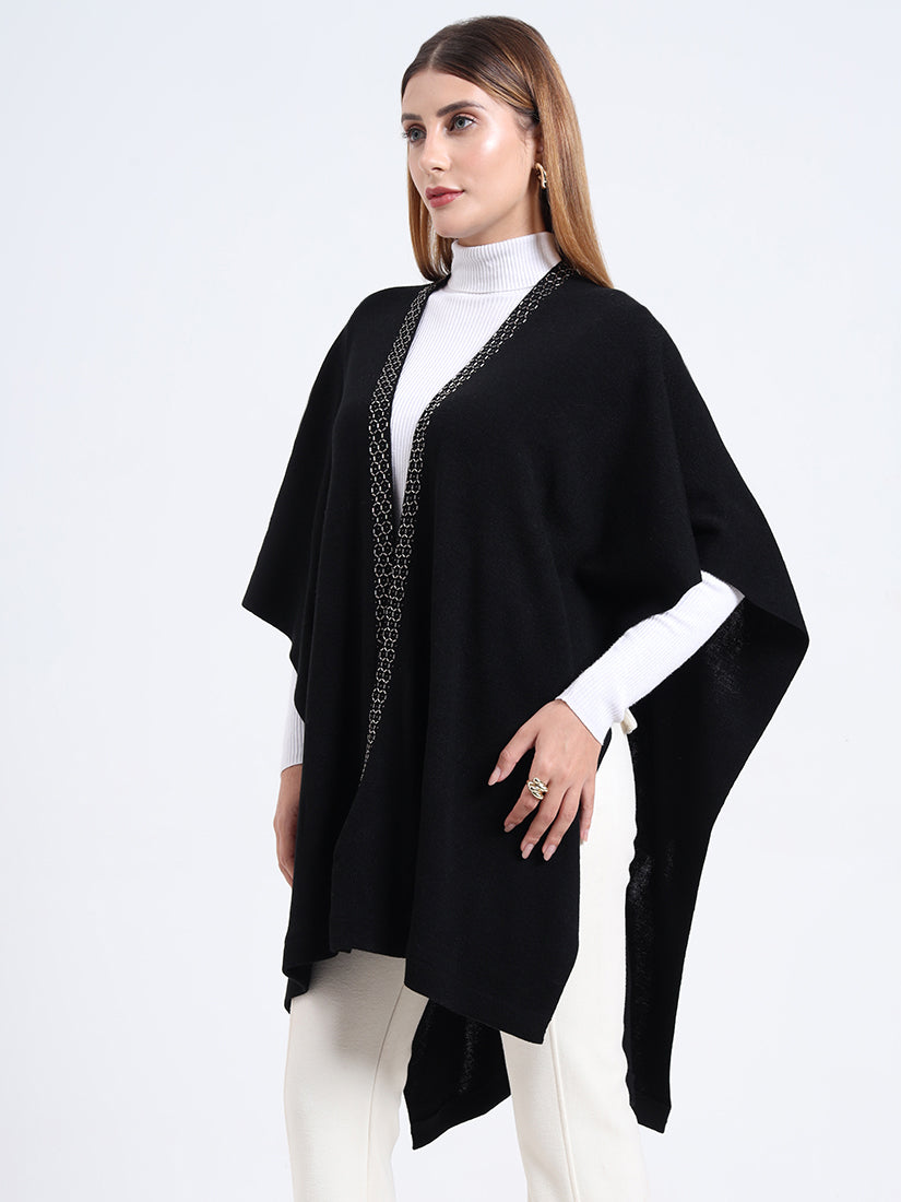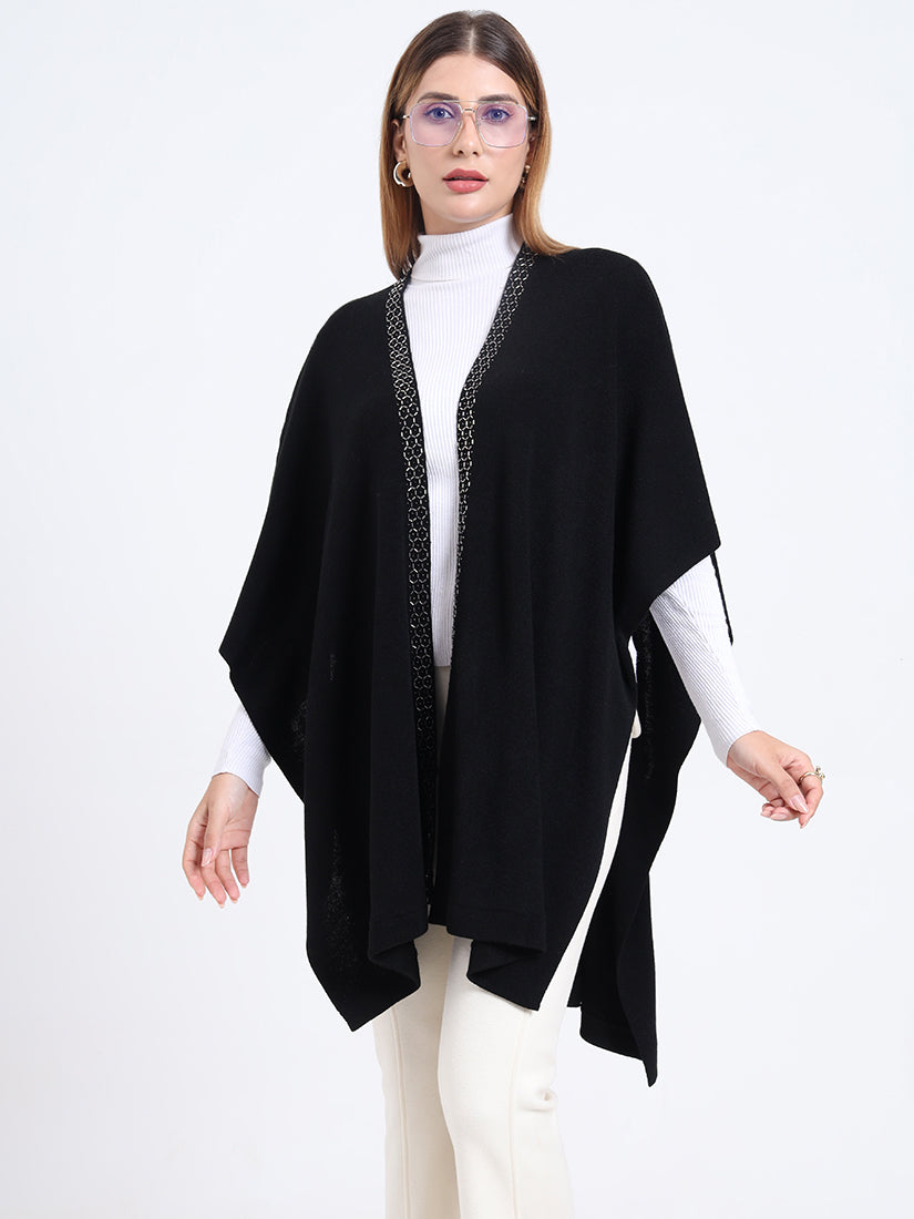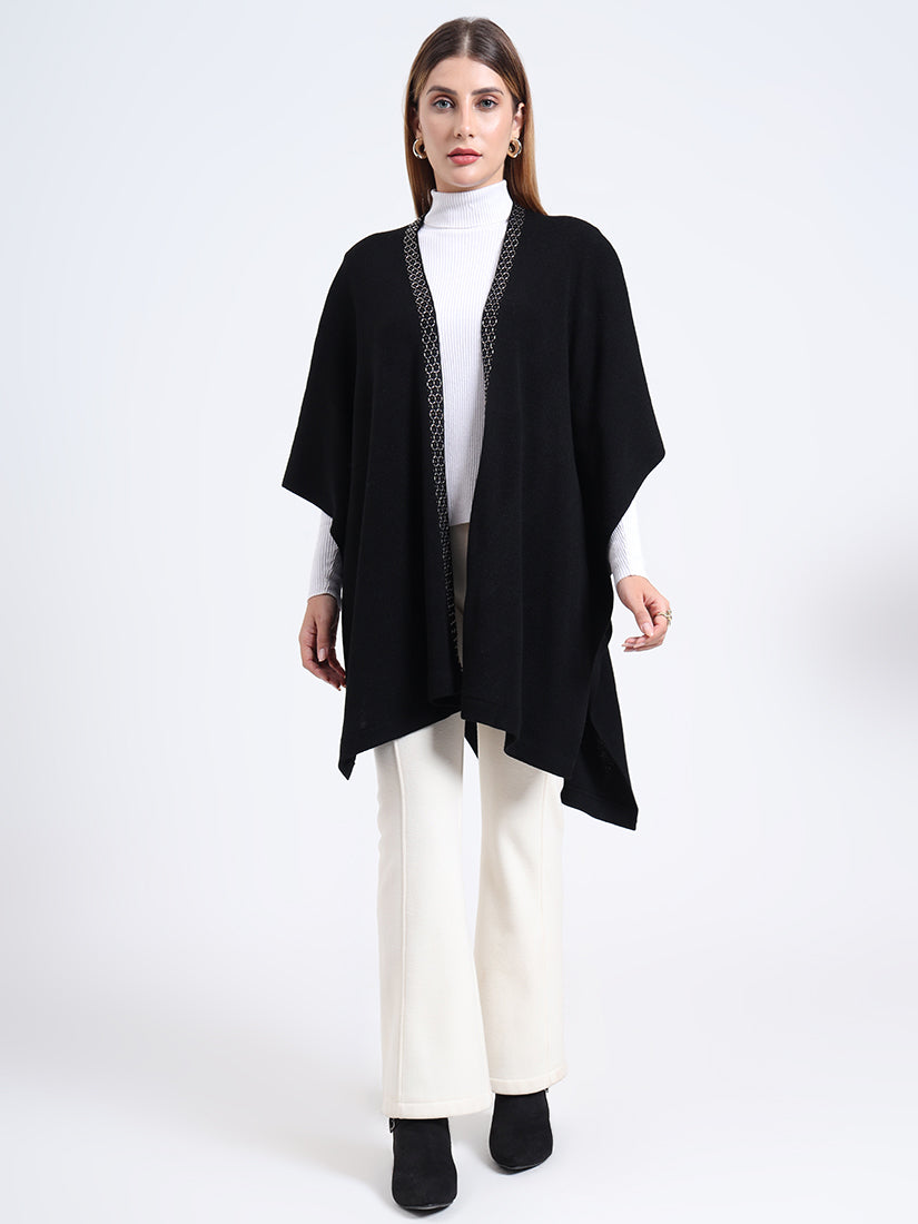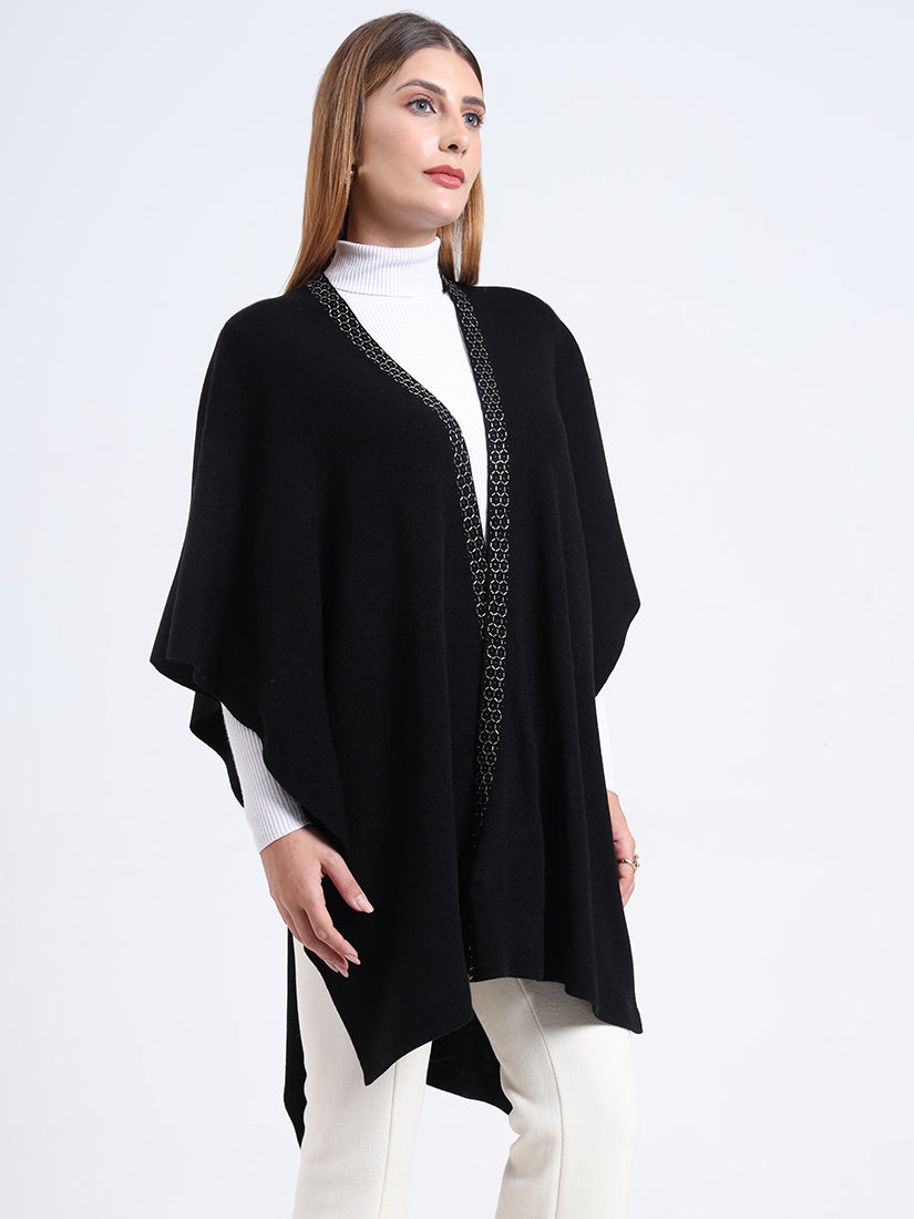 Crafted in a premium wool blends, the Midnight Hexa Embellished Cape features a sleek black body framed with geometric beadwork along the neckline, blending timeless warmth with modern sophistication.