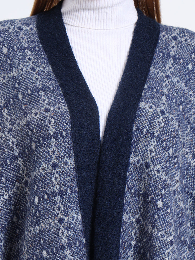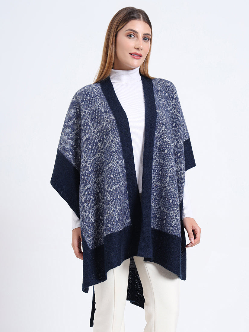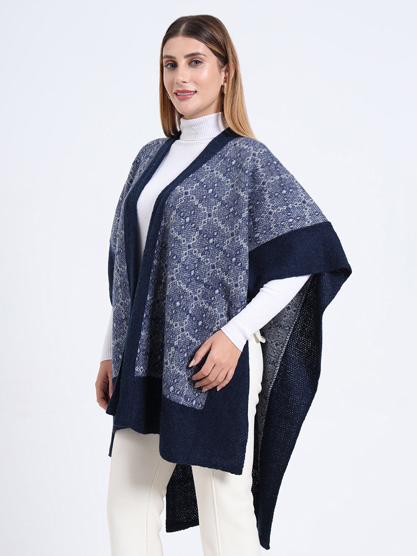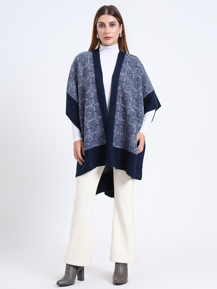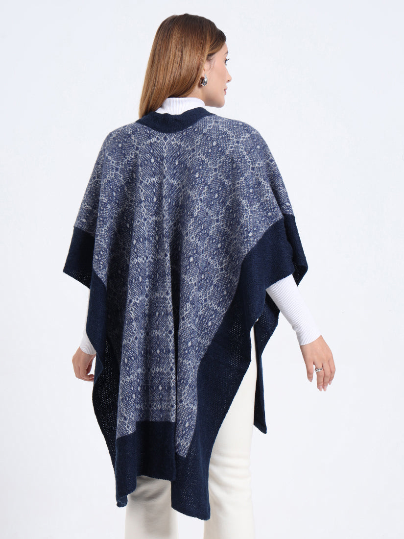 Crafted in a luxurious wool blend, the Midnight Lattice Cape features a deep navy body patterned with intricate lattice motifs in tonal blues. Soft yet refined, it offers timeless sophistication and versatile elegance for every occasion.