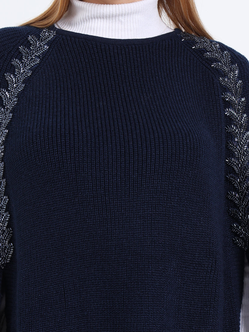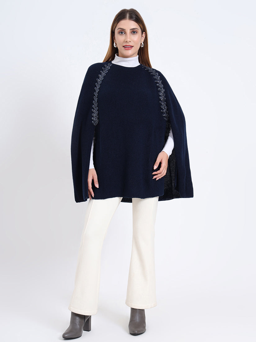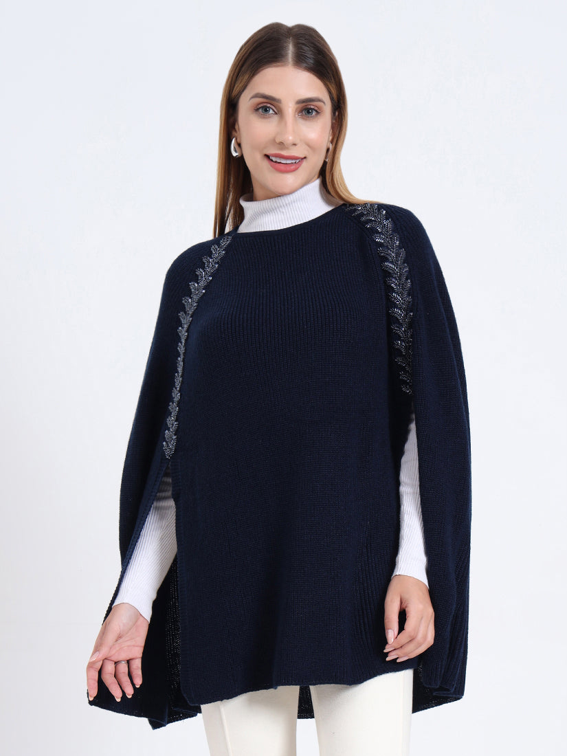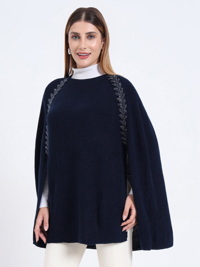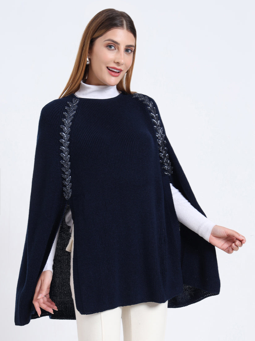 The Midnight Laurel Cape in navy combines sleek sophistication with intricate shoulder detailing. Elegant yet contemporary, it’s a statement layer that transitions seamlessly from day to evening.