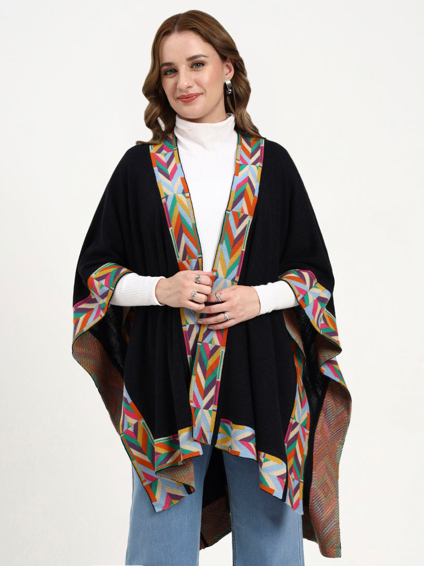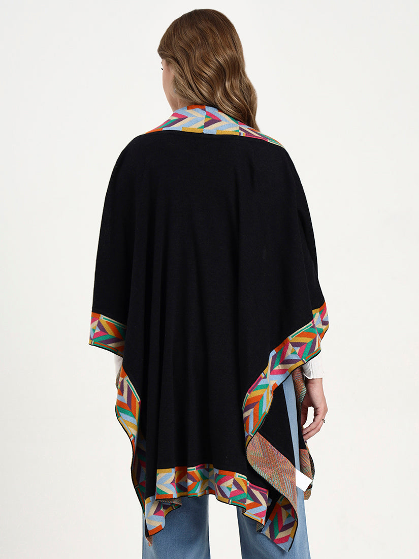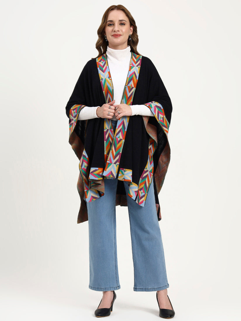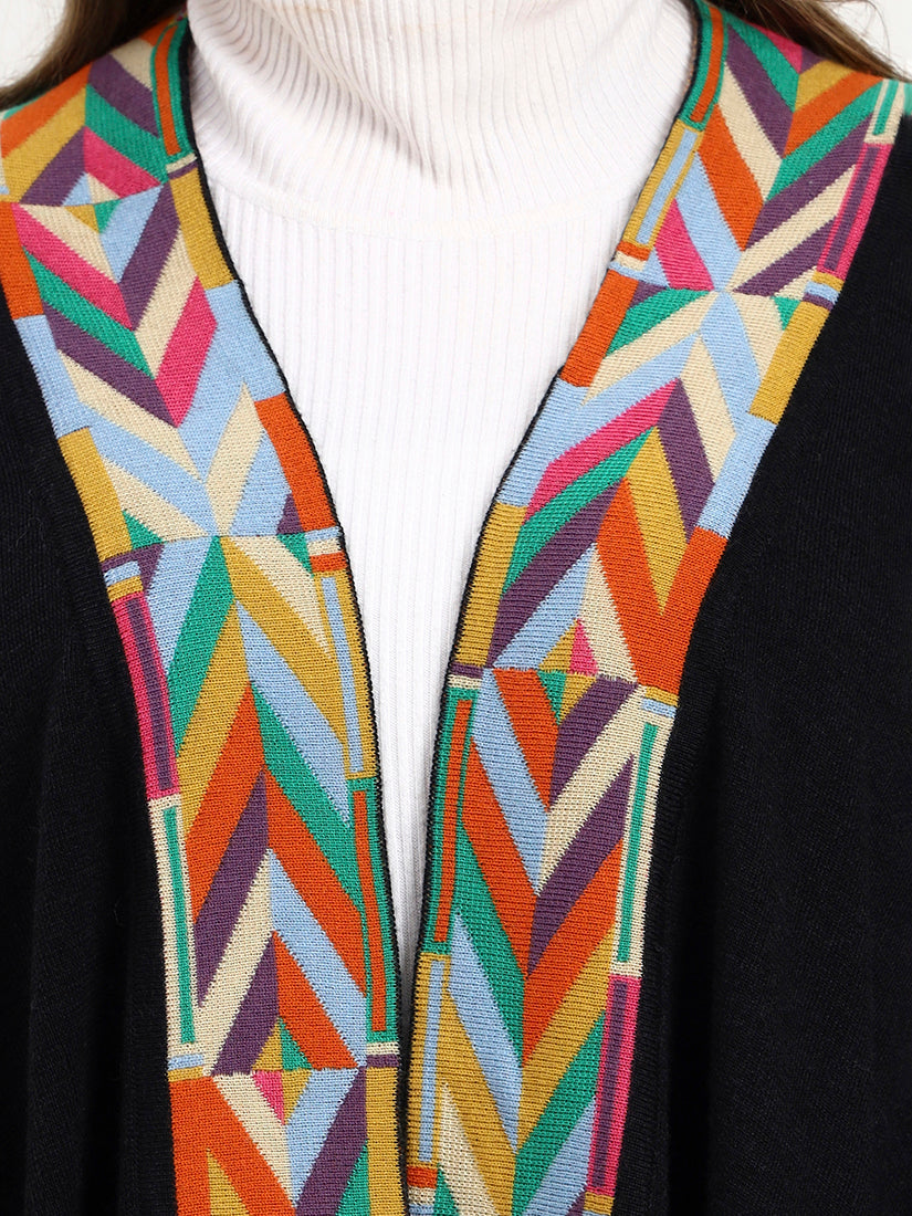 The deep black base sets the perfect canvas for a vibrant geometric border in multicolor hues. This version blends timeless elegance with playful artistry, ideal for elevating any ensemble with a touch of bold refinement.