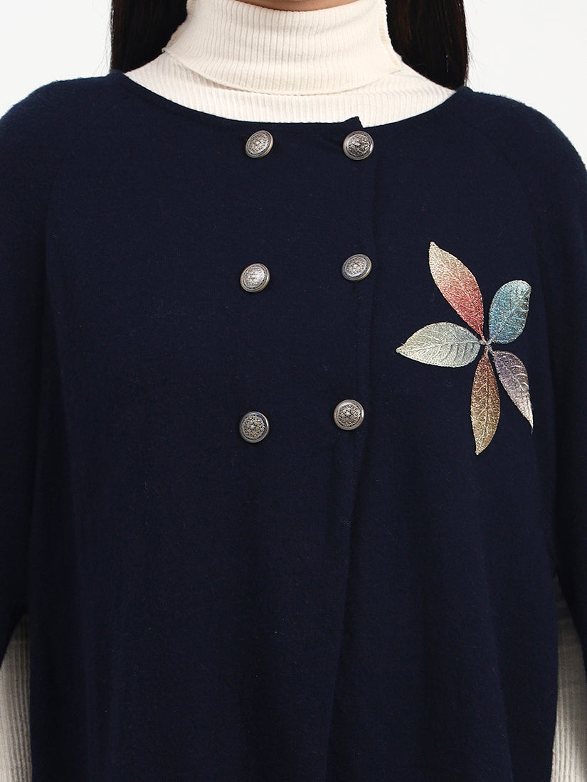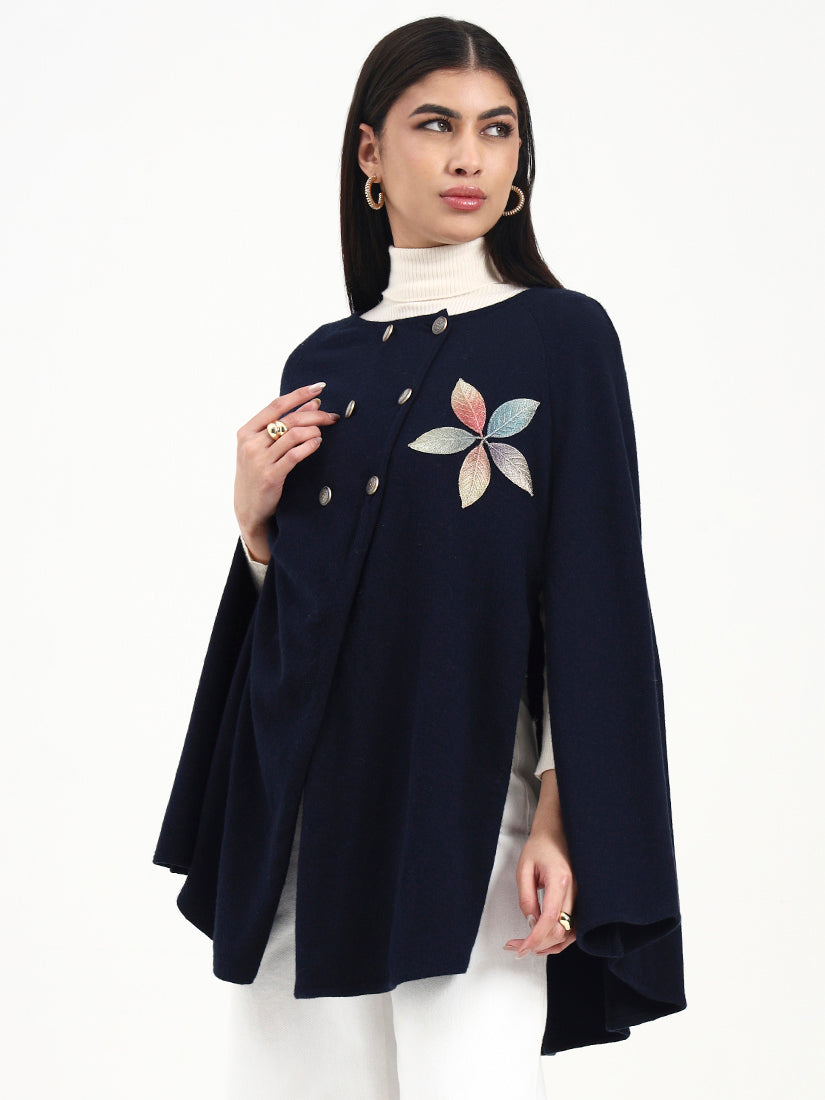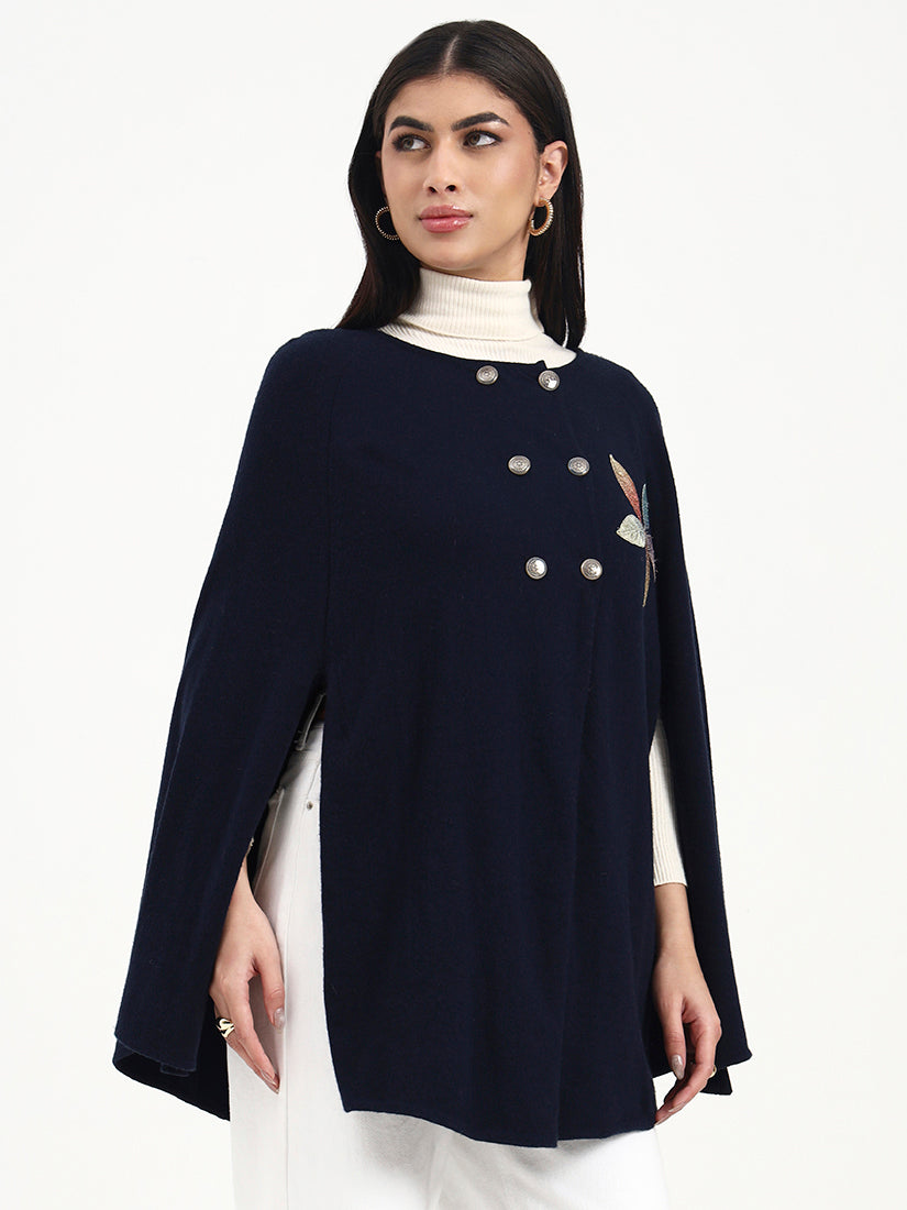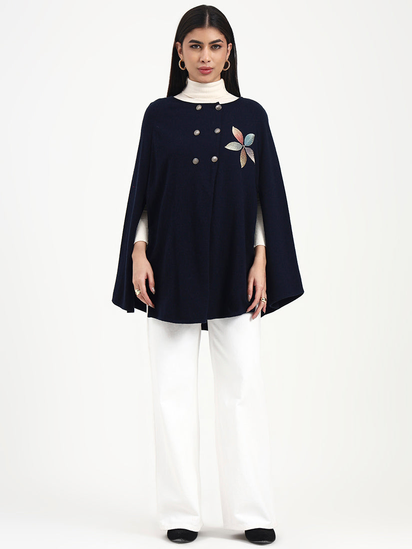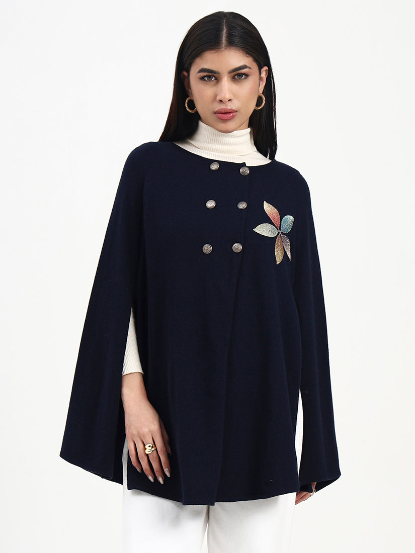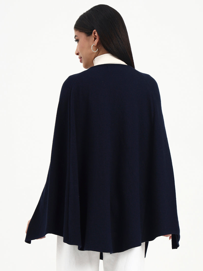 A timeless navy poncho defined by clean lines and soft structure, finished with understated embroidered detailing. Designed for elegant layering, it balances classic restraint with a modern, composed silhouette.