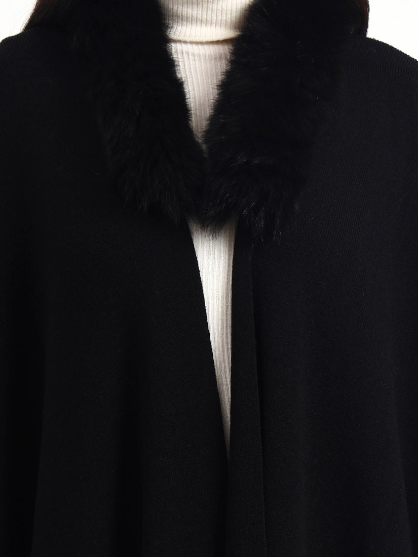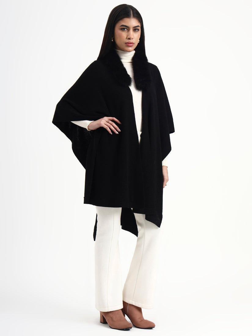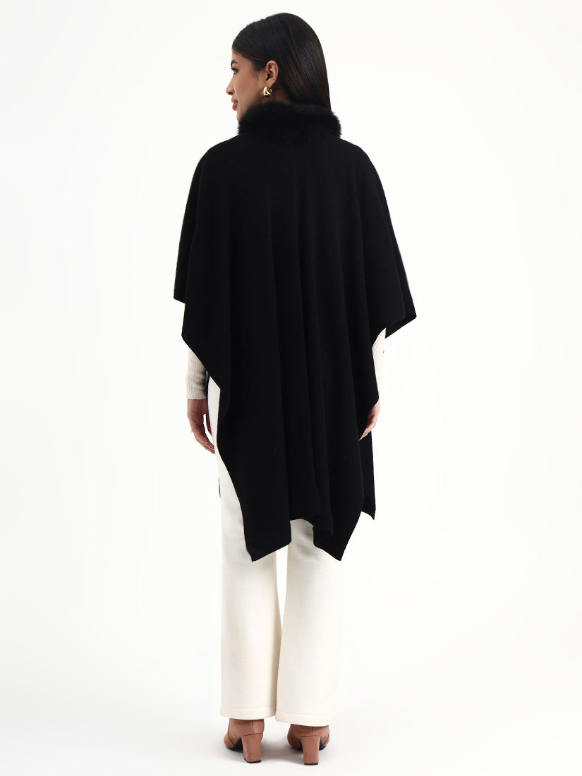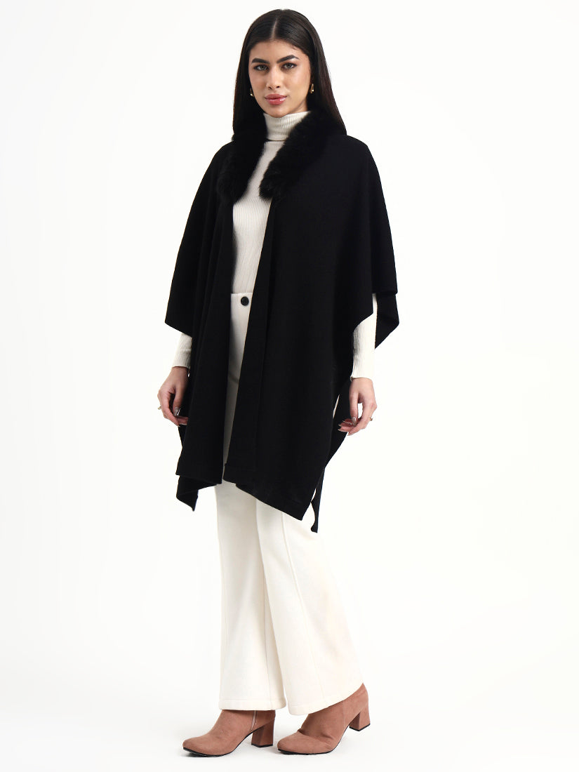 Deep black and endlessly timeless, this cape features a soft fur collar that adds depth and drama. Designed to fall effortlessly over the body, it delivers polished warmth with a distinctly modern attitude.