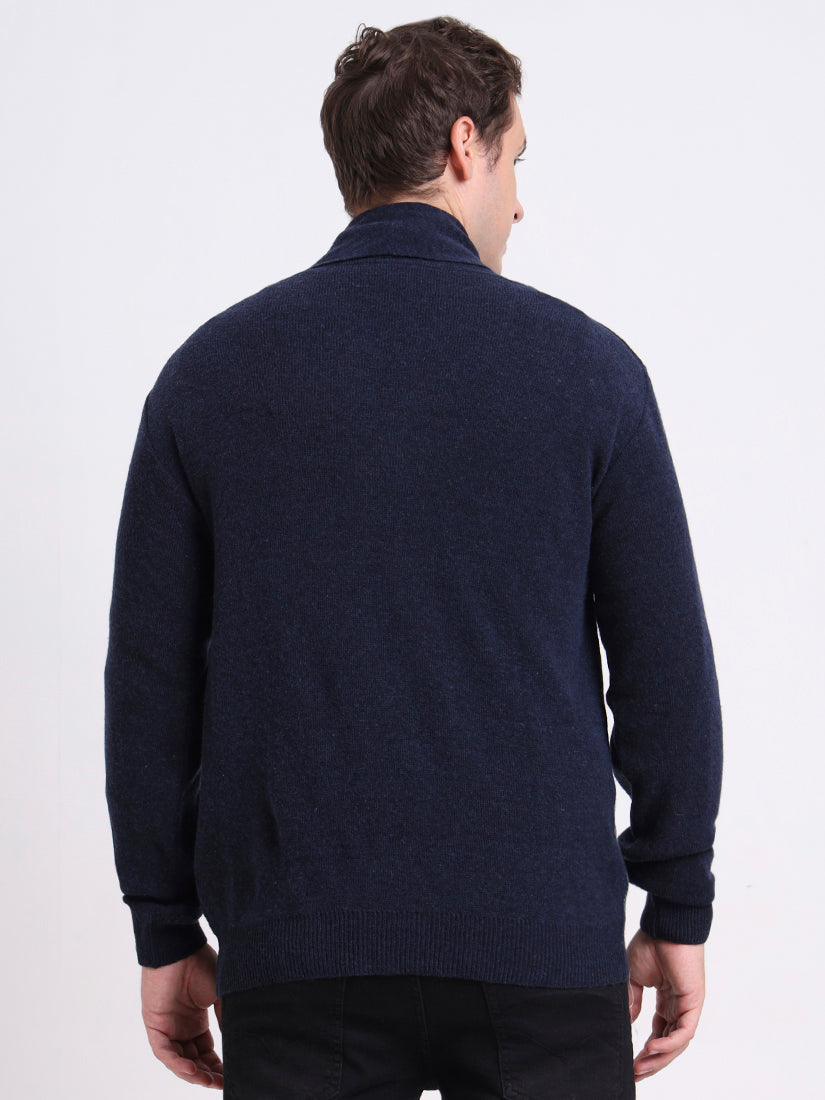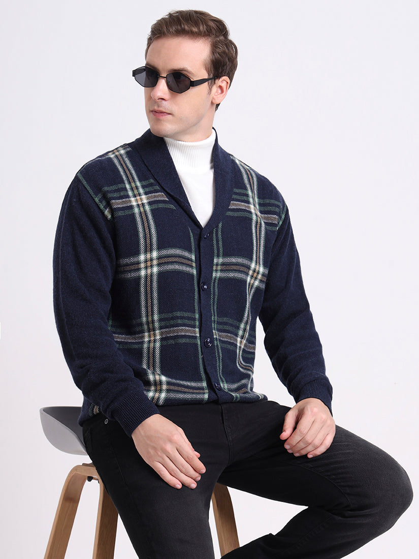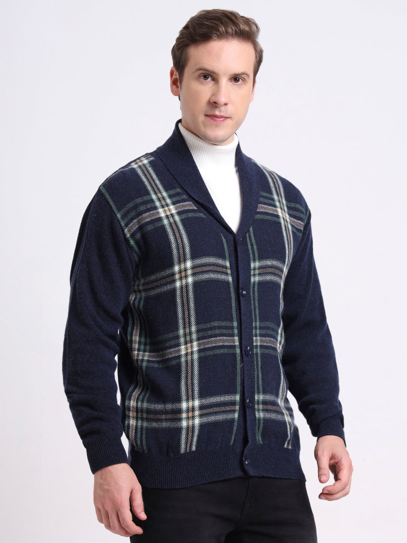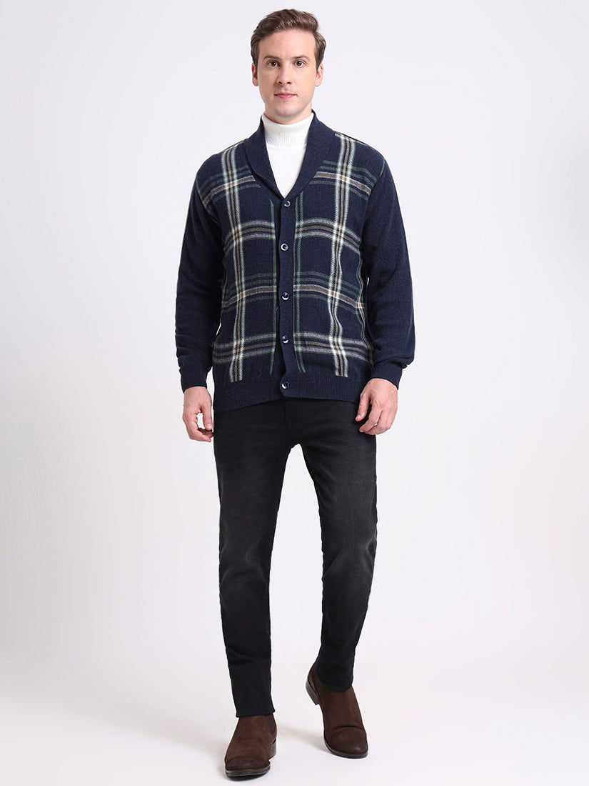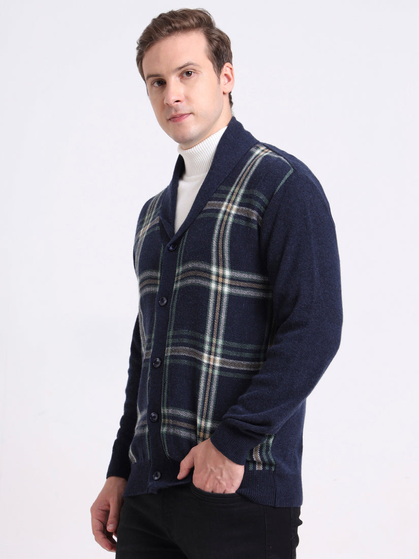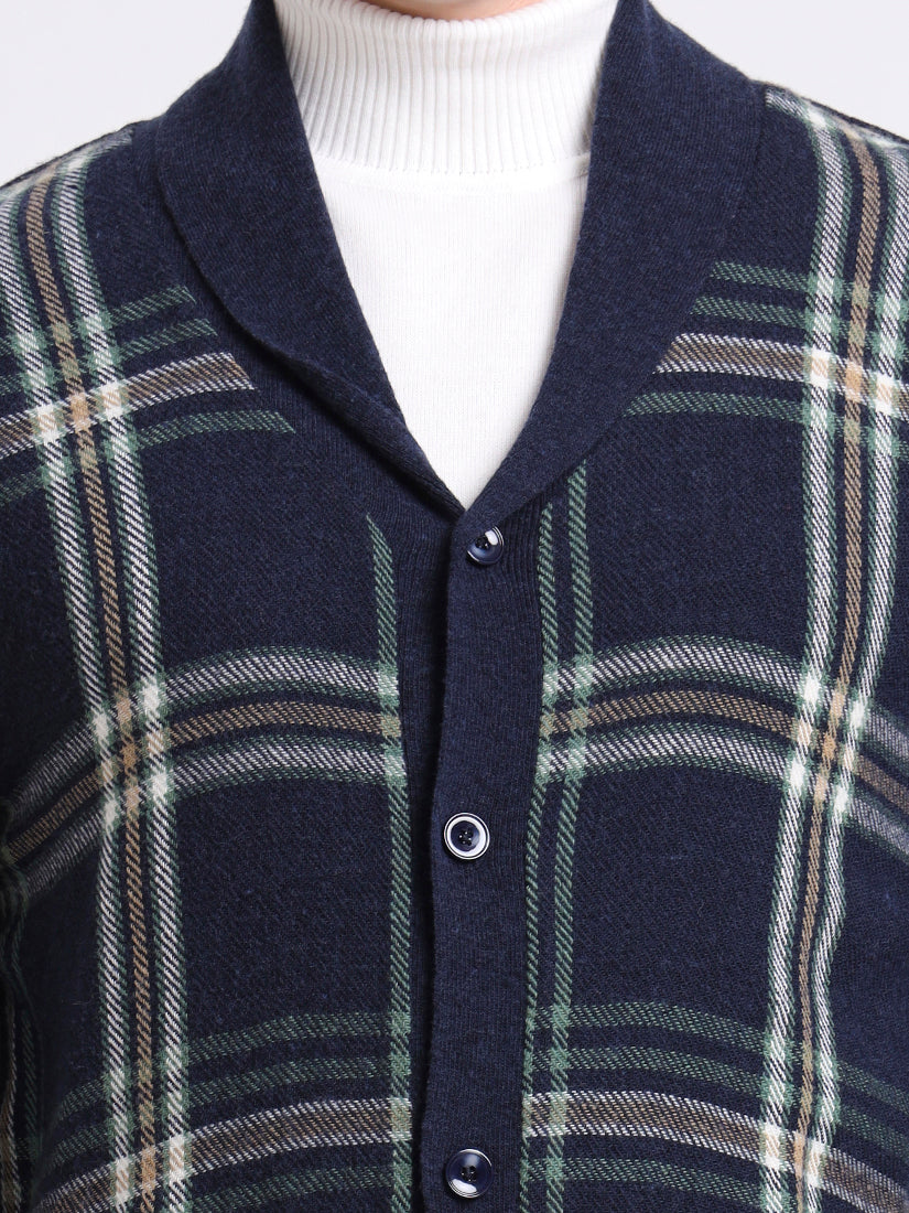 Rich navy accented by bold checks in cream and crimson, complemented by a classic button closure. This palette brings depth and sophistication, making it a timeless cardigan for modern wardrobes.